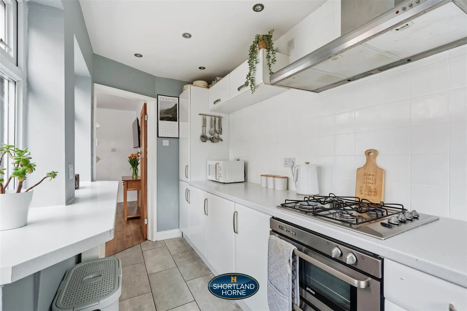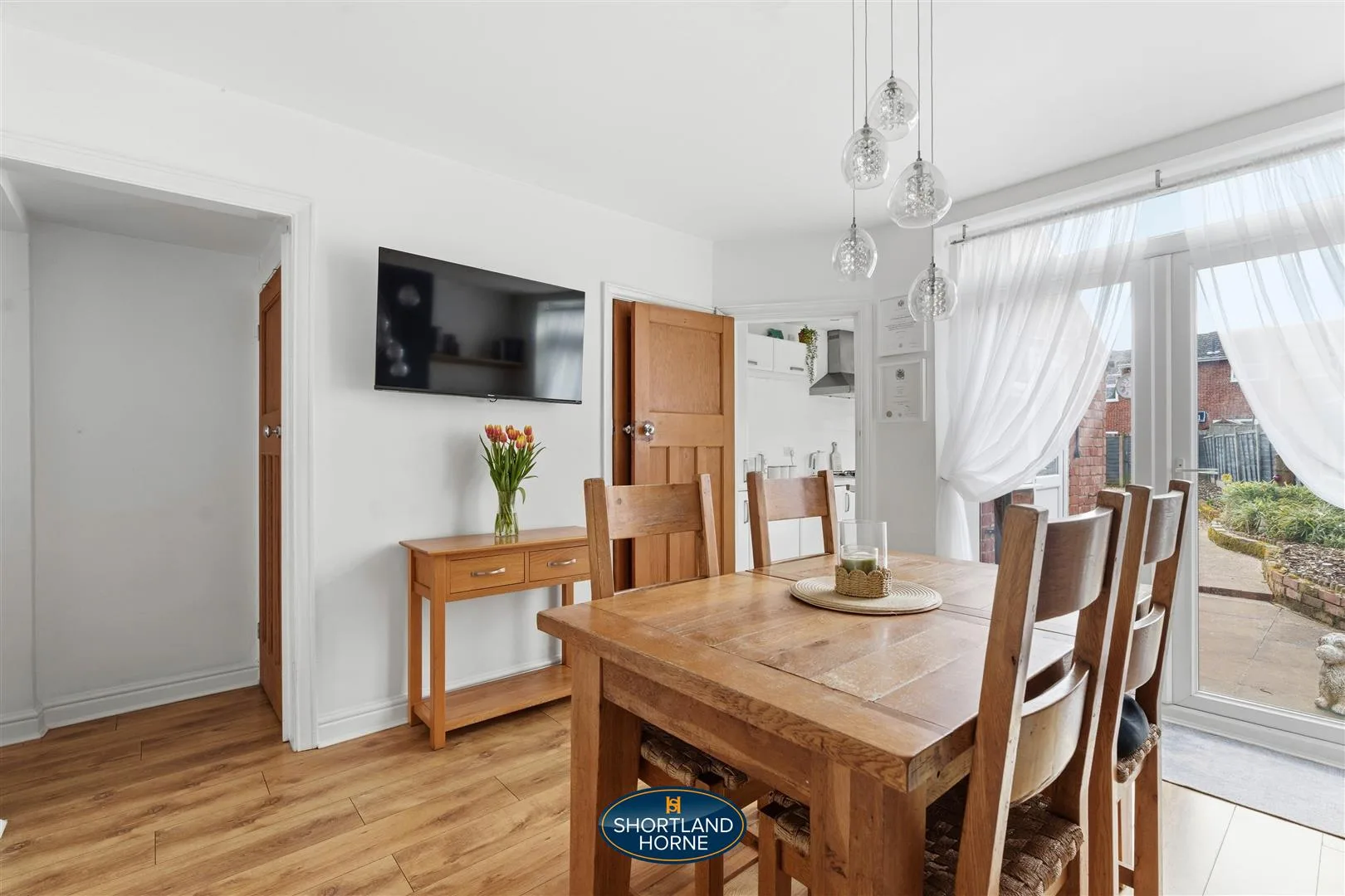 Next, the dining room opens up, bathed in sunlight streaming through French doors that perfectly frame the south-facing garden. This space naturally draws people together, flowing seamlessly into the kitchen where crisp white cabinets and generous work surfaces make cooking effortless. The built-in oven, hob, fridge and freezer are ready for everything from weekday breakfasts to weekend feasts, making entertaining a joy rather than a chore.