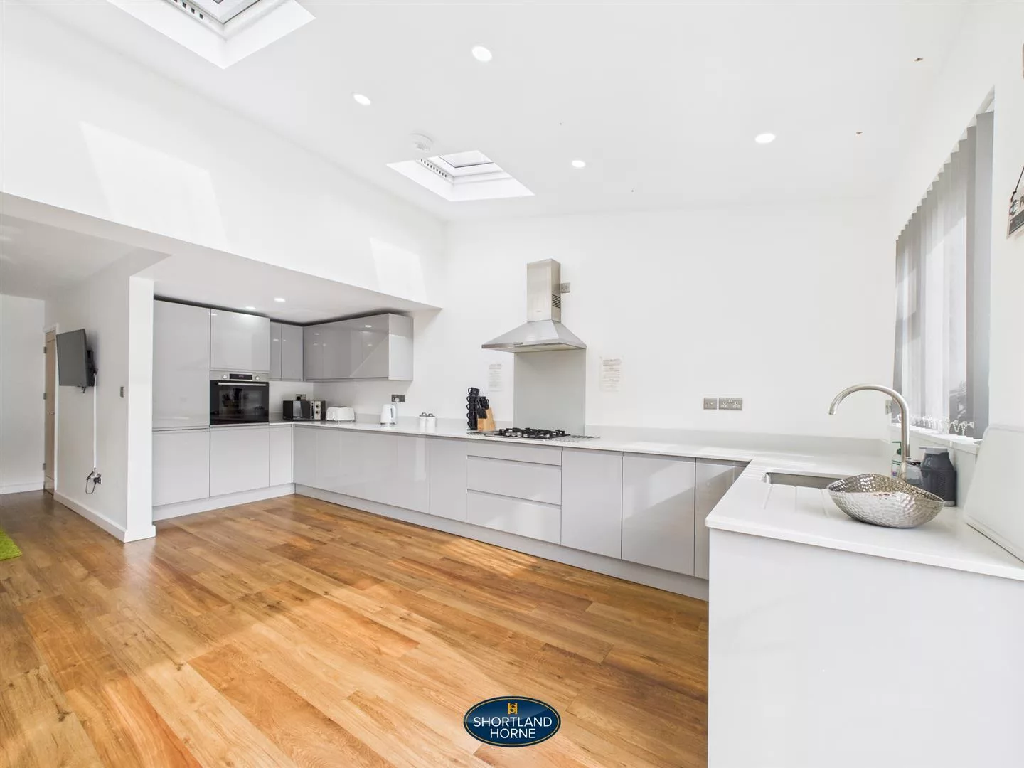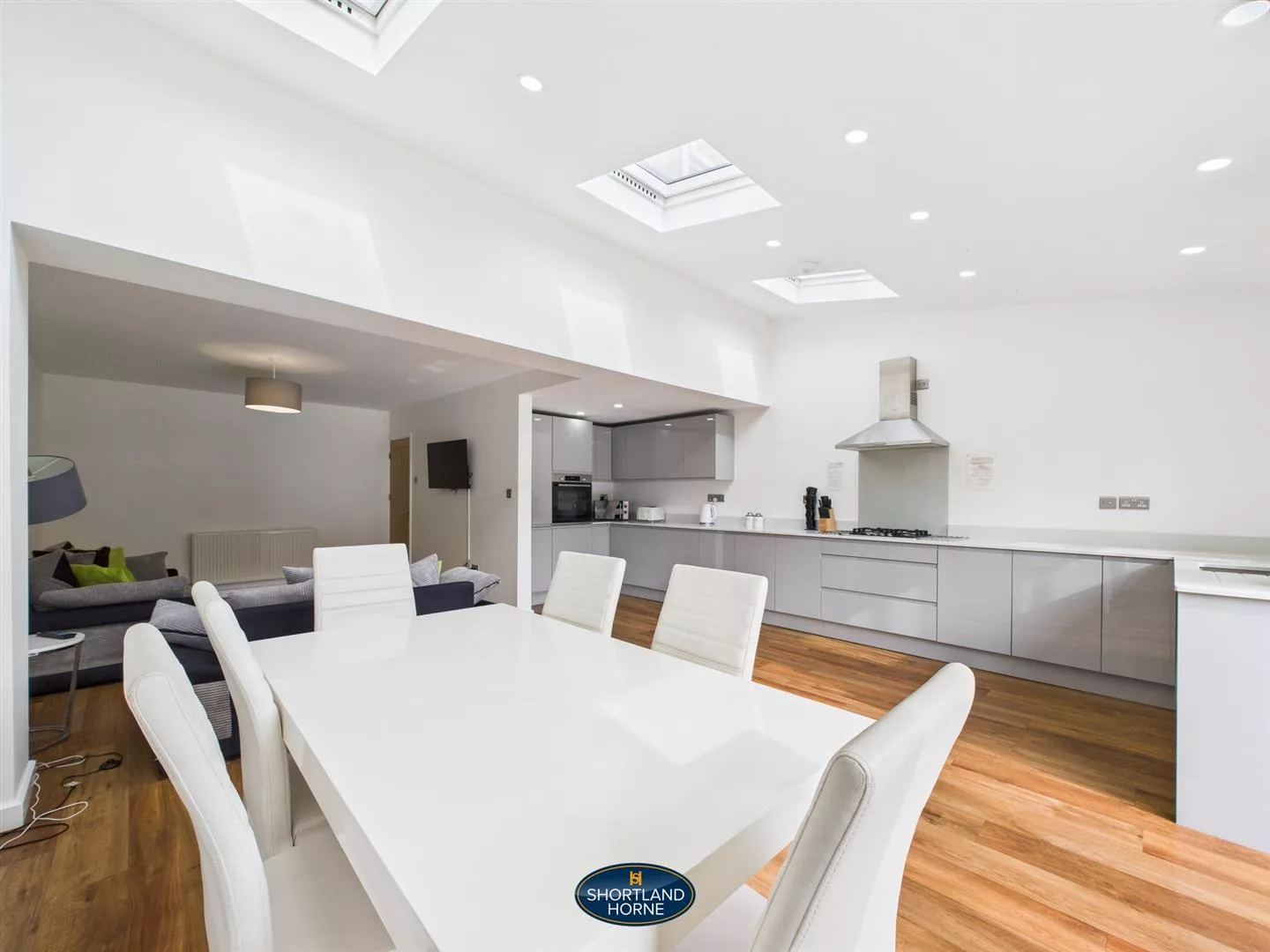 The property offers well presented and spacious accommodation throughout. Upon entering, you are welcomed by a generous entrance hallway which leads to a modern ground floor shower room and a separate utility room with space and plumbing for a washing machine. The heart of the home is a stunning open plan lounge and kitchen area. The kitchen is fitted with high quality appliances including an integrated fridge freezer, dishwasher, four ring gas hob, oven, and an inset sink with mixer tap. Large sliding doors at the rear of the dining area open out onto the rear garden.