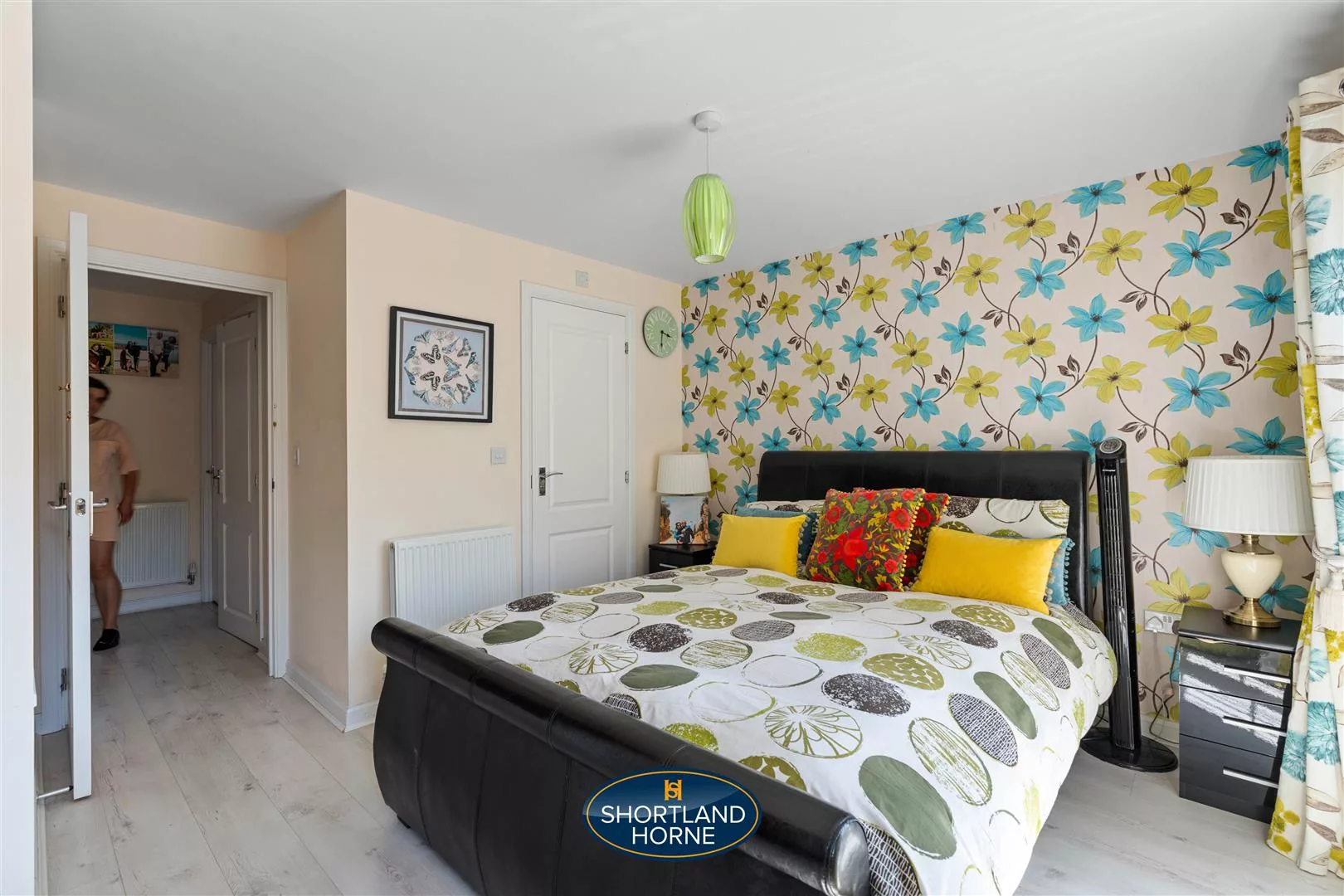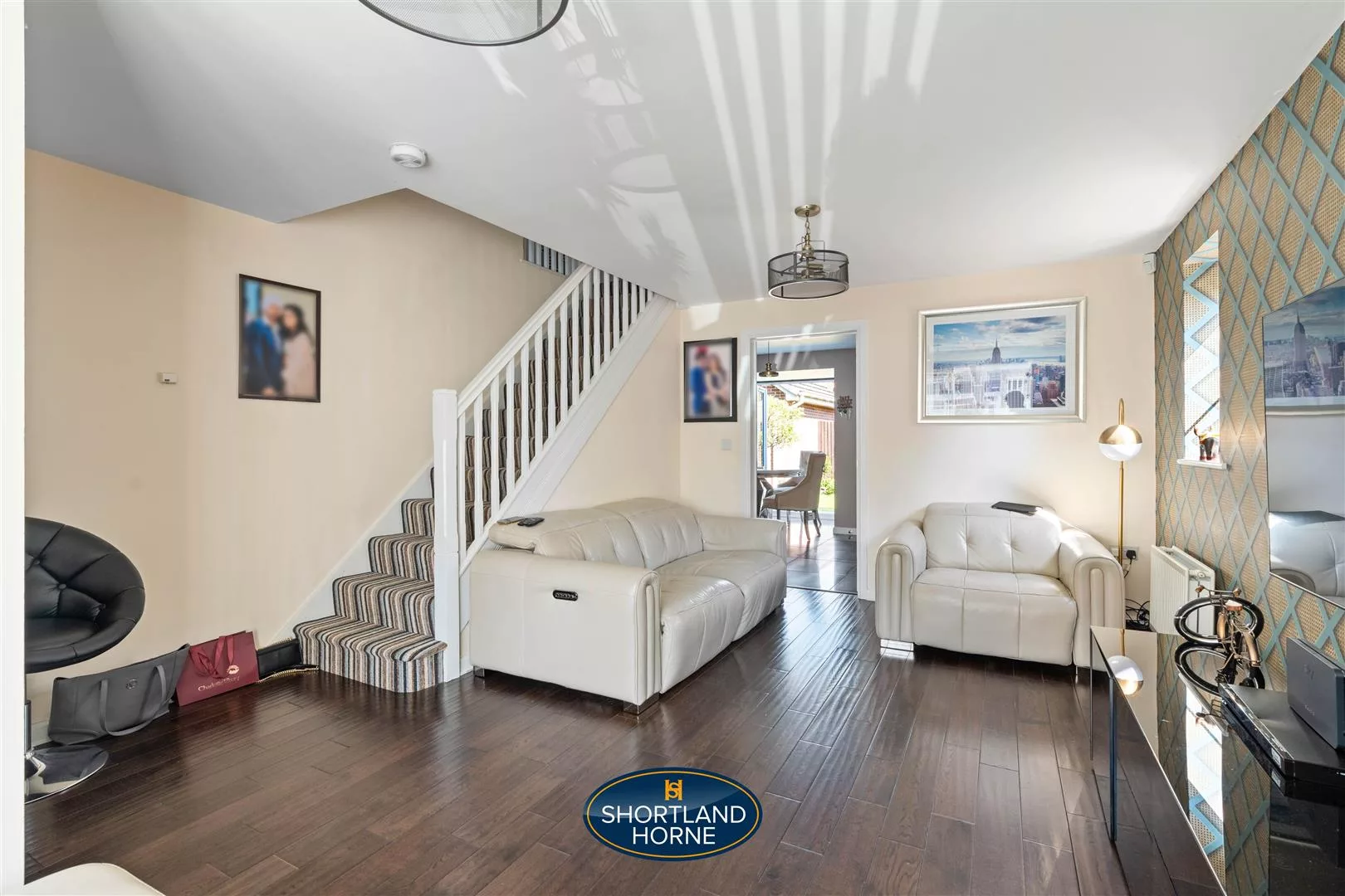 tep inside and immediately feel the warm, homely atmosphere that runs throughout the property. The entrance hall, complete with practical storage, flows effortlessly into the heart of the home—a spacious lounge with glossy laminate flooring that gleams beneath soft natural light. It's a perfect setting for relaxed evenings or catching up with loved ones, all wrapped in a soothing neutral palette with tasteful wallpapered feature walls that add a dash of personality.