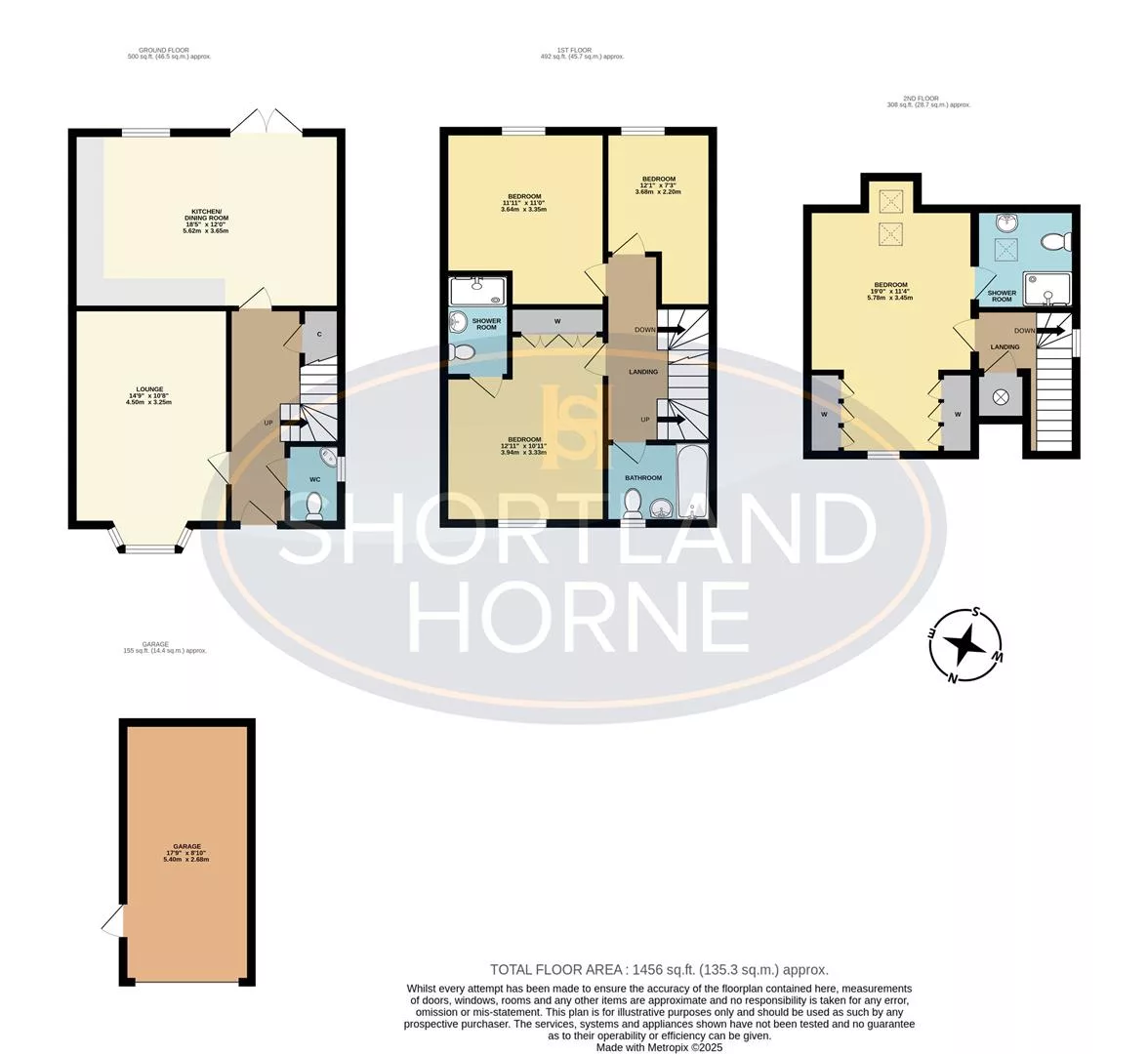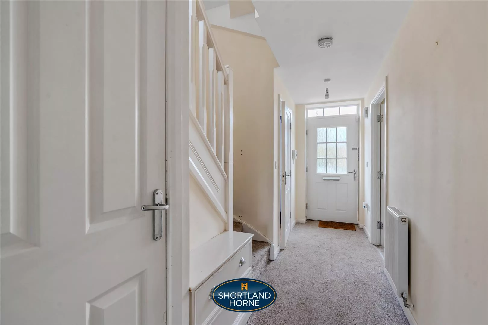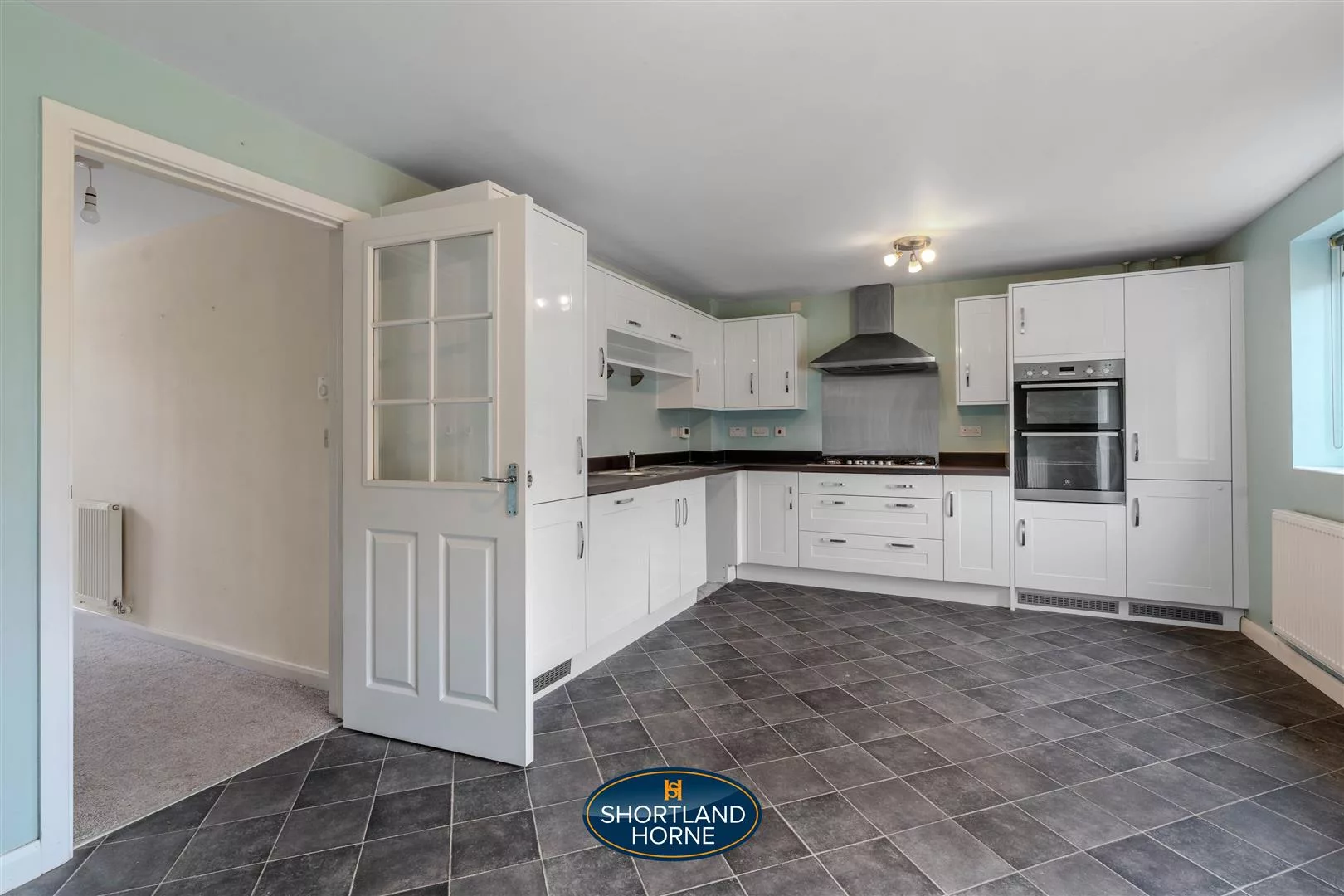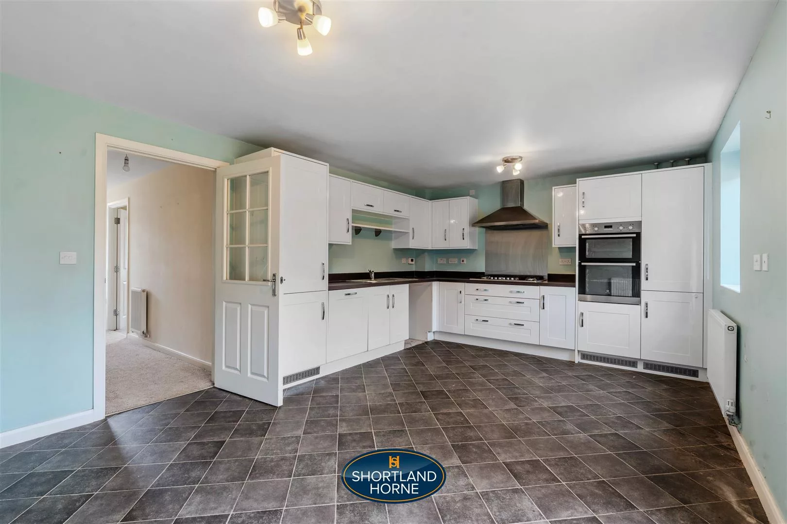 Step inside to discover a bright and airy hallway, where under-stairs storage keeps everyday clutter out of sight and the staircase rises elegantly to the upper floors. The lounge is filled with natural light from a large bay window, its soft cream walls and carpet creating a calm, inviting space to unwind, entertain, or enjoy cosy evenings. The heart of the home is the stylish kitchen and dining area, where crisp white shaker-style units are complemented by a five-ring gas hob, integrated oven, fridge freezer, and dishwasher. French doors in the dining area open directly onto the south-facing rear garden, where a sunlit patio gives way to a gently curving lawn that wraps around the detached garage, offering a perfect setting for family gatherings, children’s play, or peaceful outdoor moments.