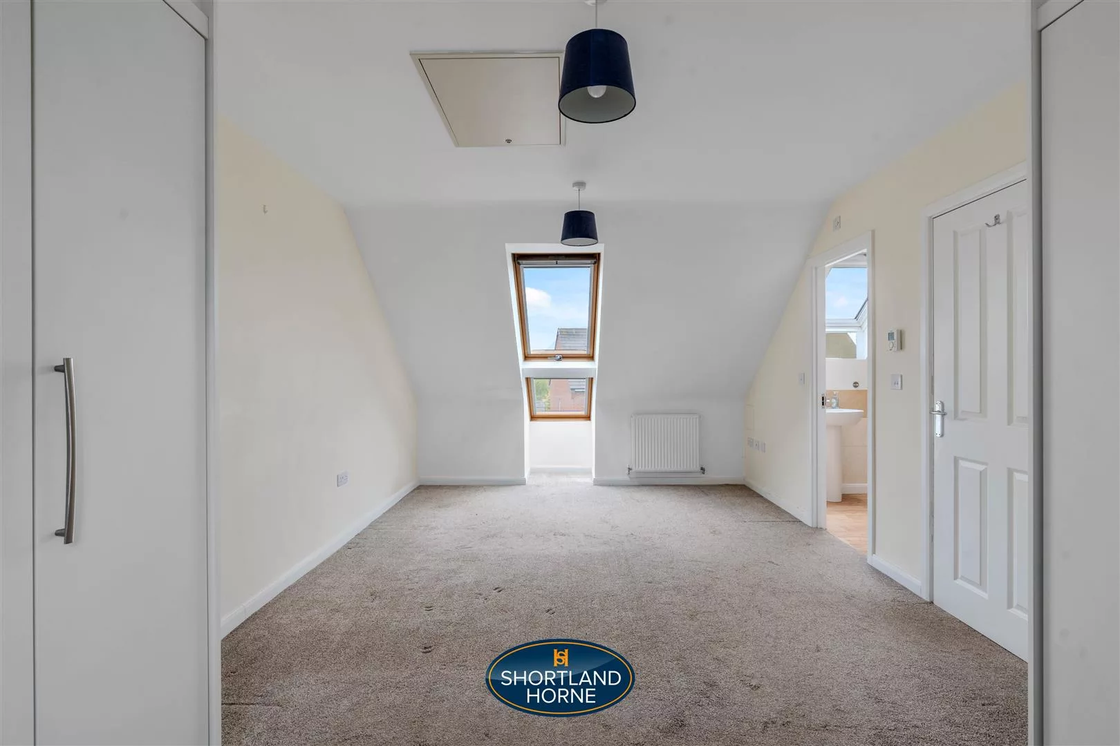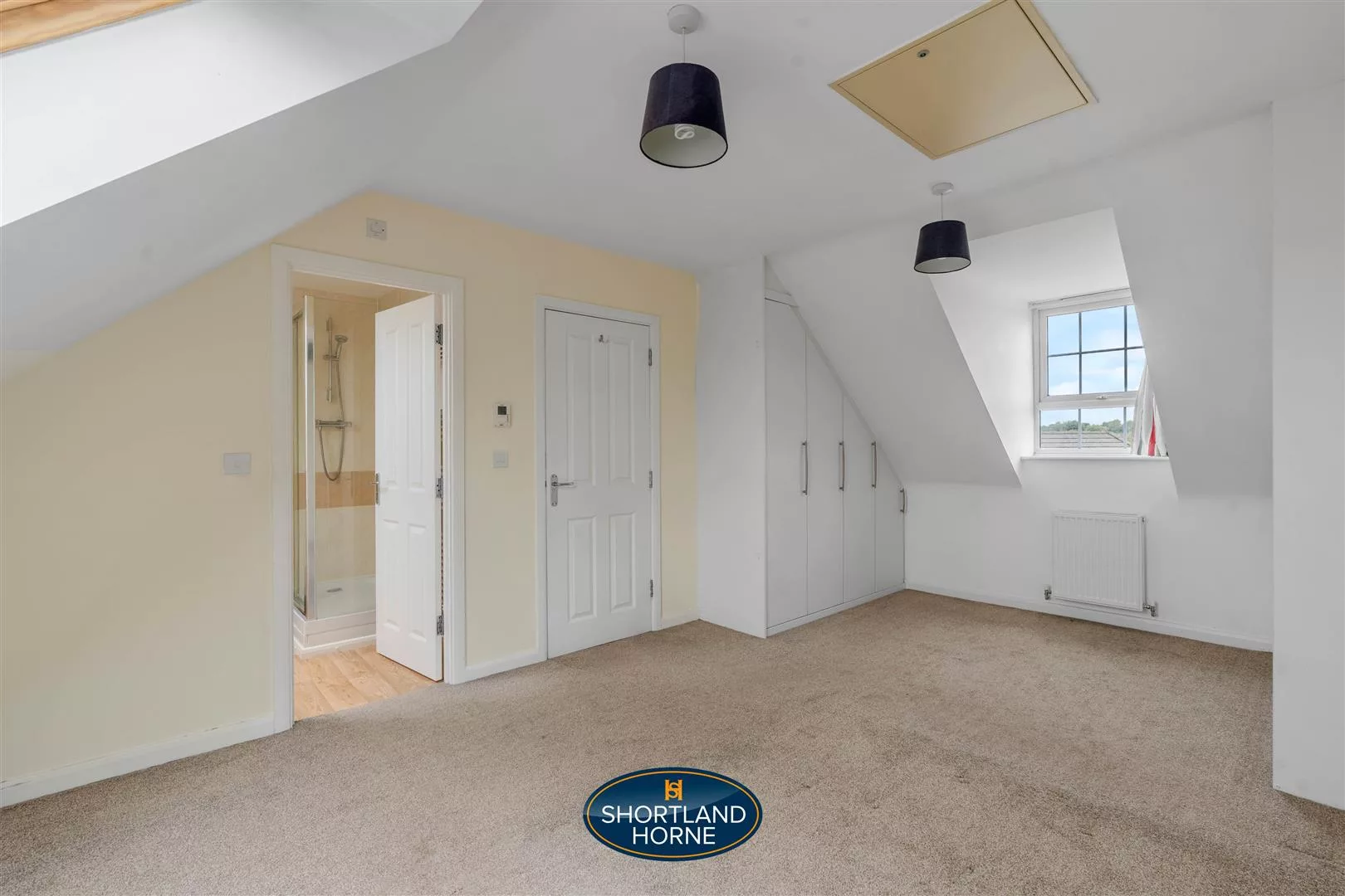 On the third floor, the master suite is a serene escape, flooded with light from two skylights and a dormer window. It features two built-in wardrobes and a spacious en-suite shower room, providing a private haven at the end of a busy day. Neutral decor throughout allows the next owners to move in with ease and immediately make the home their own.