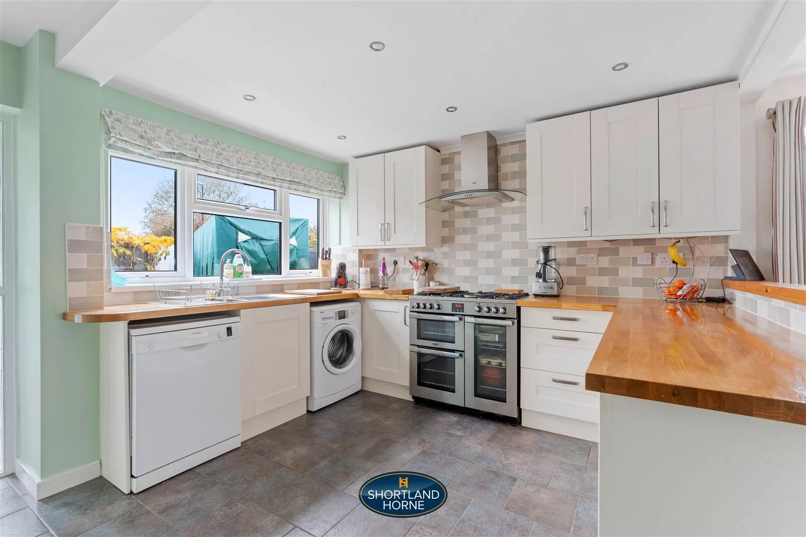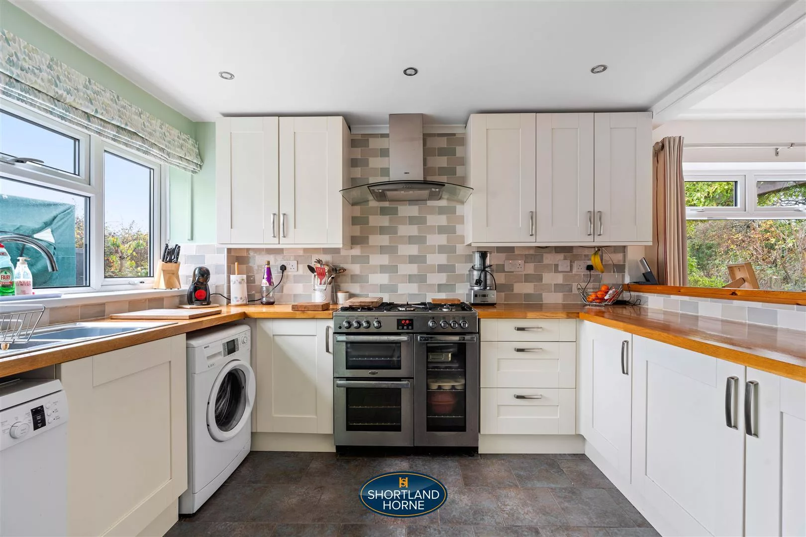 Approached from the rear via a driveway and garage, an enclosed porch serves as the main entrance, immediately welcoming you into a bright, practical kitchen. Fitted with light shaker-style units, dark wood worktops, and a dark grey tiled floor, the kitchen features a metro-tiled splashback, inset ceiling spotlights, and space for a range oven, washing machine, and integrated extractor. The layout flows naturally into the L-shaped lounge and dining area, where large windows on two sides frame views over the neighbouring fields, flooding the space with light throughout the day. French doors open onto the side garden, blending indoor and outdoor living, while a log burner in the corner adds warmth and character, perfect for cosy evenings or social gatherings.