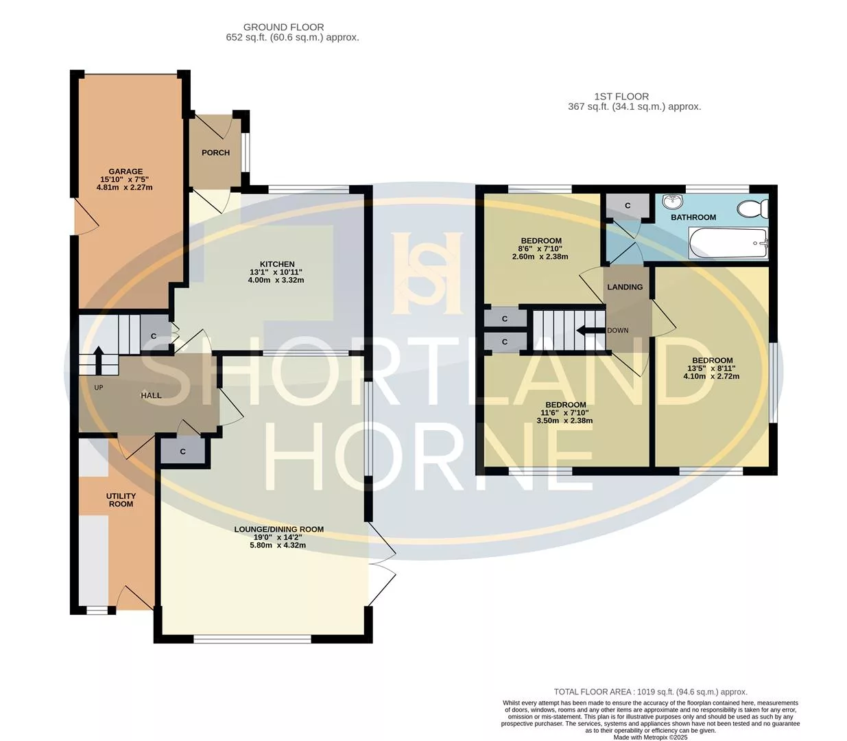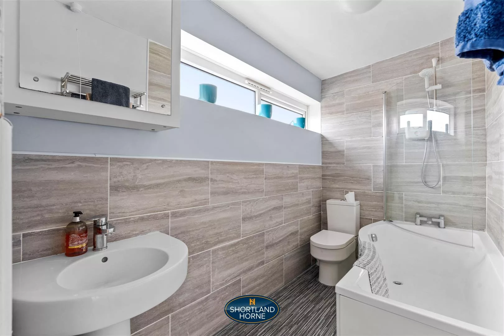Upstairs, carpeted stairs lead to a landing and three well-proportioned bedrooms. The main bedroom enjoys two windows with calming views over the fields. Bedroom two is a comfortable double, while bedroom three is a versatile single, ideal as a nursery, home office, or guest room. All bedrooms feature fitted storage for an organised, clutter-free home. The family bathroom completes the first floor with a bright, fresh feel, featuring tiled walls, a white three-piece suite, and a shower over the bath.