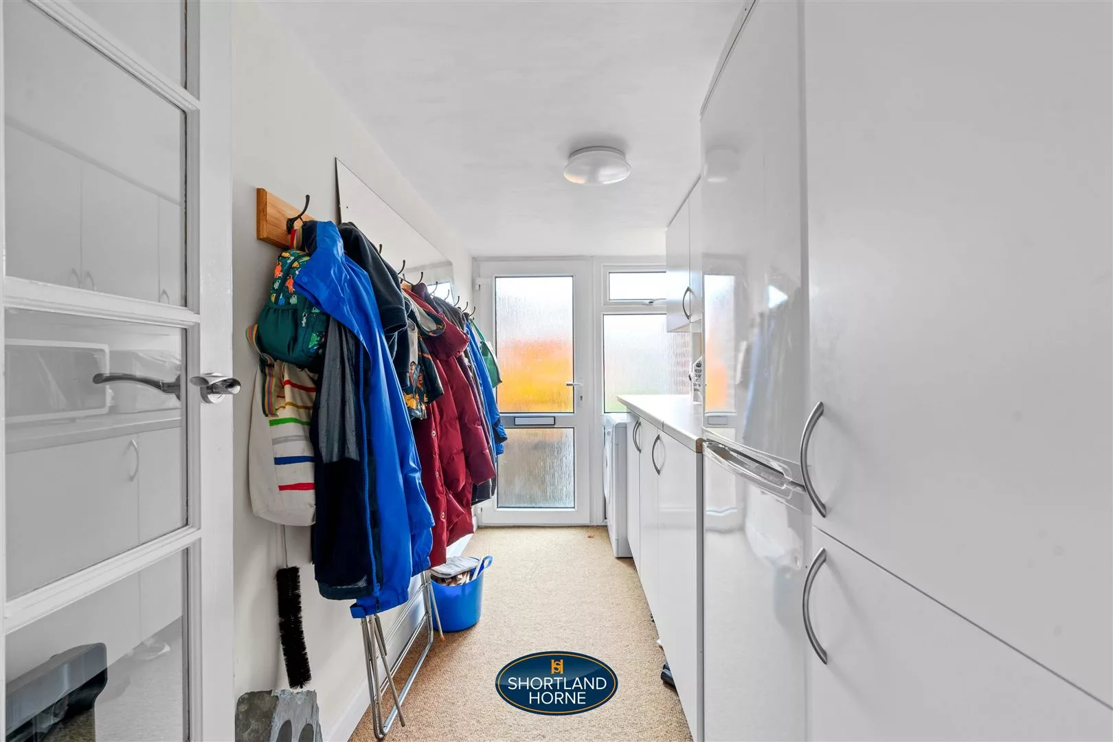 At the front of the home, the original hallway has been converted into a generous utility room, offering floor-to-ceiling cupboards, space for a tumble dryer and fridge freezer, and hooks for coats. This practical space also provides a door to the front garden, making everyday routines effortless.