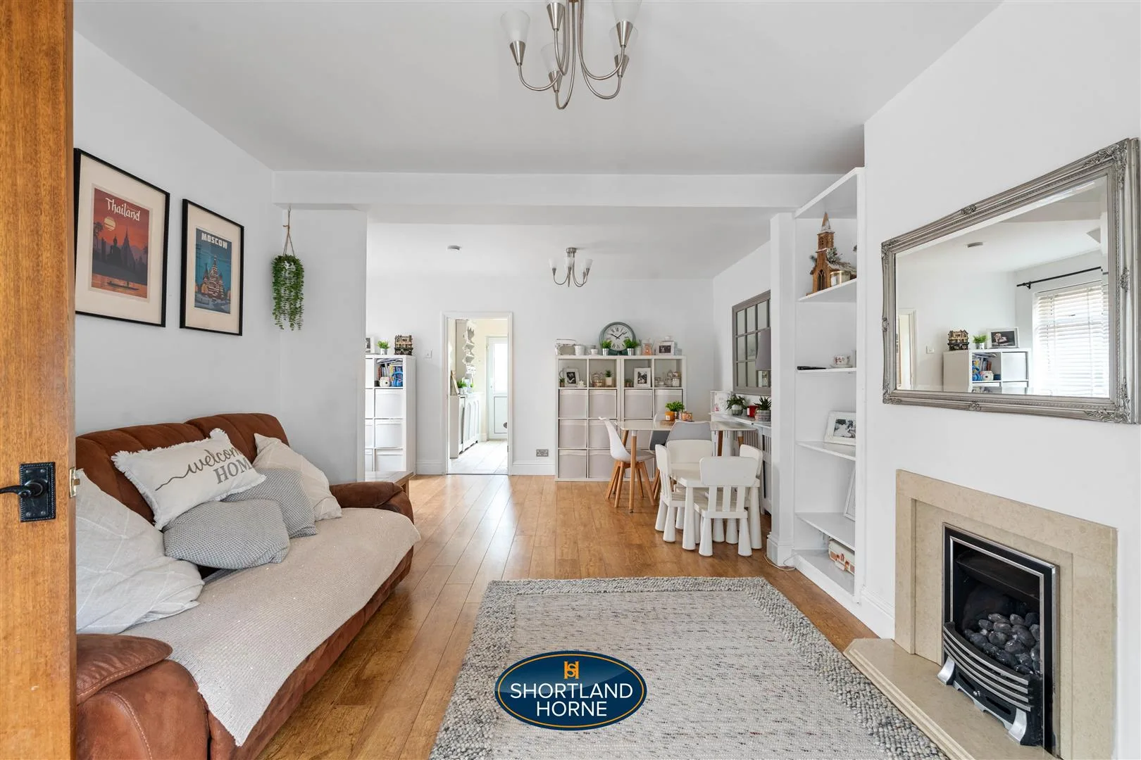 Step inside through the protective storm porch and into a compact yet welcoming square hallway. The staircase rises ahead, while a door to your right leads into a light-filled lounge and dining space, an open, airy room that makes the most of its dual aspect. Crisp white walls and wood-effect laminate flooring keep things feeling fresh and modern, while a recessed feature fireplace with a marble hearth and coal-effect gas fire adds a cosy, traditional touch. There’s plenty of room here to stretch out, gather the family, or host friends around the dining table. A discreet understairs cupboard keeps everyday bits and bobs neatly tucked away.