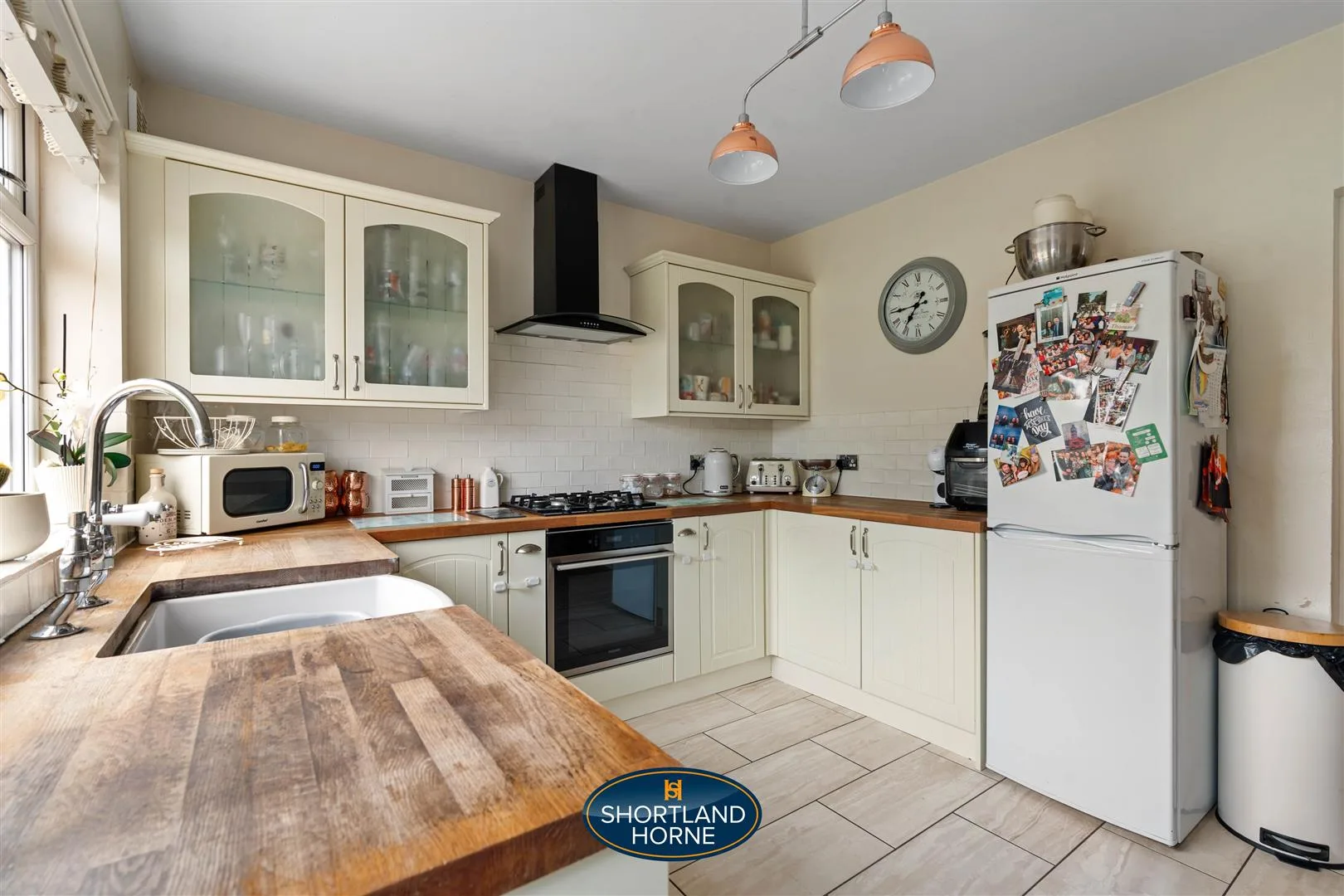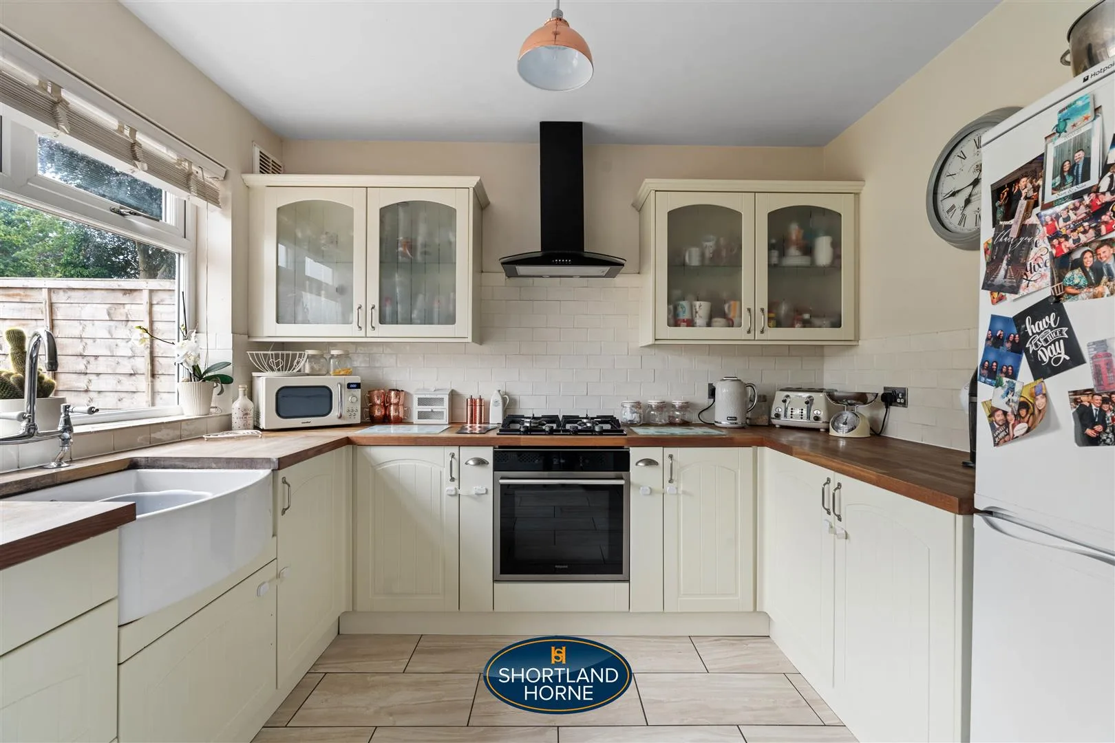 At the rear of the home, the kitchen is full of charm and function. Renovated five years ago, it features timeless shaker-style units in off-white, metro tiled splashbacks, a Belfast sink with vintage-style taps, and a black cooker hood for contrast. There's an integrated oven and gas hob for the home chef, and a utility cupboard houses the washing machine and tumble dryer. From here, a door opens straight out to the garden, perfect for summer evenings when cooking flows effortlessly from indoors to out.