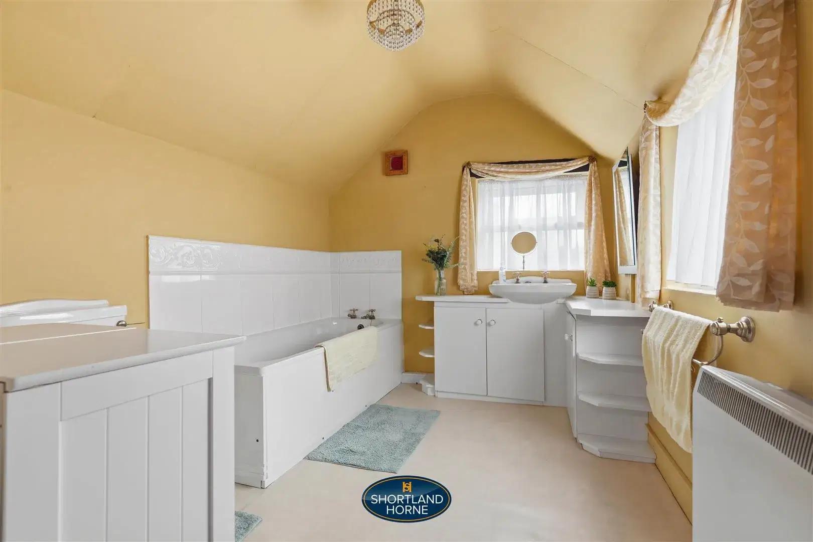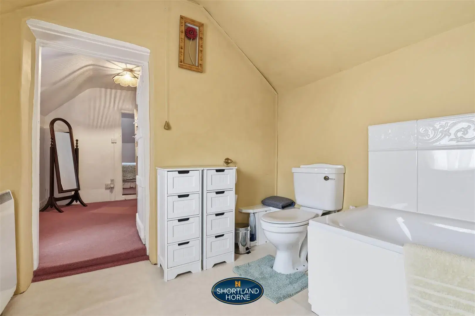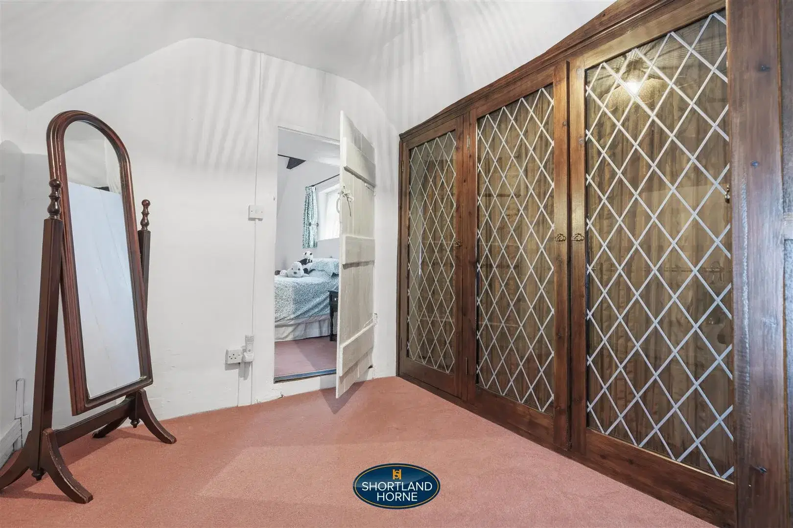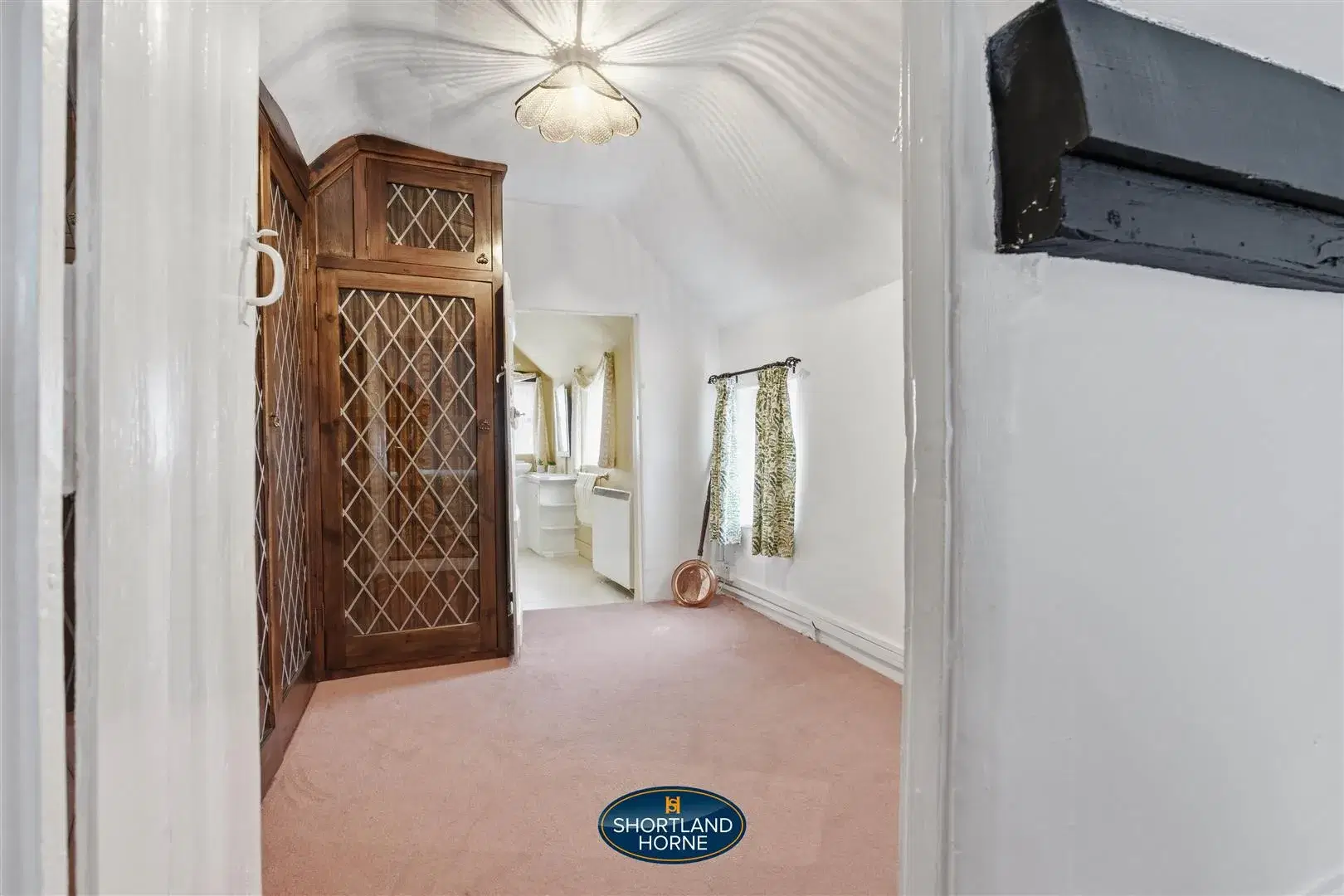 Upstairs, carpeted stairs lead to a peaceful first floor landing where the sense of age and authenticity continues. The main bedroom is a spacious and inviting retreat, enhanced by the charm of a pitched roof that adds character and architectural interest. There is ample space for a double bed and additional furniture, creating a restful environment that feels both private and comfortable. Adjacent to the bedroom, a separate dressing room fitted with wardrobes provides valuable storage and adds a sense of luxury rarely found in cottages of this style and age. The bathroom is bright and well arranged, featuring a white three piece suite with bath, vanity unit and partial tiling, offering a fresh and practical space to unwind at the end of the day.