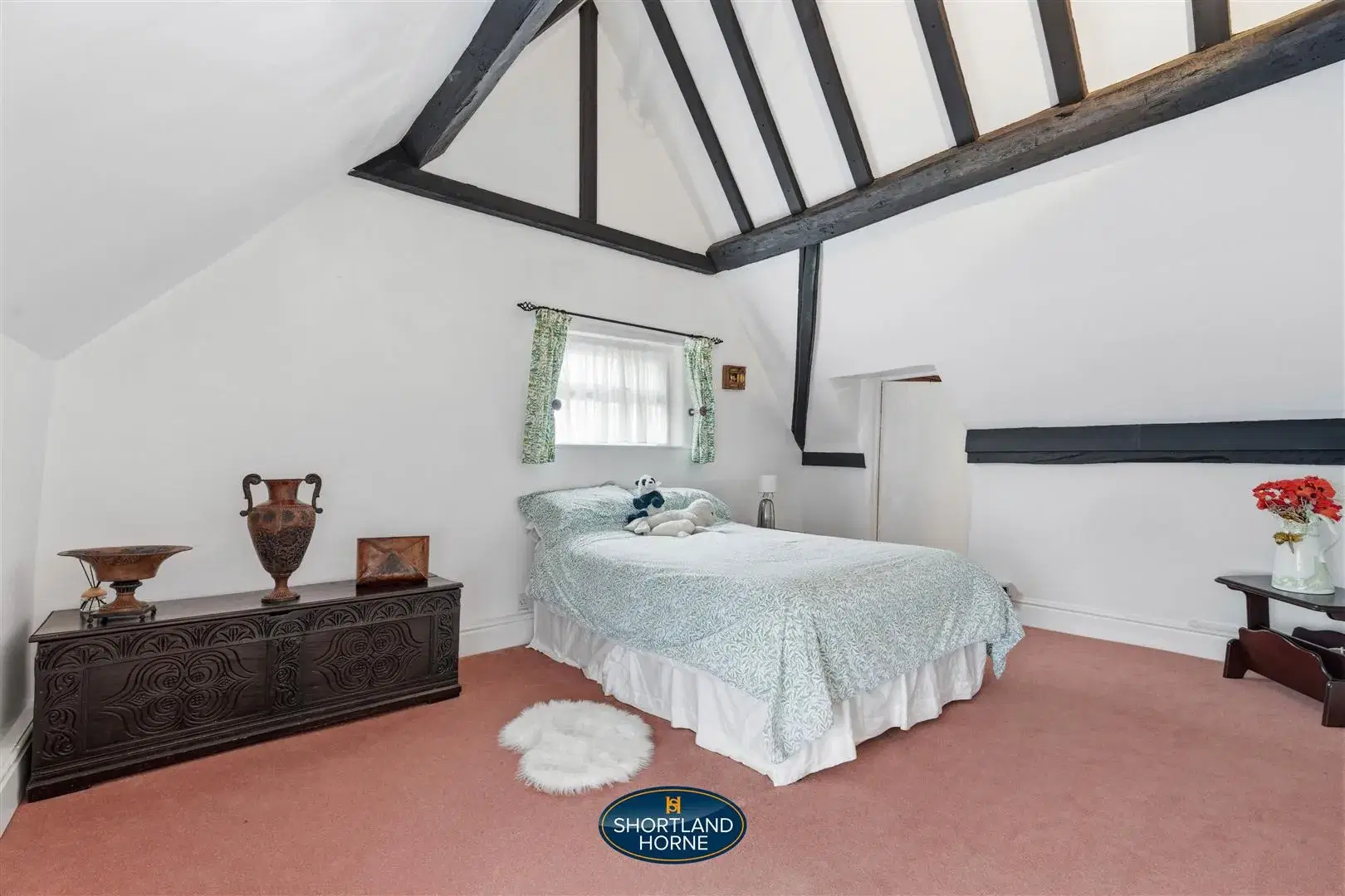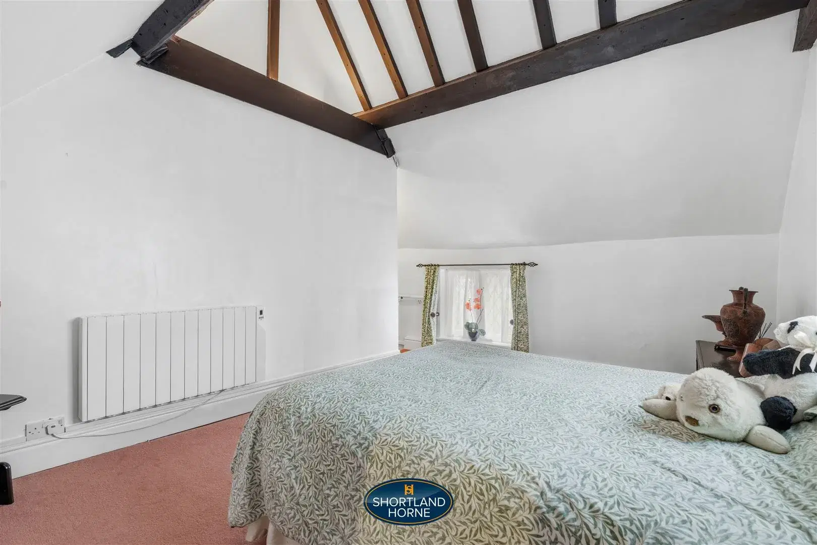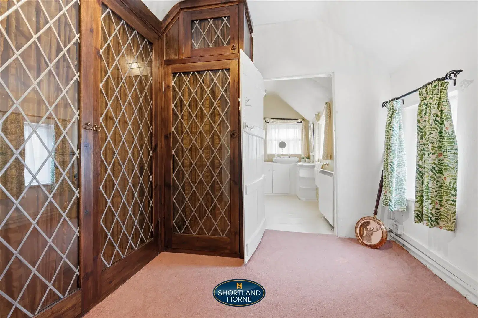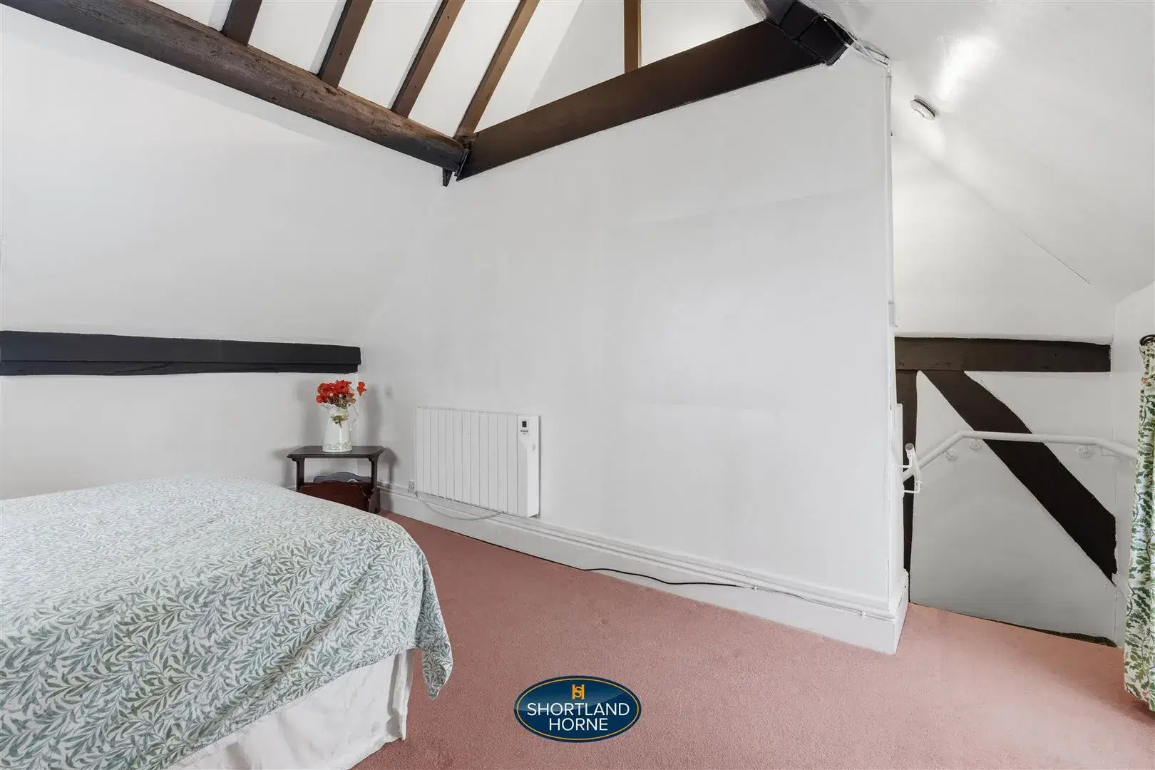 Upstairs, carpeted stairs lead to a peaceful first floor landing where the sense of age and authenticity continues. The main bedroom is a spacious and inviting retreat, enhanced by the charm of a pitched roof that adds character and architectural interest. There is ample space for a double bed and additional furniture, creating a restful environment that feels both private and comfortable. Adjacent to the bedroom, a separate dressing room fitted with wardrobes provides valuable storage and adds a sense of luxury rarely found in cottages of this style and age. The bathroom is bright and well arranged, featuring a white three piece suite with bath, vanity unit and partial tiling, offering a fresh and practical space to unwind at the end of the day.
