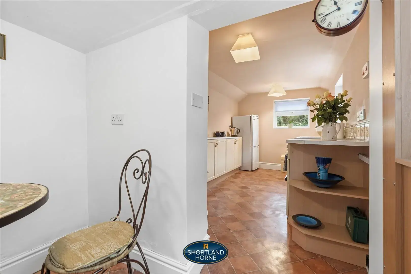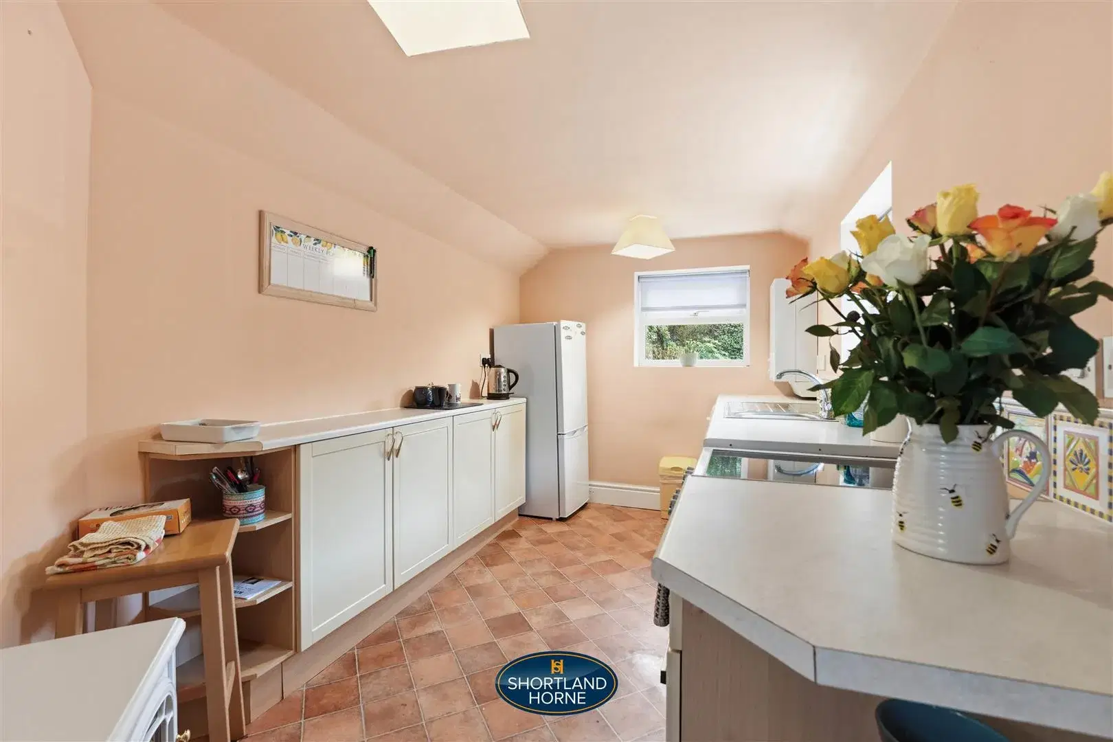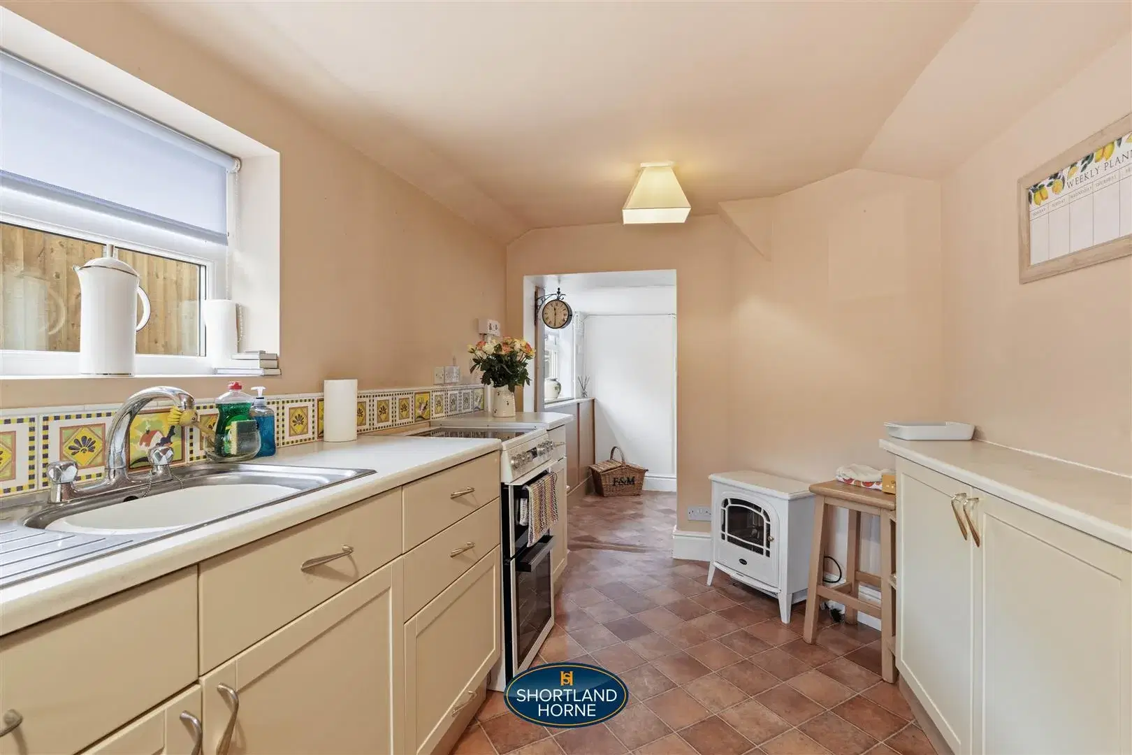 The breakfast room offers a bright and welcoming spot to begin the day. With practical vinyl flooring and a relaxed feel, it creates a natural link between the living spaces and the kitchen beyond. The kitchen itself is finished in neutral tones, providing a light and functional space where the simplicity of the design complements the cottage character rather than competing with it. It is easy to imagine preparing meals here while looking out towards the garden, with the calm rhythm of cottage life quietly unfolding around you.