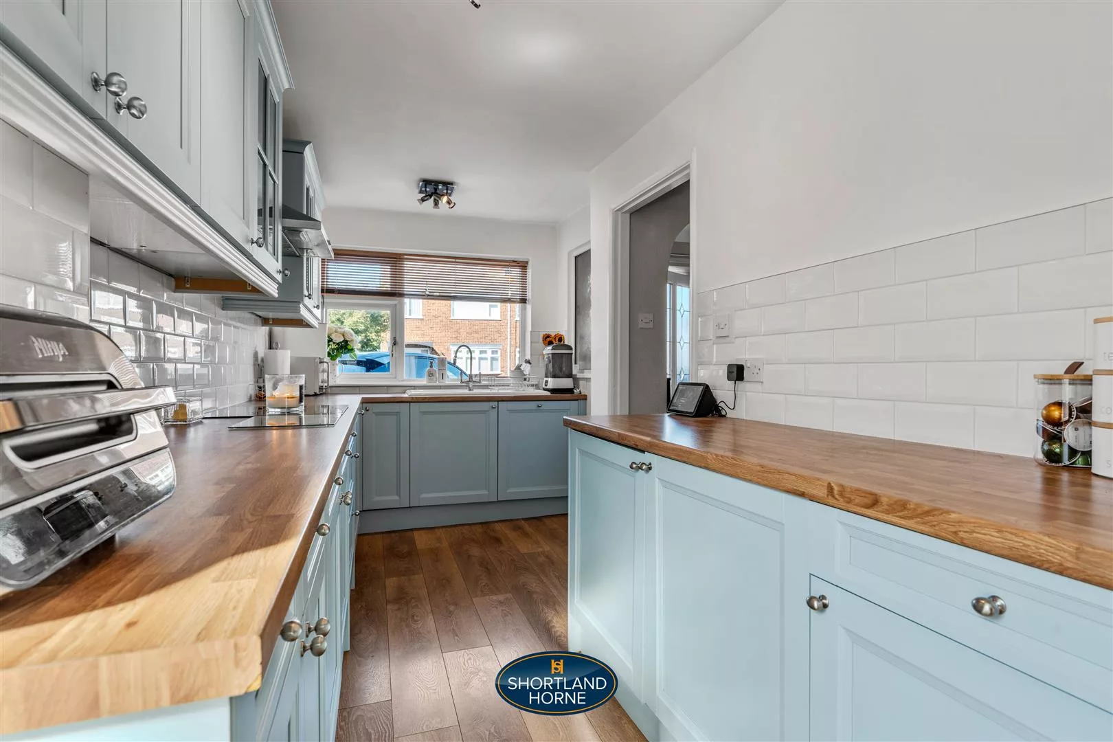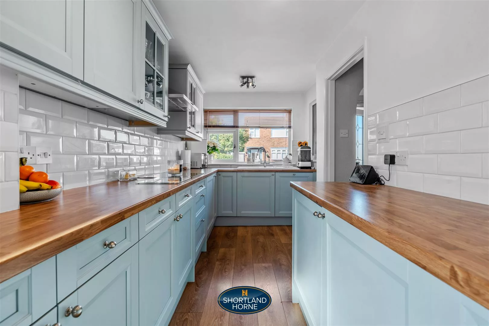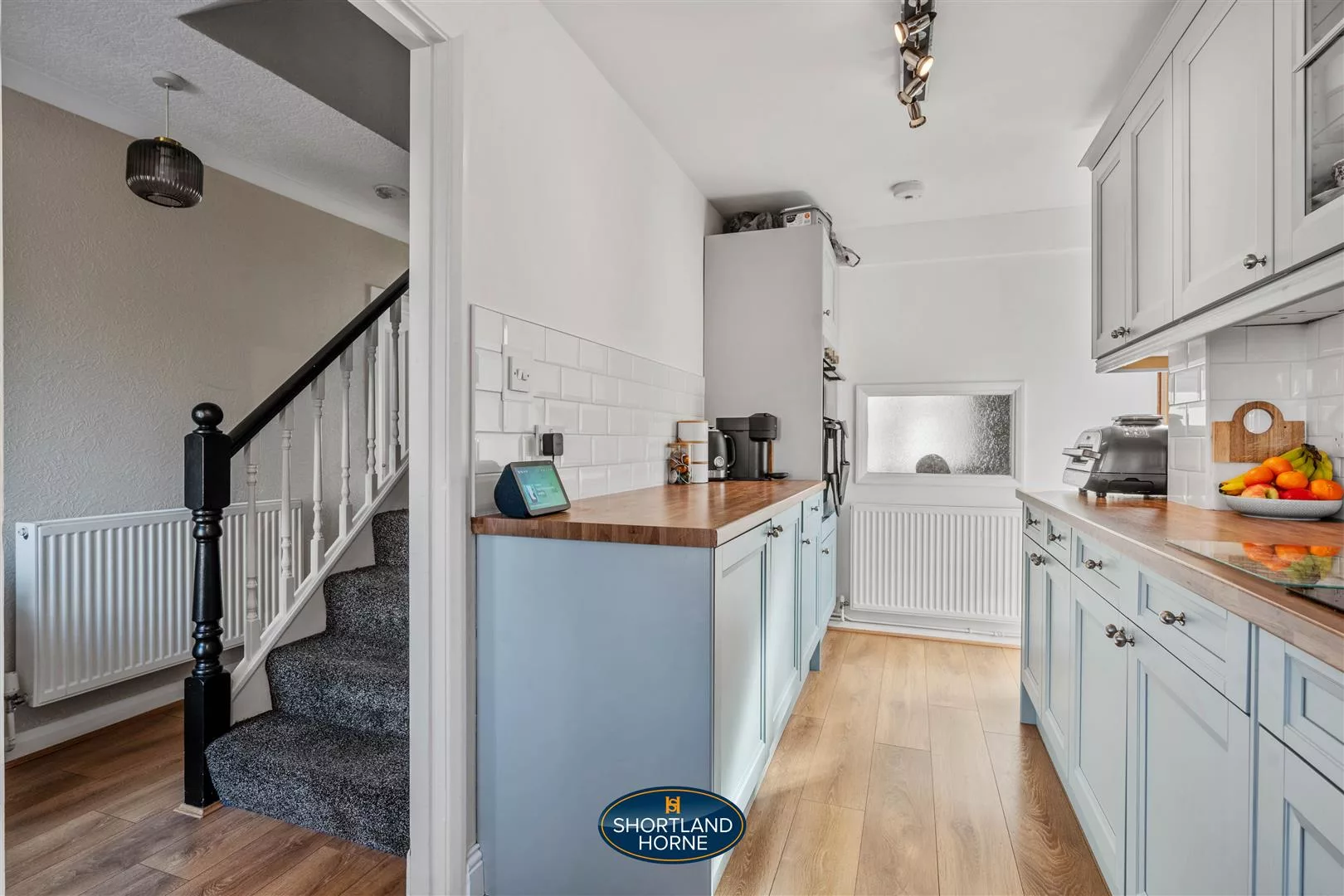 The kitchen, newly fitted, is a real showstopper. Its pale blue shaker style cabinets pair beautifully with pale grey wall units, all set against the crisp lines of a white metro tiled splashback. The warmth of oak worktops brings a homely contrast, while integrated appliances including the induction hob, extractor, fridge, freezer and dishwasher make cooking feel effortless. It is a galley design that feels both stylish and functional, a place where everything is within easy reach and meals come together with ease.
