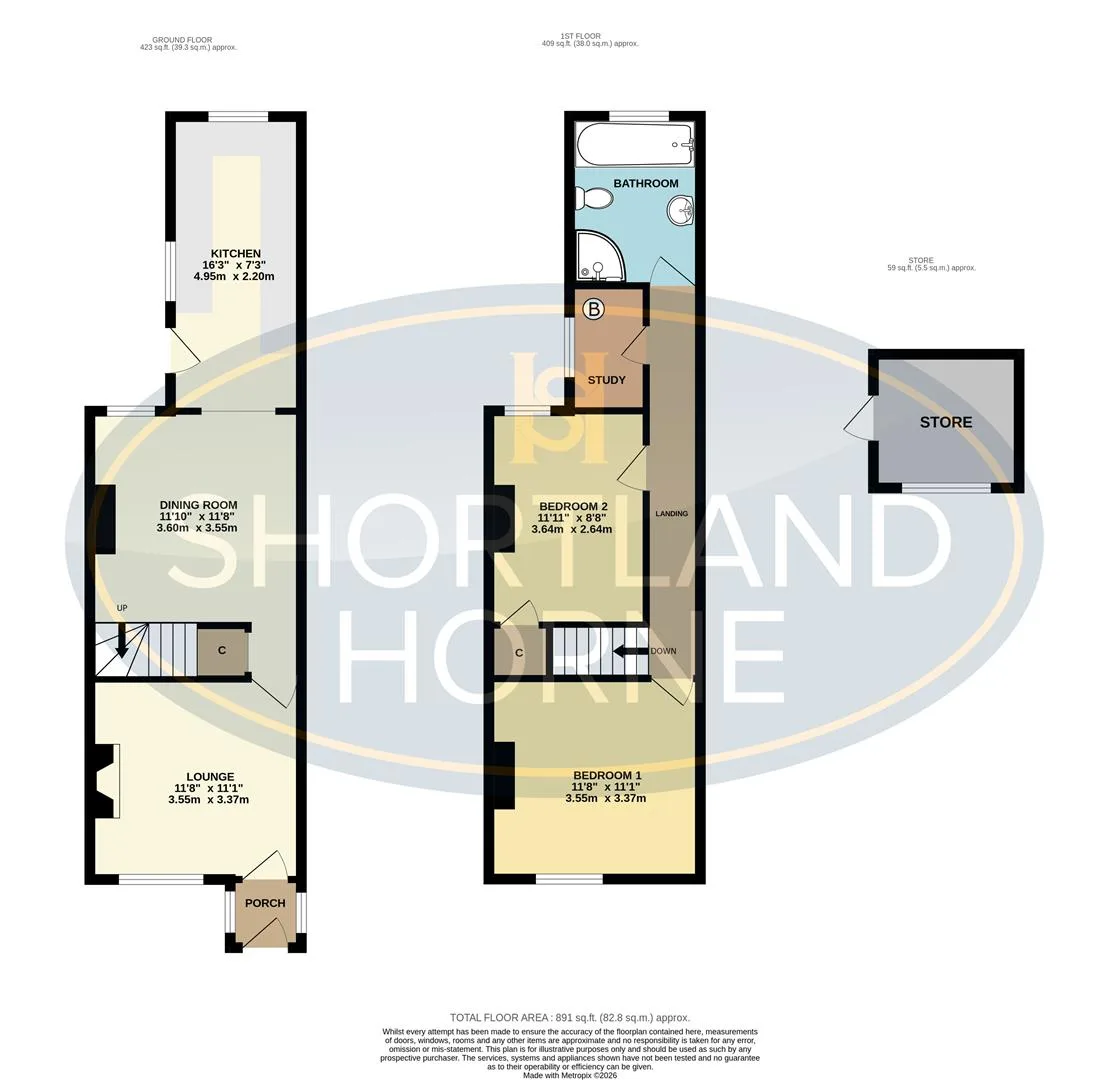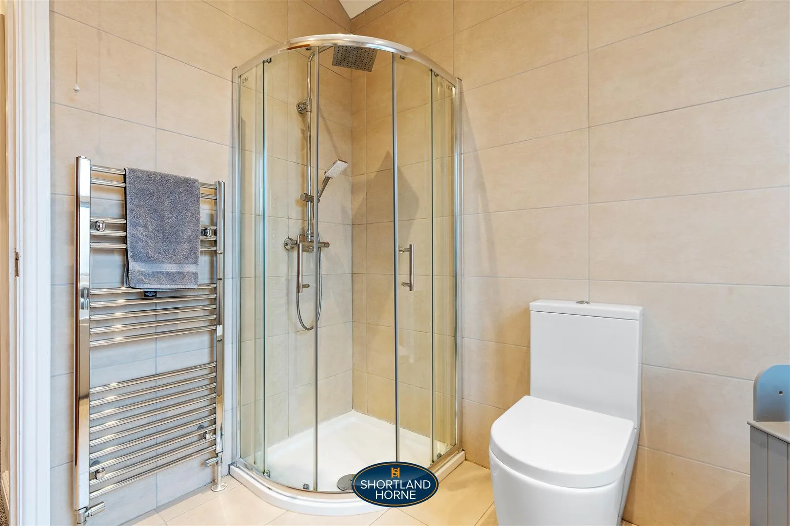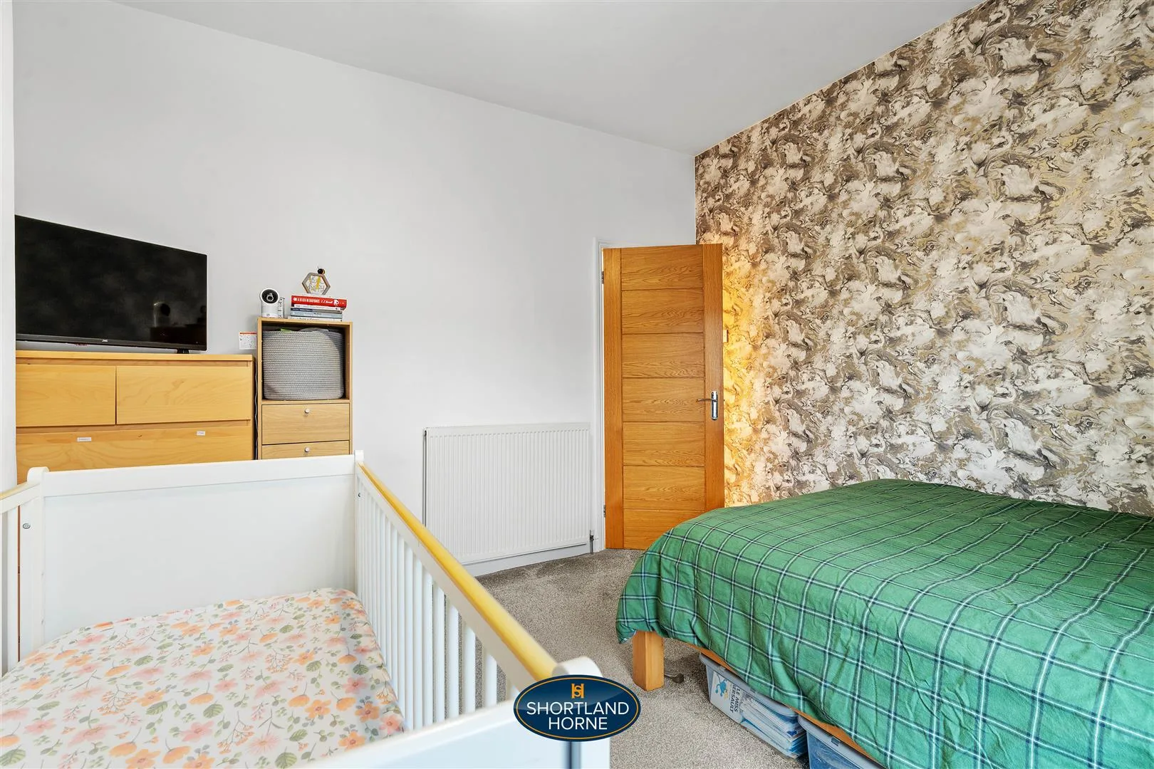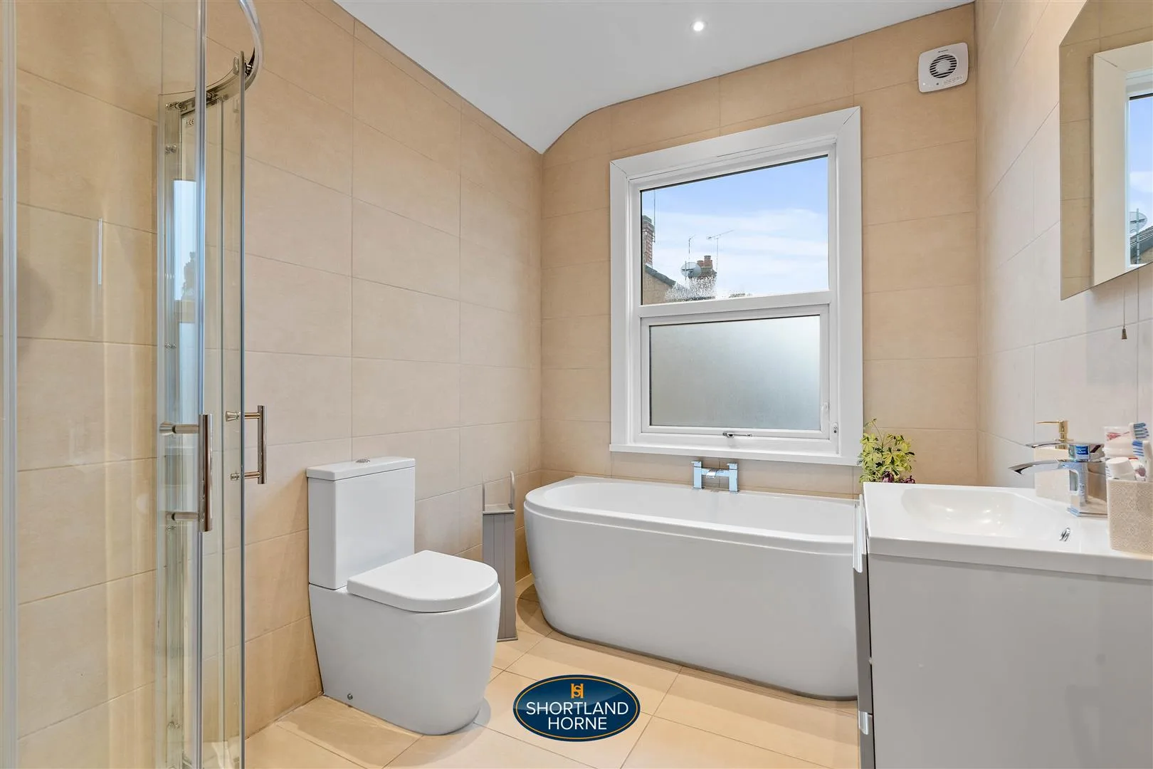 Upstairs, the sense of space and calm continues. Both bedrooms are generous doubles, dressed in soft grey carpeting that adds to the restful feel. The main bedroom sits at the front of the property and benefits from a large window and a charming chimney breast, while the second bedroom enjoys views over the private rear garden and includes useful storage with access to the loft. A separate study space provides the ideal nook for home working, studying or simply a quiet corner to read and recharge. The bathroom is modern, spacious and beautifully finished, fully tiled with a contemporary vanity unit, curved bath, separate shower cubicle and inset spotlights, offering a touch of everyday luxury.