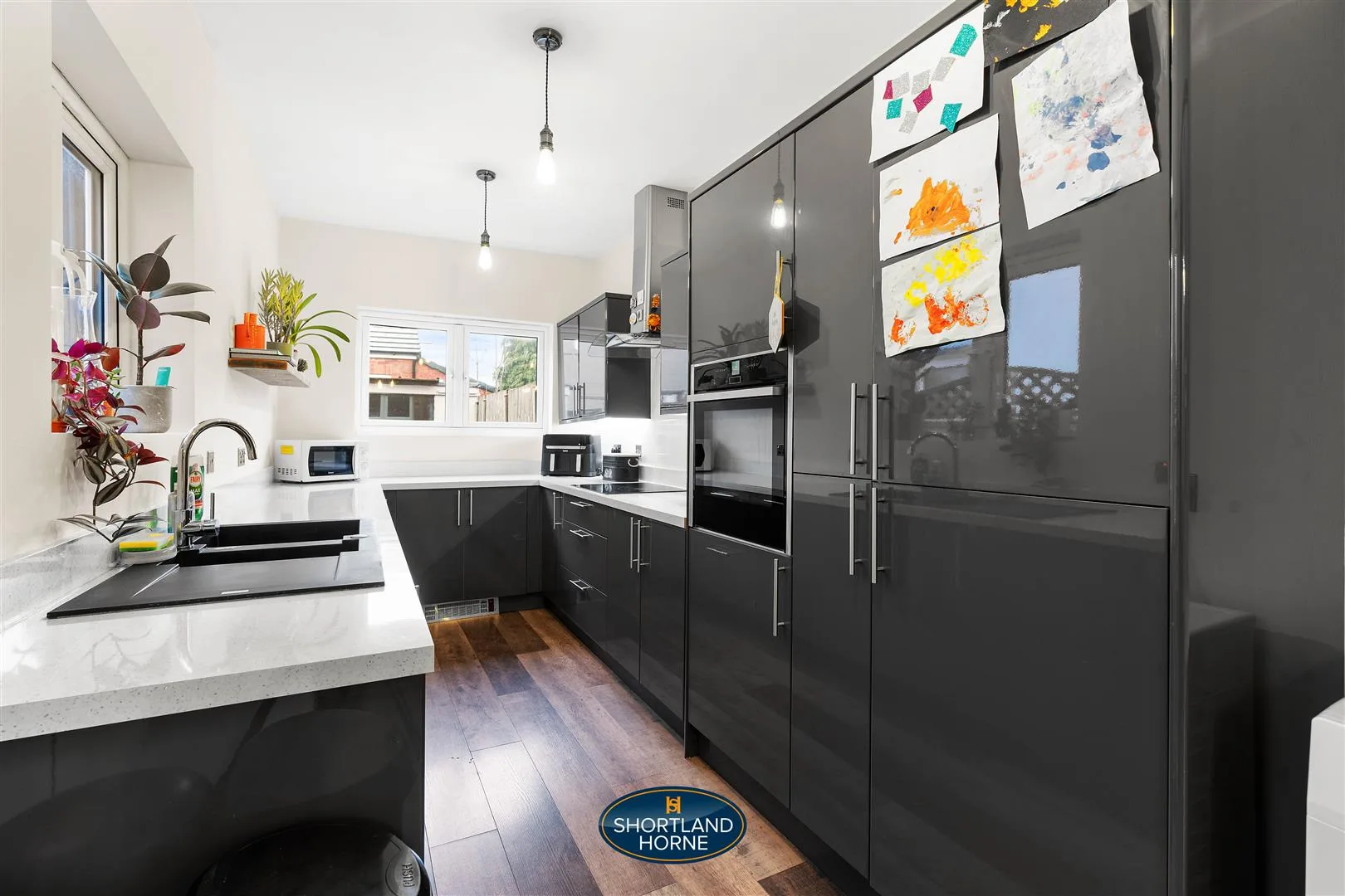 Moving through, the home really comes into its own in the open plan kitchen and dining area, a sociable and welcoming space designed for everyday living and easy entertaining. Whether it’s busy weekday breakfasts or relaxed evenings with friends, this is a room that naturally brings people together. The modern kitchen is both stylish and practical, finished with sleek dark high gloss units and light worktops, and fully equipped with integrated appliances to make cooking and baking a pleasure rather than a chore. With two windows and a door opening directly onto the garden, the room feels wonderfully light and airy, gently connecting indoor living with the outdoors on warmer days.