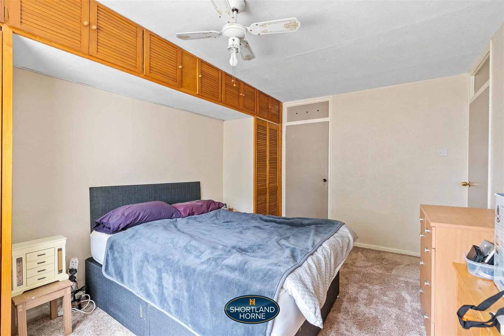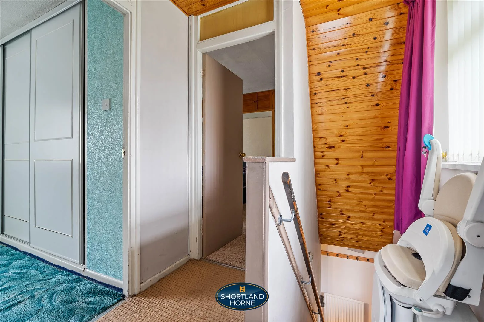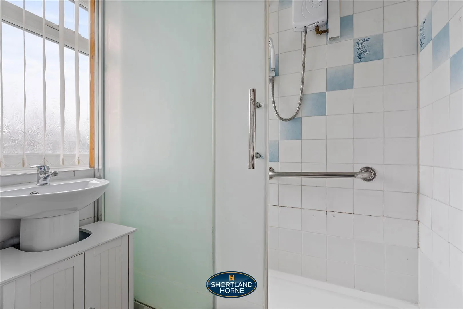 Carpeted stairs rise to the first floor, where a peaceful landing connects the two bedrooms and the family bathroom. The main bedroom offers generous space for a double bed and benefits from fitted wardrobes that provide excellent storage while keeping the room feeling calm and uncluttered. The second bedroom, a small double, also features fitted wardrobes and makes an ideal guest room, child’s bedroom or home office, adapting easily to your changing needs. The family bathroom completes the upper floor, presenting a crisp white three piece shower room that feels fresh, bright and practical.