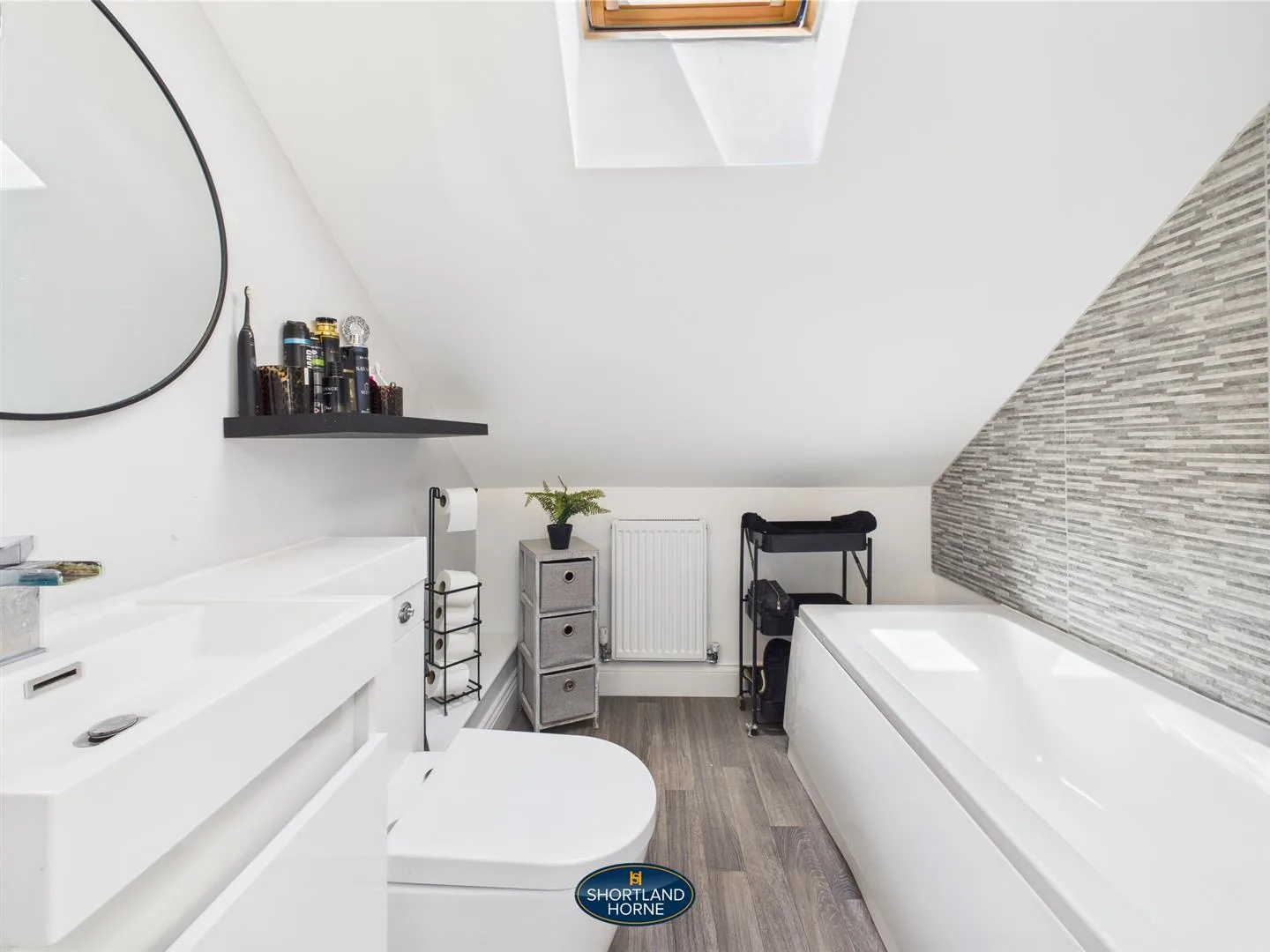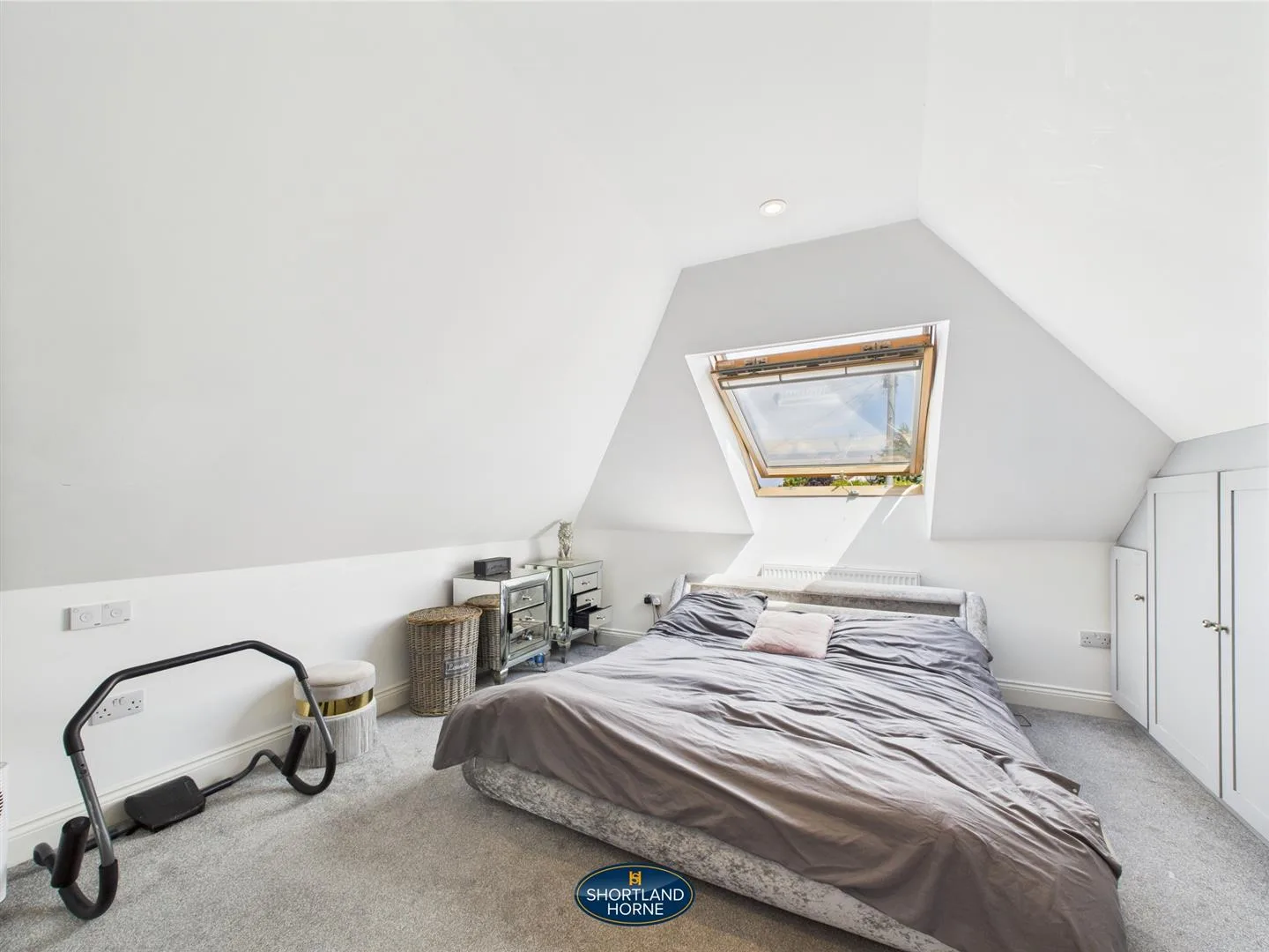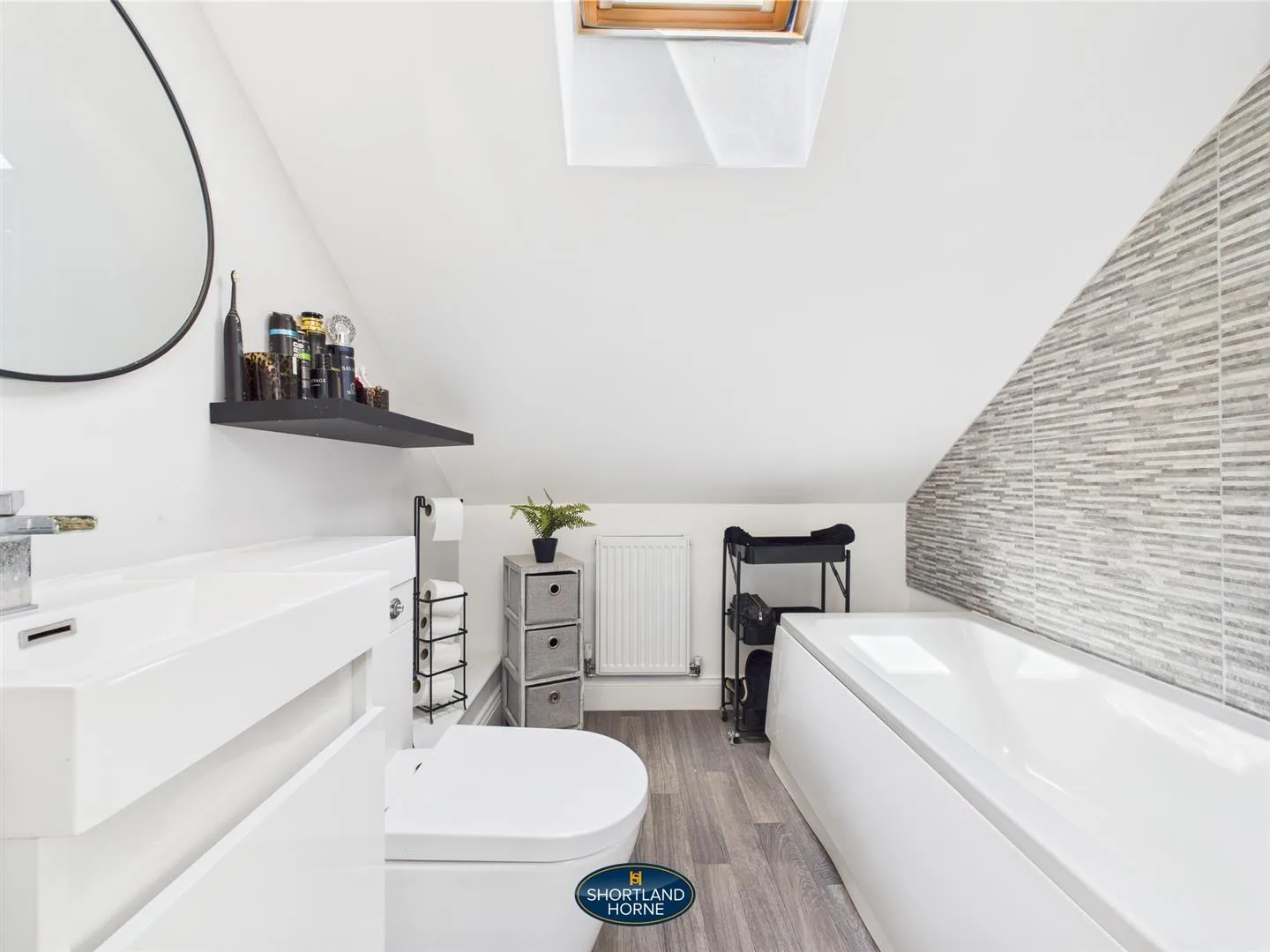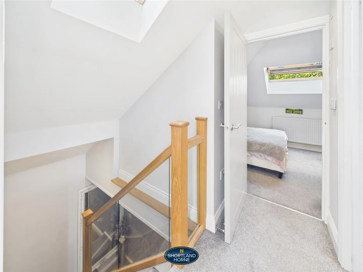 A staircase leads to the first floor, where a skylight window above the landing draws in an abundance of natural light, creating a bright and airy transition between spaces. The sense of light continues into the two further bedrooms. One features fitted wardrobes and ample room for a double bed, combining practicality with comfort, while the fourth bedroom is another well sized room that can flex to suit changing needs. The upstairs family bathroom also benefits from a skylight window, bathing the white three piece suite in daylight and enhancing the feeling of calm and privacy.