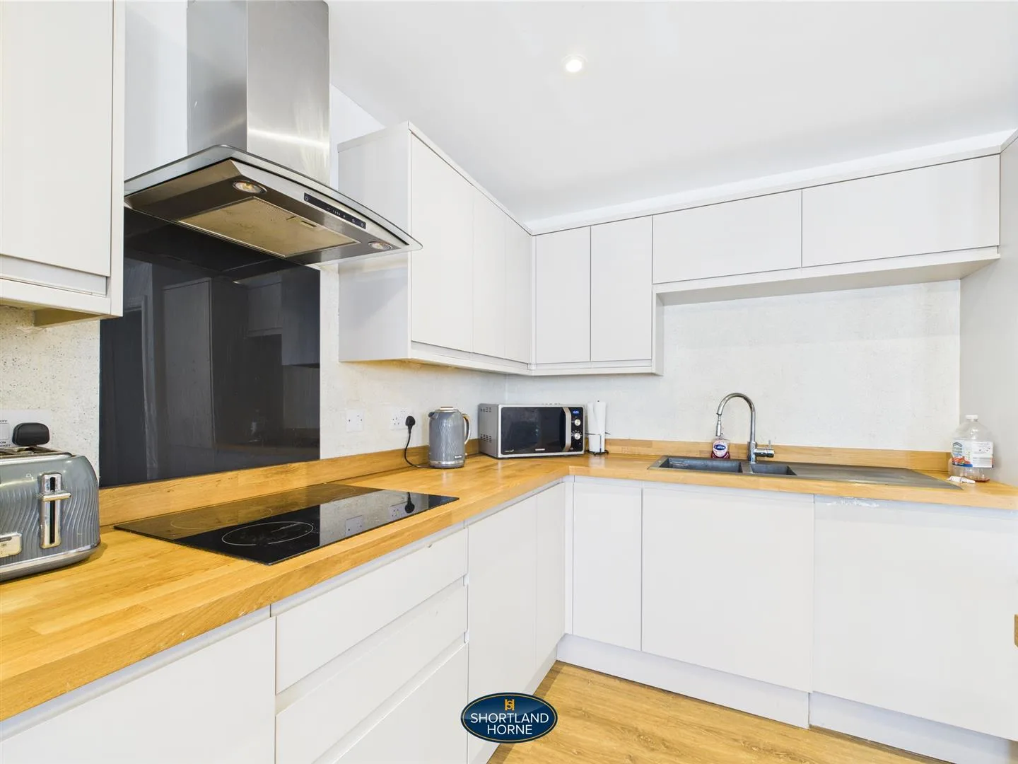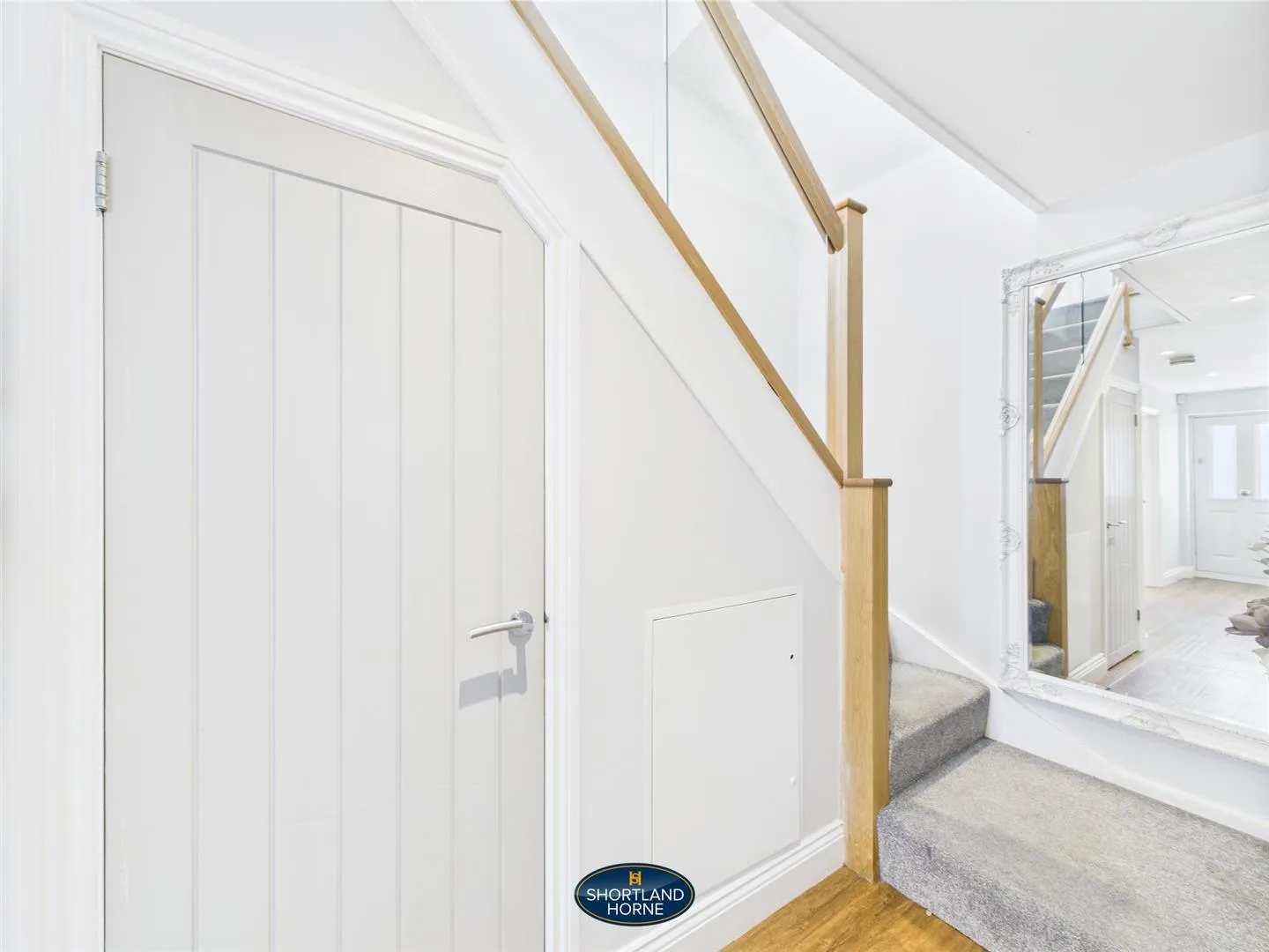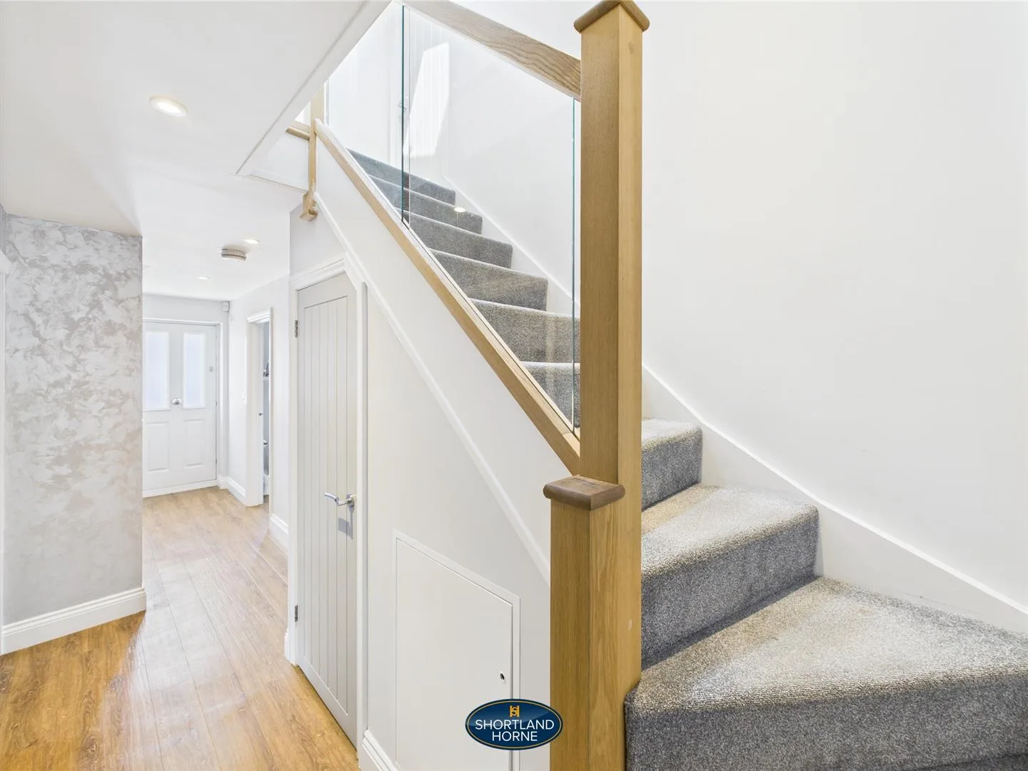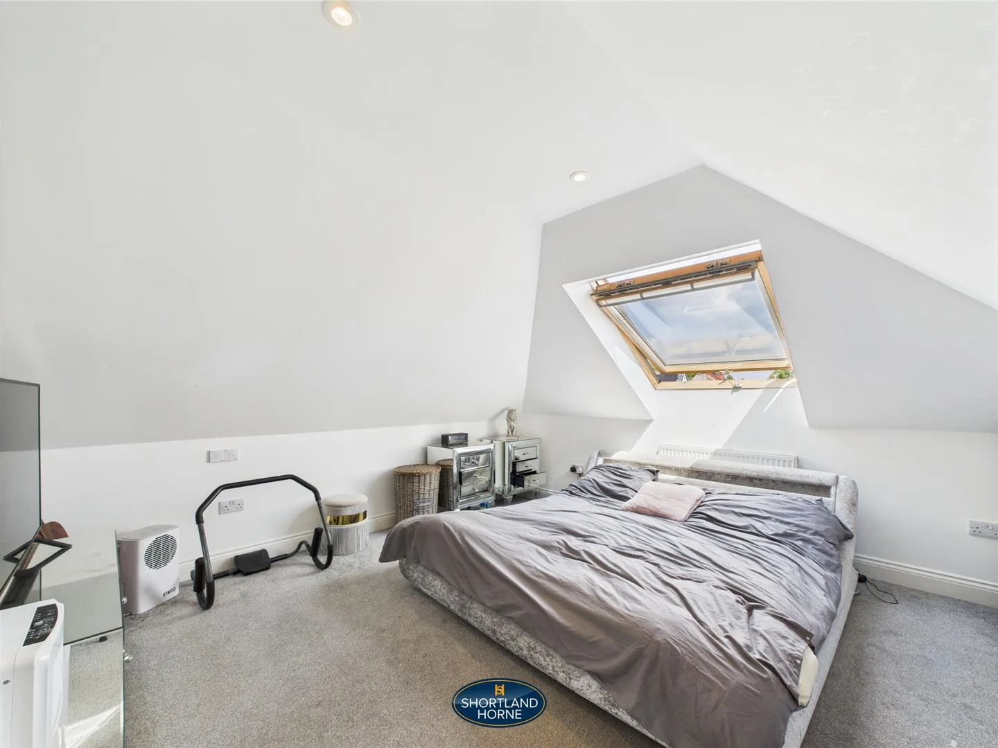 A staircase leads to the first floor, where a skylight window above the landing draws in an abundance of natural light, creating a bright and airy transition between spaces. The sense of light continues into the two further bedrooms. One features fitted wardrobes and ample room for a double bed, combining practicality with comfort, while the fourth bedroom is another well sized room that can flex to suit changing needs. The upstairs family bathroom also benefits from a skylight window, bathing the white three piece suite in daylight and enhancing the feeling of calm and privacy.