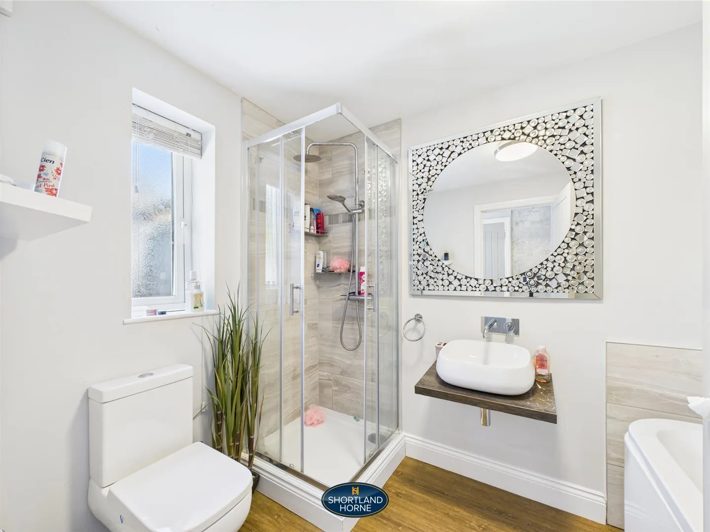 On the ground floor, two spacious double bedrooms provide comfort and convenience. Each is carpeted underfoot, softening the space and creating a calm retreat at the end of the day. Their generous proportions allow for double beds and additional furniture without compromise, making them ideal for family members, guests or even a home office if required. The ground floor bathroom is fitted with a classic white three piece suite, complete with both a bath and separate shower cubicle, offering the best of both worlds for busy mornings and leisurely evenings.