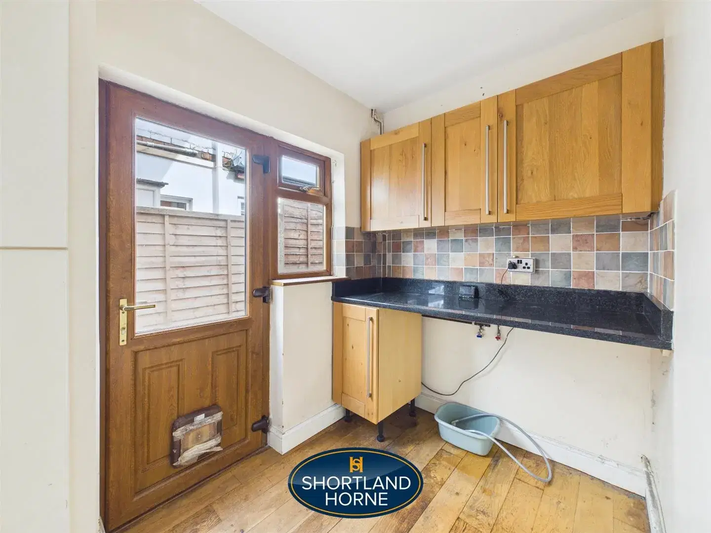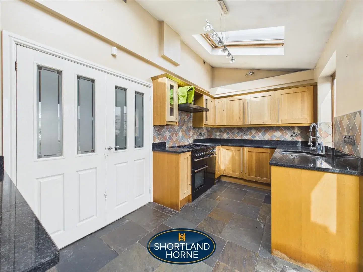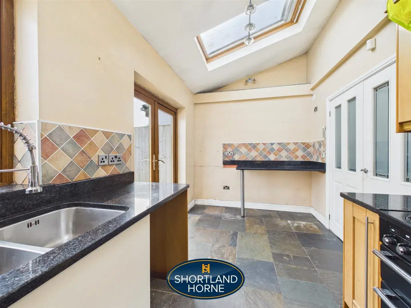 The kitchen sits to the rear, fitted with wooden cupboards and a tiled splashback that add a sense of warmth and character. Above, a skylight invites daylight to spill in from above, brightening the room and creating a connection to the sky that shifts with the passing hours. It is a space designed for everyday use, practical yet full of potential.