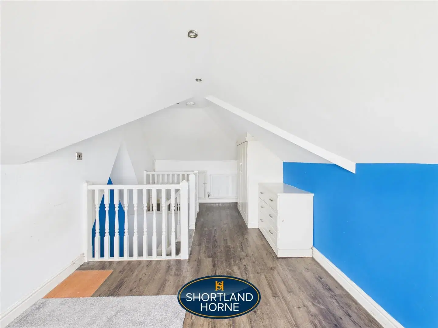 Rising to the second floor, the third bedroom offers a more private and versatile space. With laminate flooring and fitted wardrobes and drawers, it is well suited as a main bedroom, guest suite, or even a quiet retreat for working from home. The elevated position adds to the sense of separation, creating a room that feels tucked away and peaceful.
