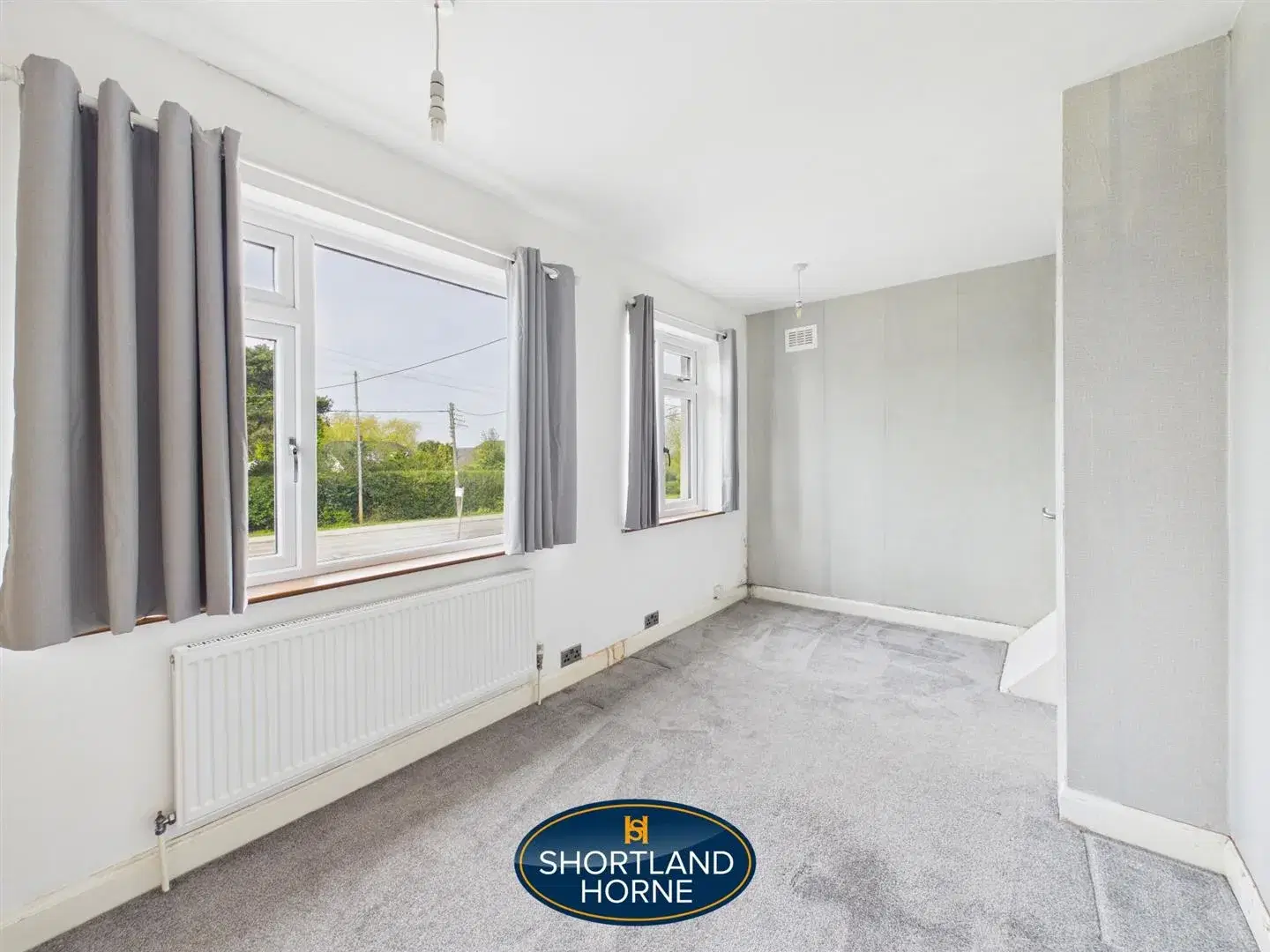 Upstairs, the first floor continues the home’s sense of space and practicality. Two well-proportioned bedrooms offer comfortable accommodation, each with room for a double bed and wardrobes, making them ideal for family living or guest use. Soft carpeting adds warmth underfoot, while the layout ensures a natural flow between rooms. The bathroom is fitted with a white suite and a walk-in shower, with tiled finishes.