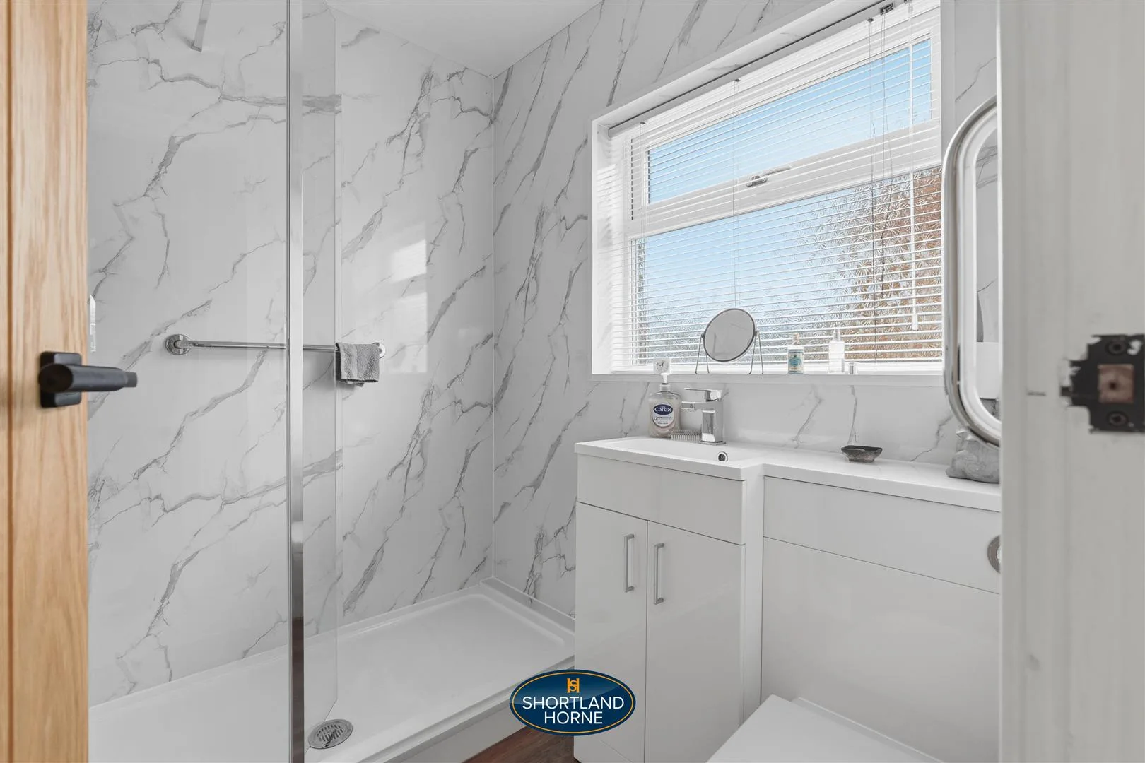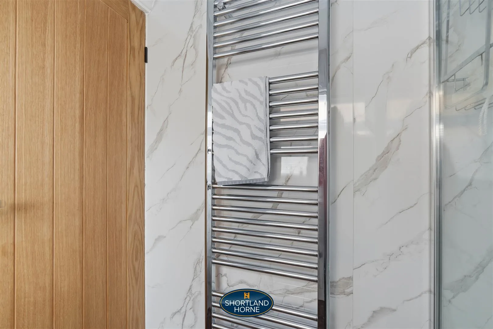 At the front of the property, the bedroom provides a generous double space filled with natural light. Fitted wardrobes offer excellent storage while leaving plenty of room for additional furniture, creating a restful environment that feels both spacious and serene. Completing the interior is the beautifully renovated shower room, finished with a crisp white three piece suite, a luxurious rain head shower and a large heated towel radiator that brings a touch of everyday comfort.