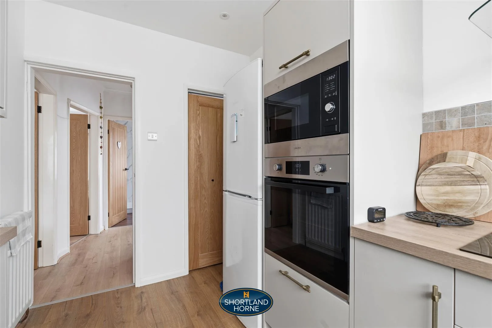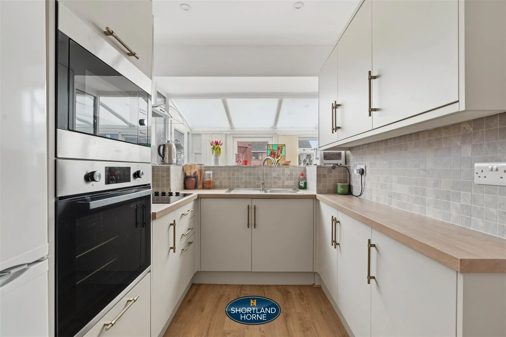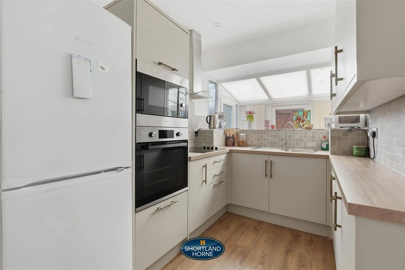 The kitchen has been completely transformed in the summer of 2024 and now stands as a stylish yet highly practical space. Soft daylight falls across the tiled splashback and waterproof laminate flooring, illuminating sleek work surfaces and thoughtfully arranged storage. Integrated appliances including an eye level oven, microwave and hob make cooking effortless, while a designated space for a freestanding fridge freezer ensures flexibility. Tucked neatly away, the pantry cupboard discreetly houses the newly installed boiler along with the gas and electric meters, leaving additional shelving for useful storage.