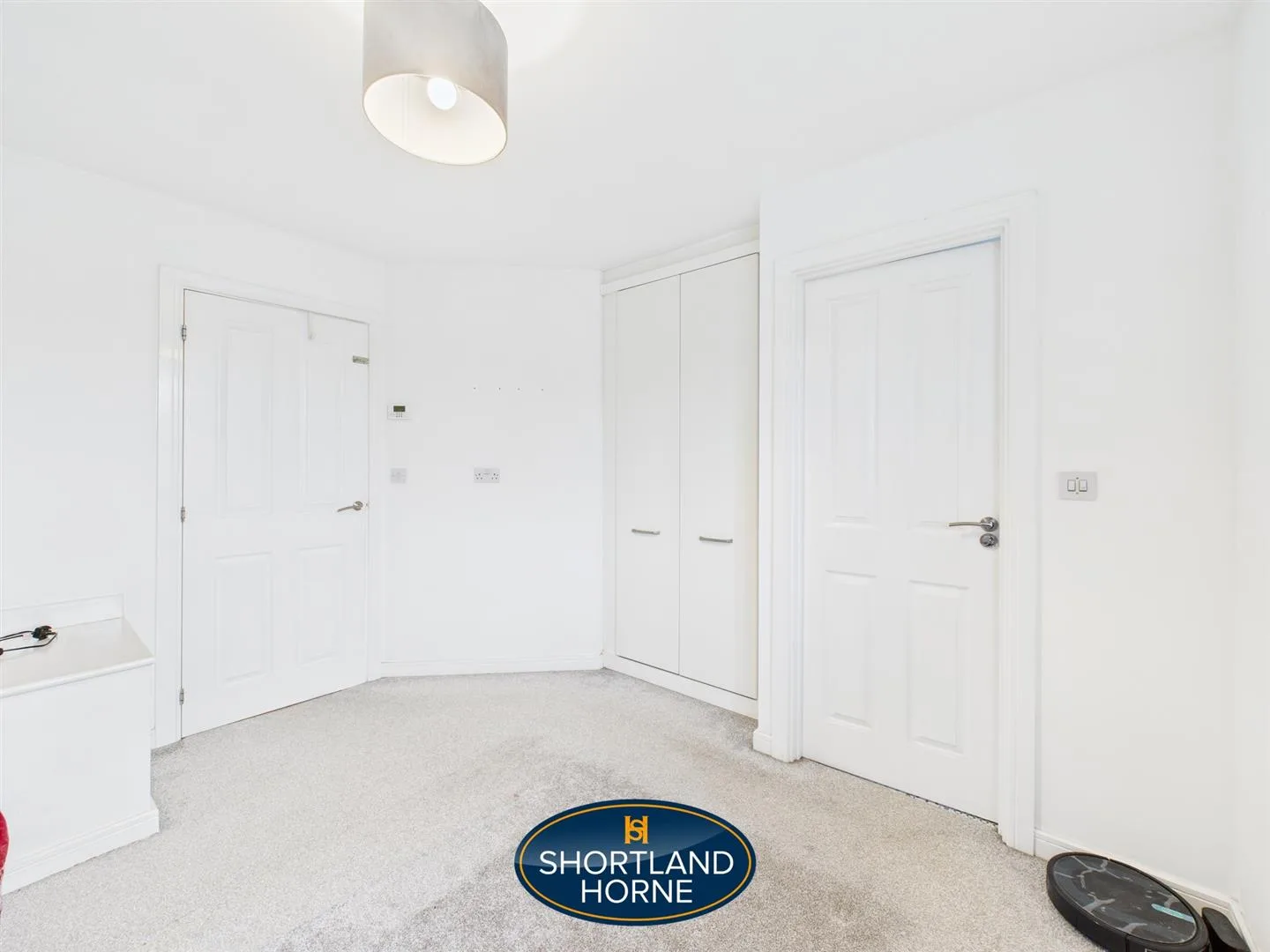 Ascending the carpeted staircase, the first floor continues to impress with a calm and cohesive feel throughout. The landing leads to three thoughtfully proportioned bedrooms, all finished with carpeted flooring for a clean and modern look. The main bedroom offers generous space for a double bed and benefits from fitted wardrobes, keeping the room clutter free and serene. The en-suite shower room provides a fresh and private space to start the day. Bedroom two comfortably accommodates a small double, while bedroom three is a versatile room that works beautifully as a single bedroom, nursery or home office, adapting easily to your lifestyle. The family bathroom completes the floor, featuring a white three piece suite with a shower over the bath, ideal for both quick mornings and long, relaxing soaks.