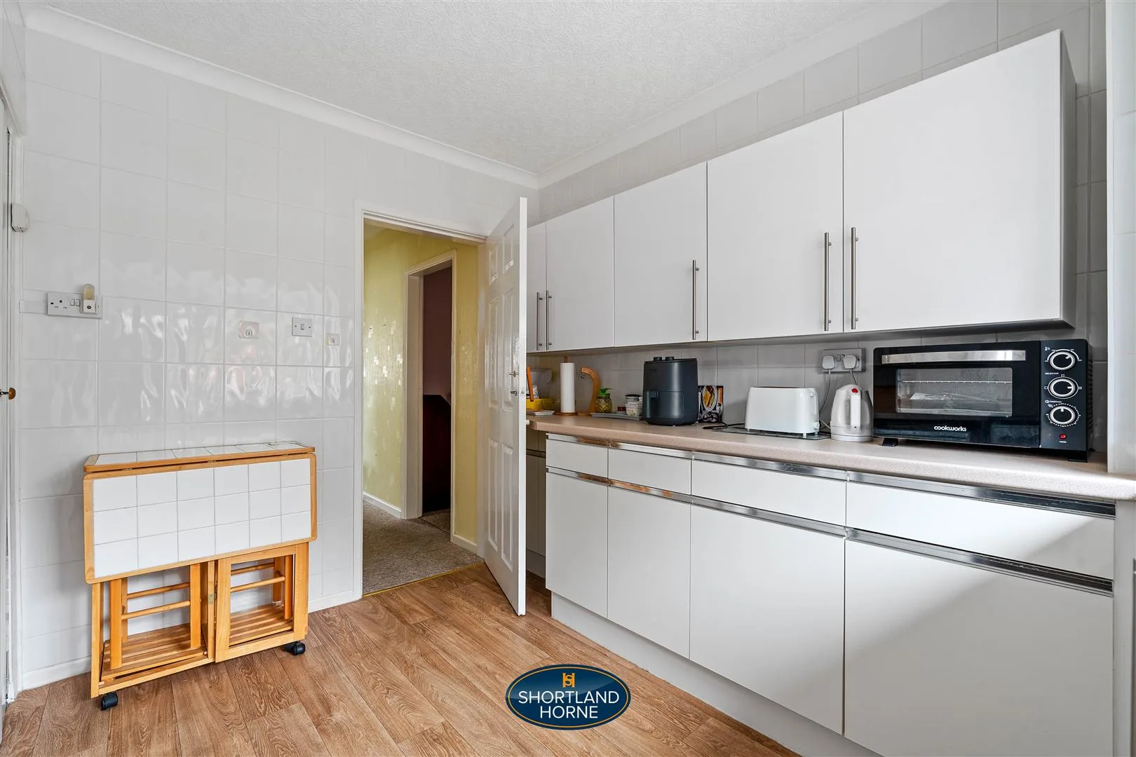 The kitchen is thoughtfully arranged with white gloss units that reflect the light and maintain a bright and clean aesthetic. Practical tiled walls complement the space, while there is ample room for essential appliances, creating a functional and pleasant environment for everyday cooking. The property has been very well cared for over the years and remains beautifully presented throughout, offering buyers the opportunity to move straight in while also leaving scope for gentle cosmetic modernisation if desired.