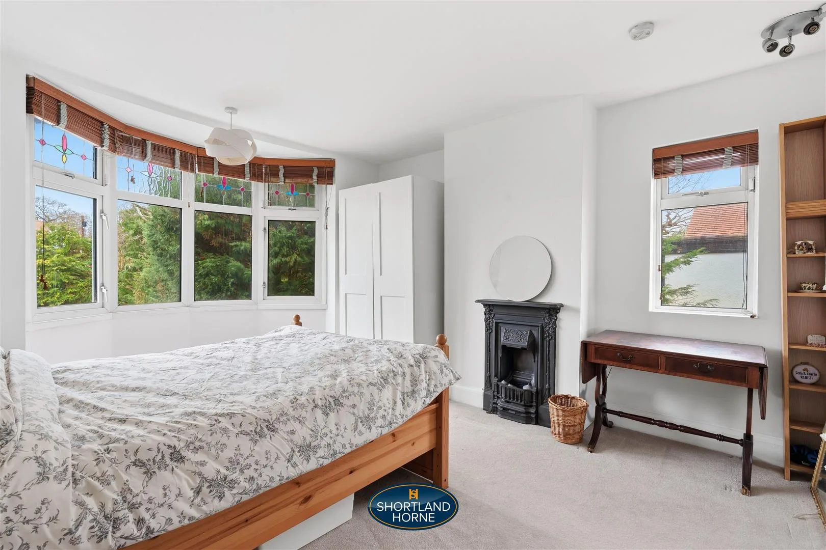Upstairs, the bedrooms continue the theme of light and personality. Traditional fireplaces and picture rails whisper of the home’s heritage, while generous windows frame leafy views from every angle. Upstairs, the sense of space and character continues. The principal bedroom on the first floor is a true retreat, crowned by a beautiful bay window that fills the room with soft, shifting light from morning to dusk. A cast iron fireplace adds romance and personality, hinting at the home’s heritage and offering a stunning focal point. It is a room that invites slow mornings and unhurried evenings. Additional bedrooms are equally well proportioned, some featuring traditional fireplaces and picture rails that nod to the property’s age and charm. The re-fitted bathroom blends contemporary comfort with everyday ease. A stylish P shaped bath with shower over curves gracefully into the space, inviting long soaks at the end of the day. A vanity unit houses the sink, keeping surfaces sleek and storage tucked away.
