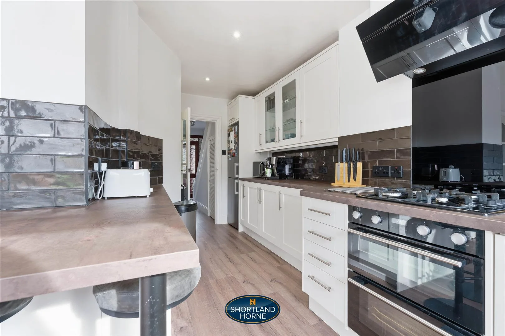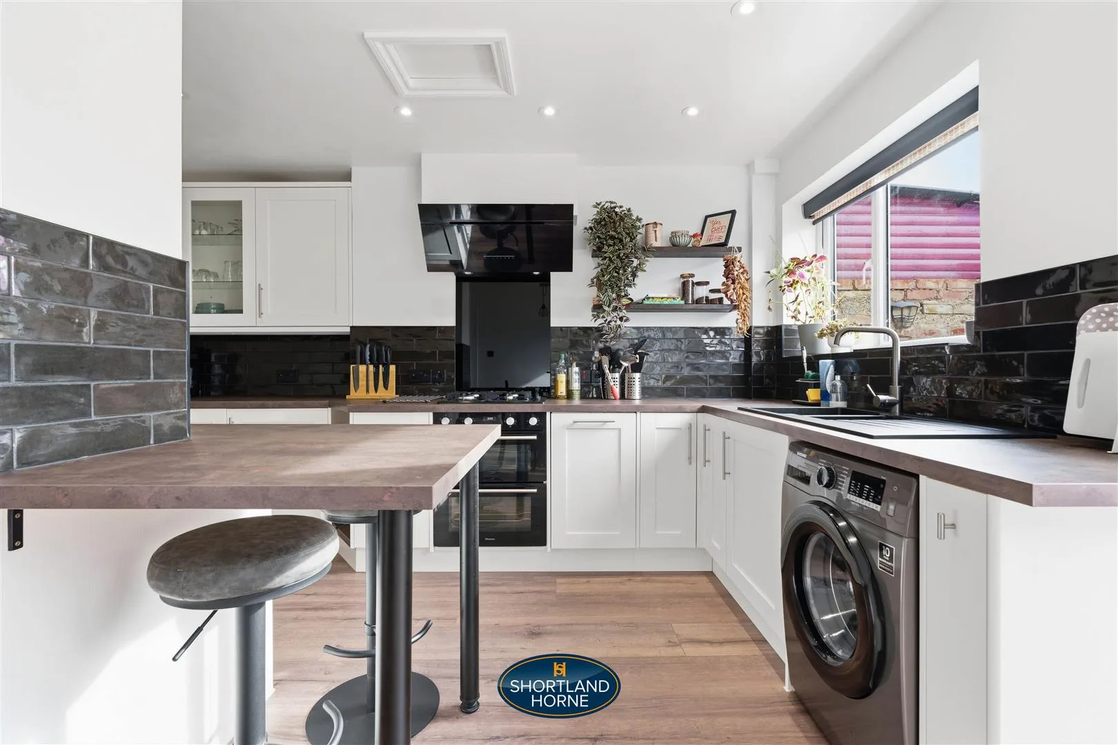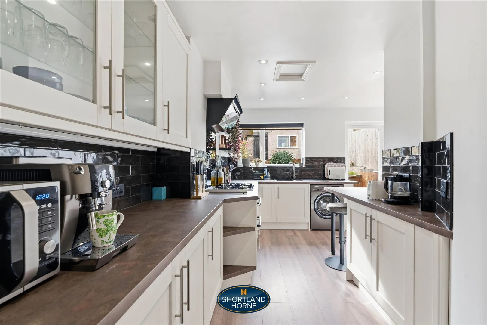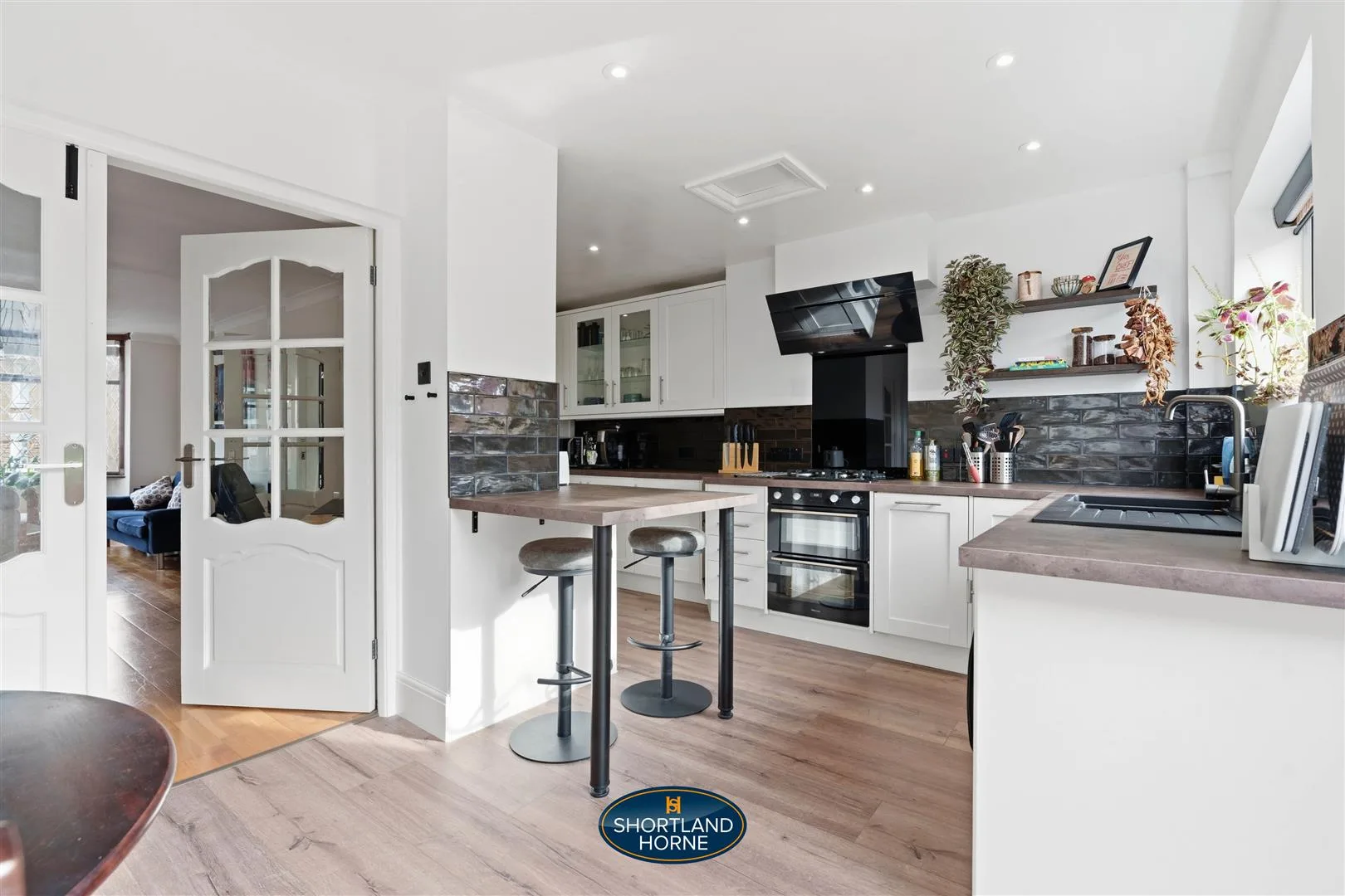 Step through the porch and into a hallway that guides you into the heart of the home, where the lounge stretches generously, awash with natural light from a curved bay window. The gas fire with marble surround adds a touch of elegance, yet the room feels effortlessly welcoming, ready for family evenings, weekend movie marathons, or curling up with a book while the world carries on outside. Double doors open to the kitchen and dining room, a space made for action and togetherness. The L-shaped kitchen, fitted in 2025, features sleek white shaker cabinets, a black metro tile splashback, integrated oven, gas hob, and dishwasher, while the small breakfast bar is perfect for quick morning fuel. By the French doors, the dining area spills onto a private garden where summer evenings, barbecues, or playful afternoons unfold naturally.