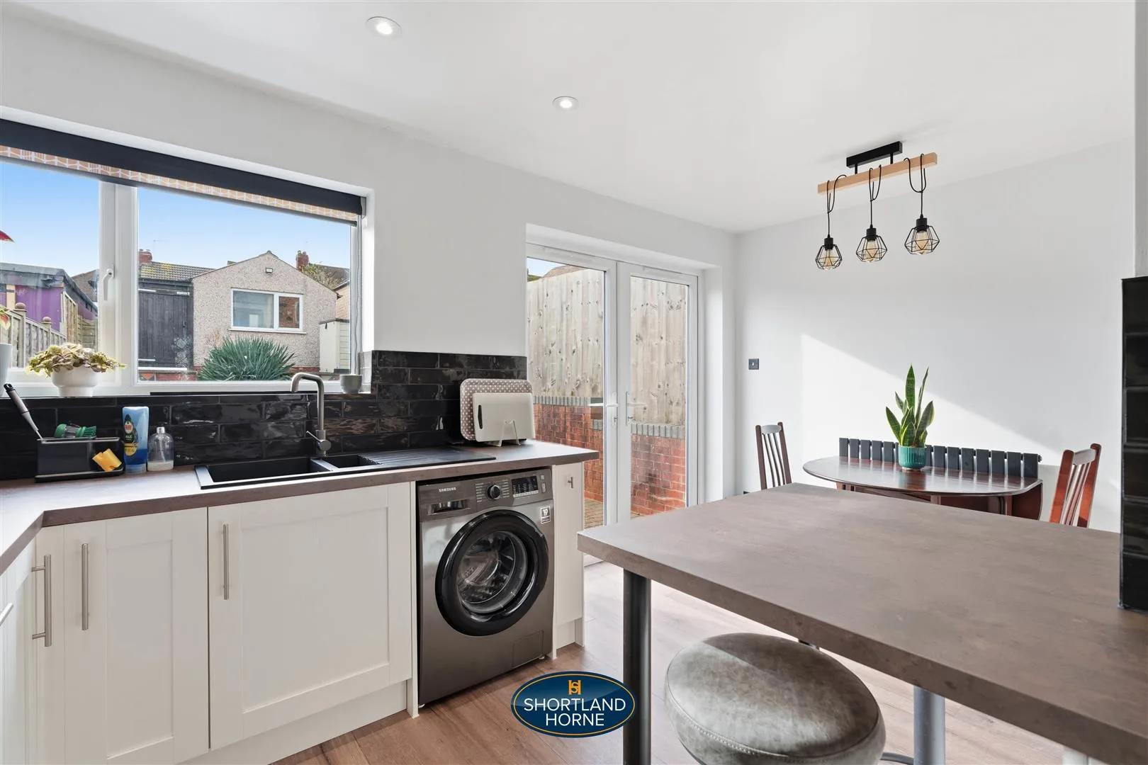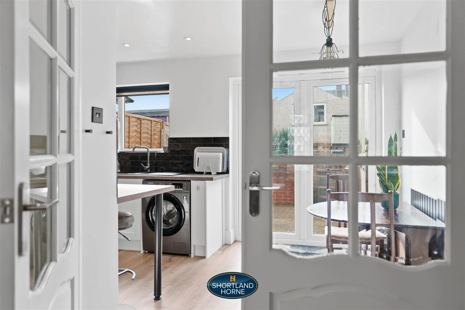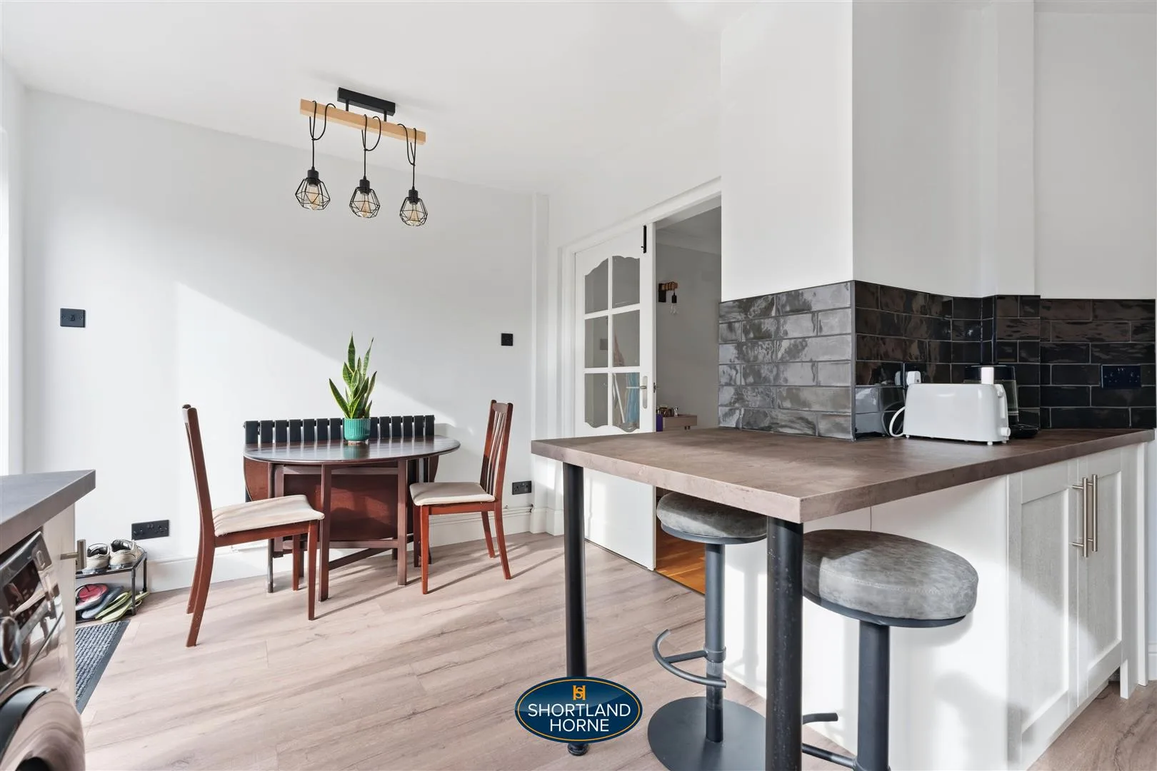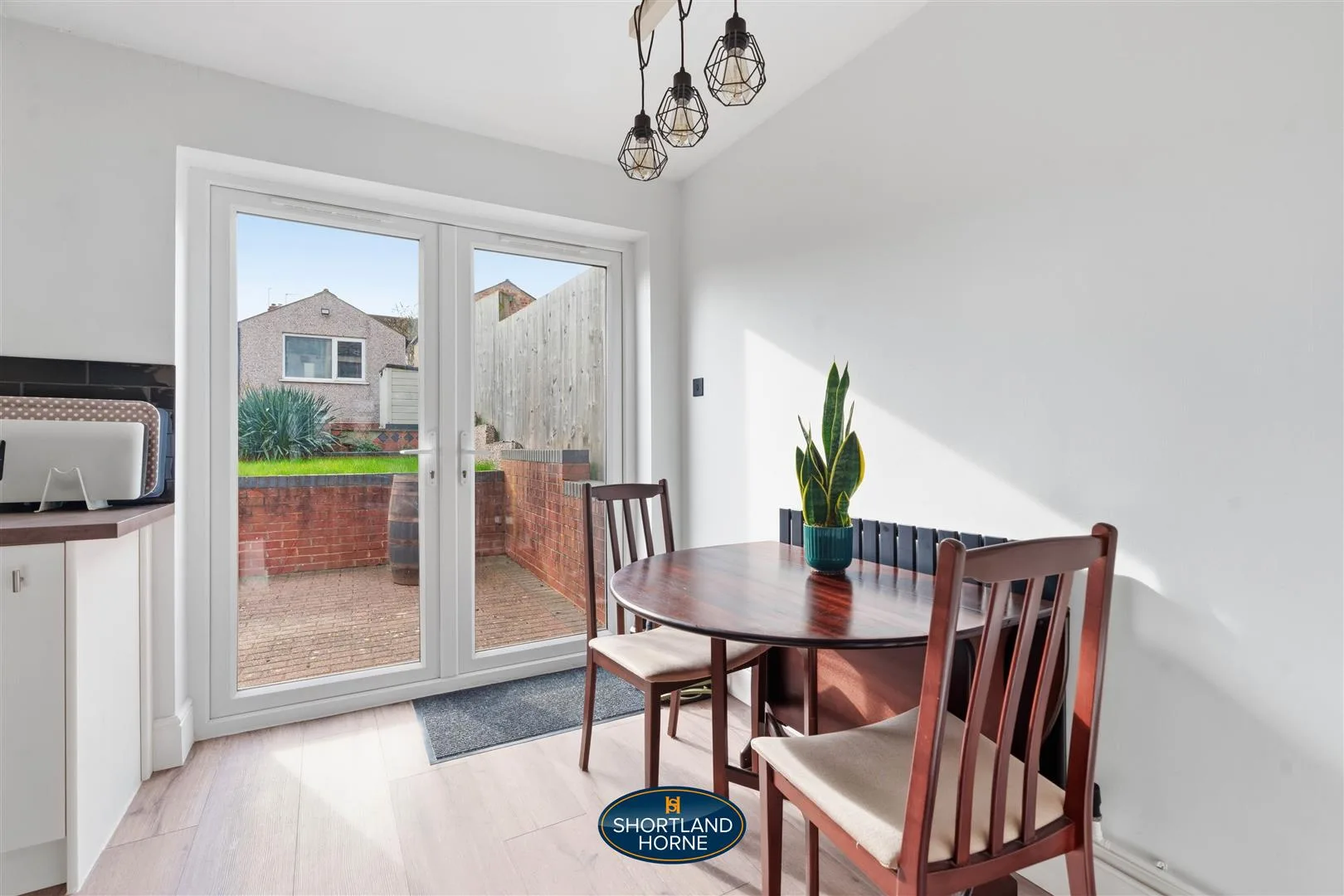 Step through the porch and into a hallway that guides you into the heart of the home, where the lounge stretches generously, awash with natural light from a curved bay window. The gas fire with marble surround adds a touch of elegance, yet the room feels effortlessly welcoming, ready for family evenings, weekend movie marathons, or curling up with a book while the world carries on outside. Double doors open to the kitchen and dining room, a space made for action and togetherness. The L-shaped kitchen, fitted in 2025, features sleek white shaker cabinets, a black metro tile splashback, integrated oven, gas hob, and dishwasher, while the small breakfast bar is perfect for quick morning fuel. By the French doors, the dining area spills onto a private garden where summer evenings, barbecues, or playful afternoons unfold naturally.