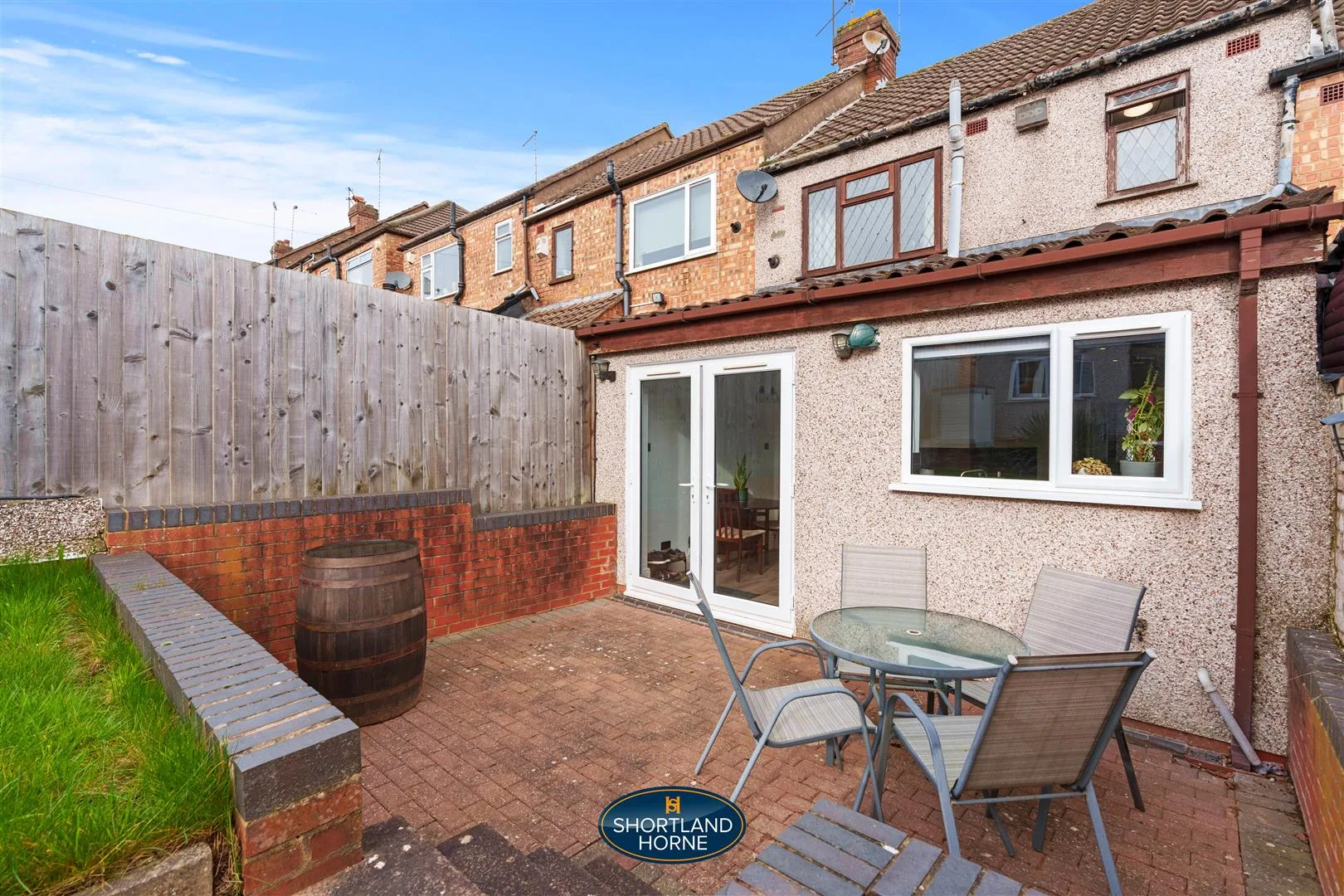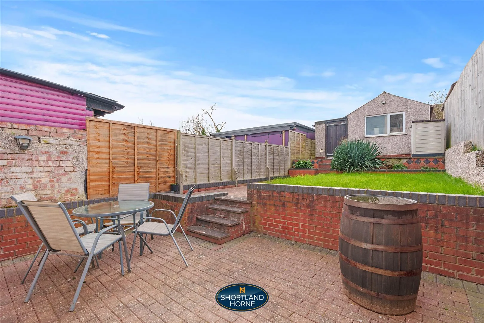 Outside, the private rear garden begins with a block-paved patio that steps up to a lawn edged with flower beds, a perfect mix of style and function. Beyond sits a large brick garage with lights and sockets, accessed via a rear alley, while the driveway at the front adds convenience without losing charm.