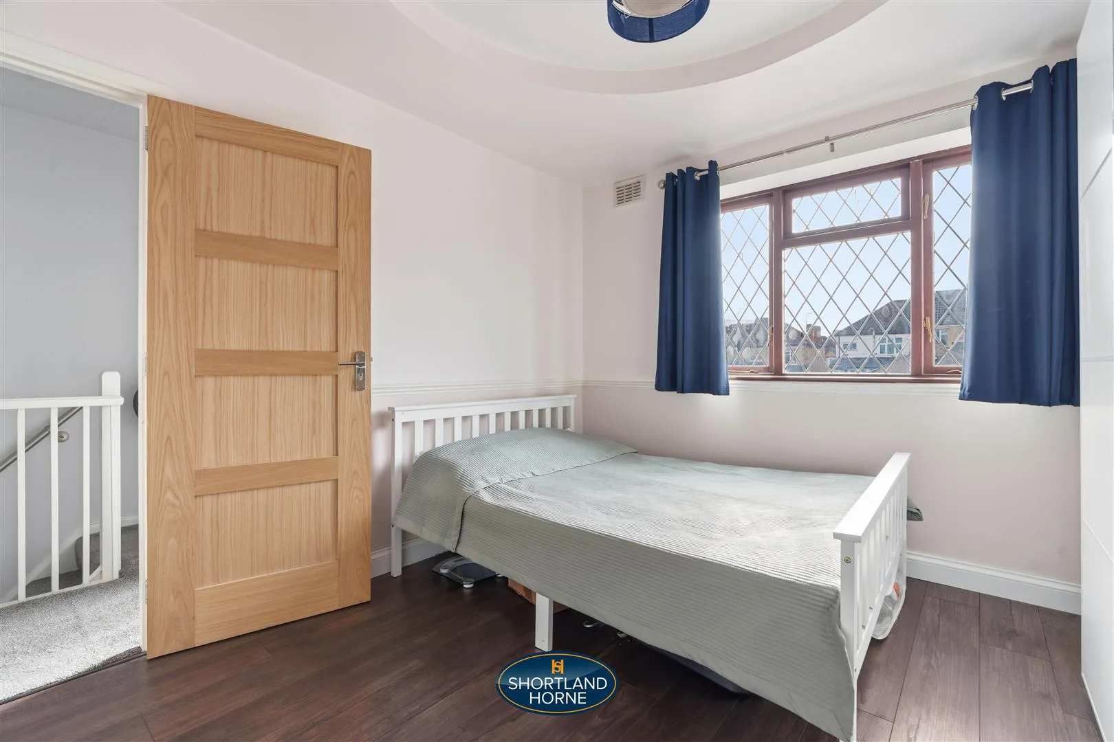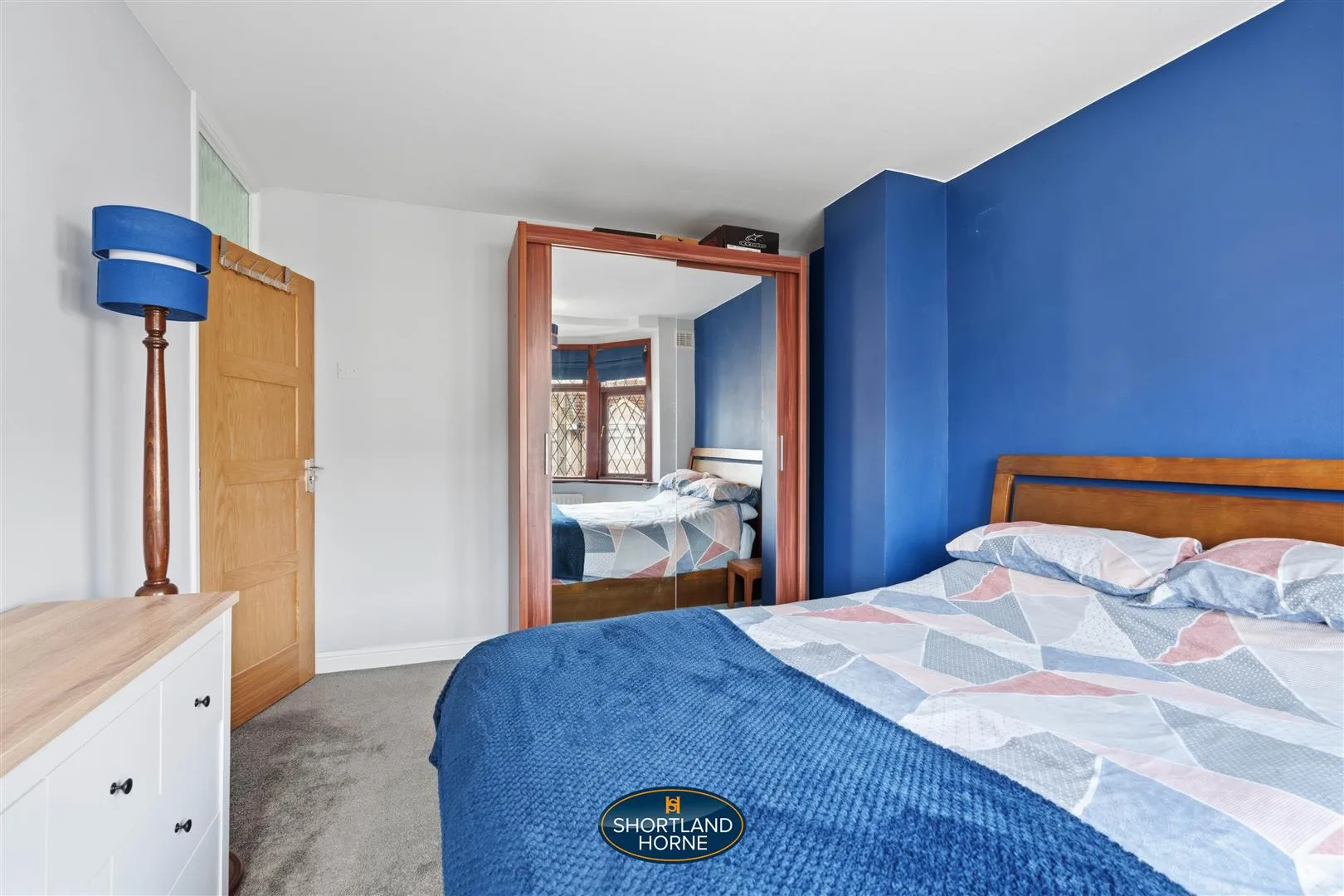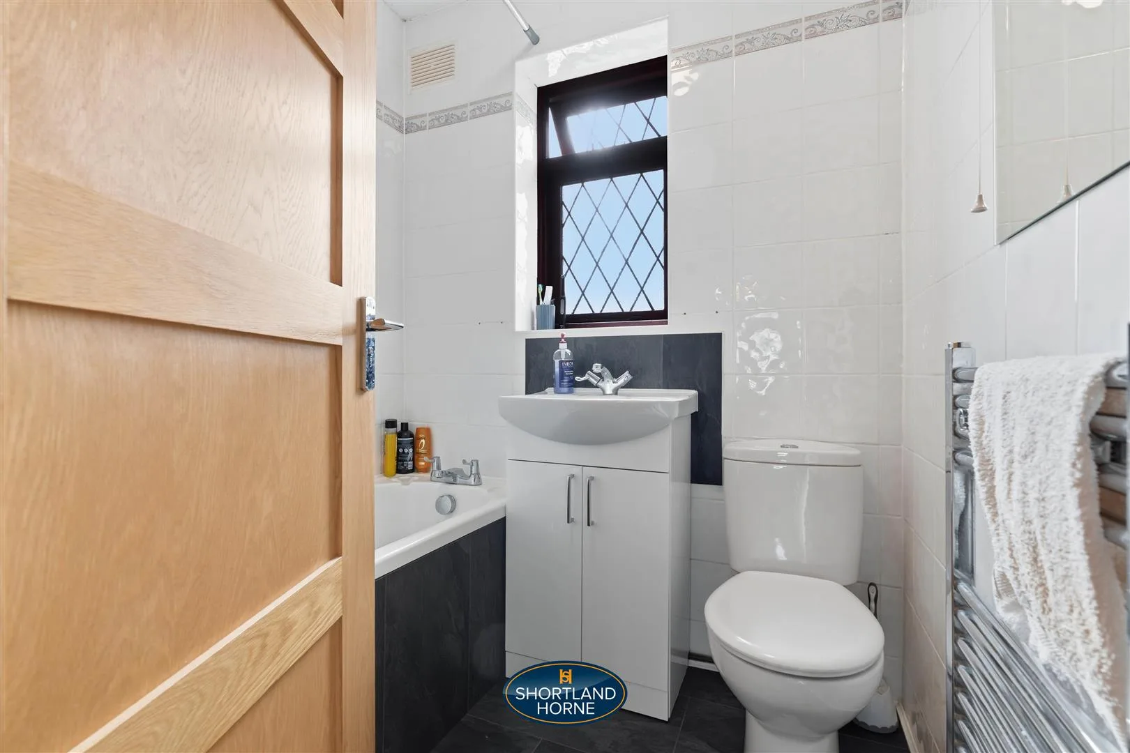 Upstairs, carpeted stairs lead to three bedrooms and a fresh family bathroom. The principal bedroom, with its own bay window, is a bright and airy retreat. The second double bedroom looks out over the rear garden, ready to host restful nights or creative play. The third bedroom is a flexible space, ideal as a nursery, home office, or quiet hideaway. The family bathroom, with its white three-piece suite and shower over the bath, is practical, clean, and inviting.