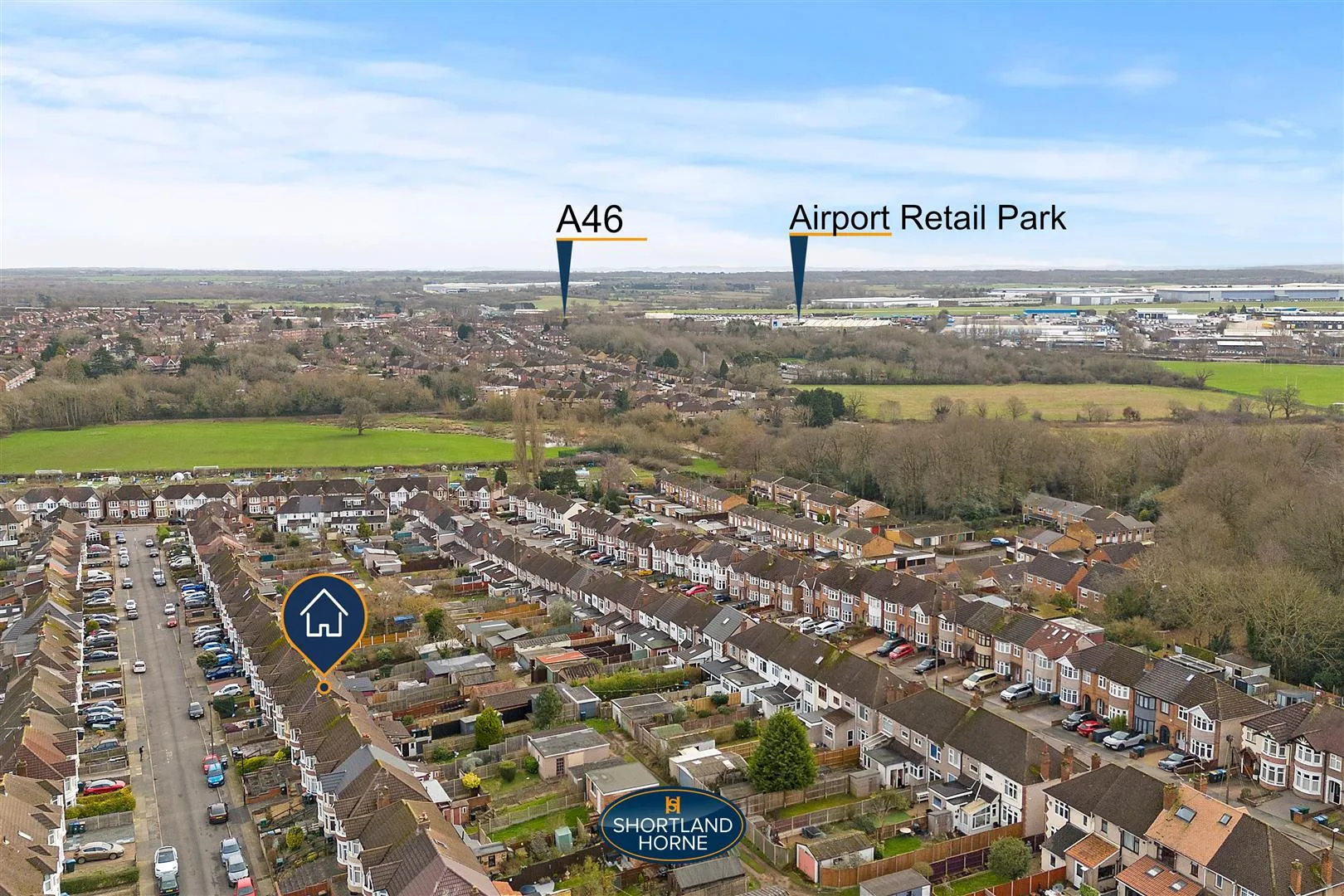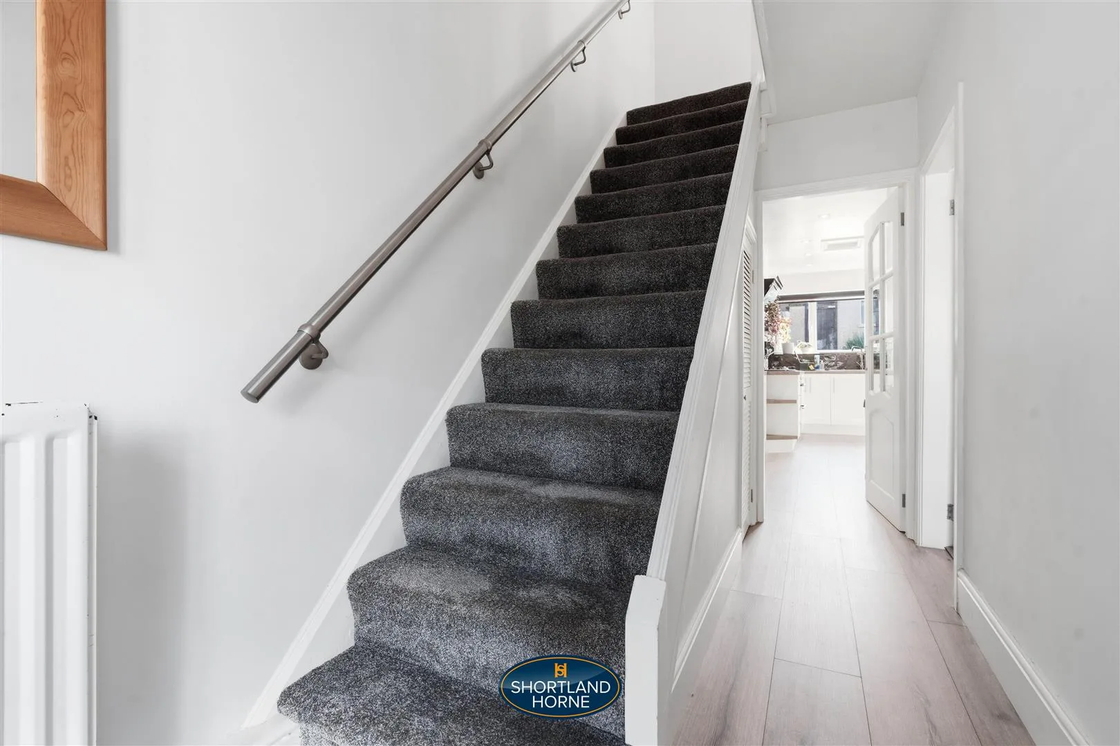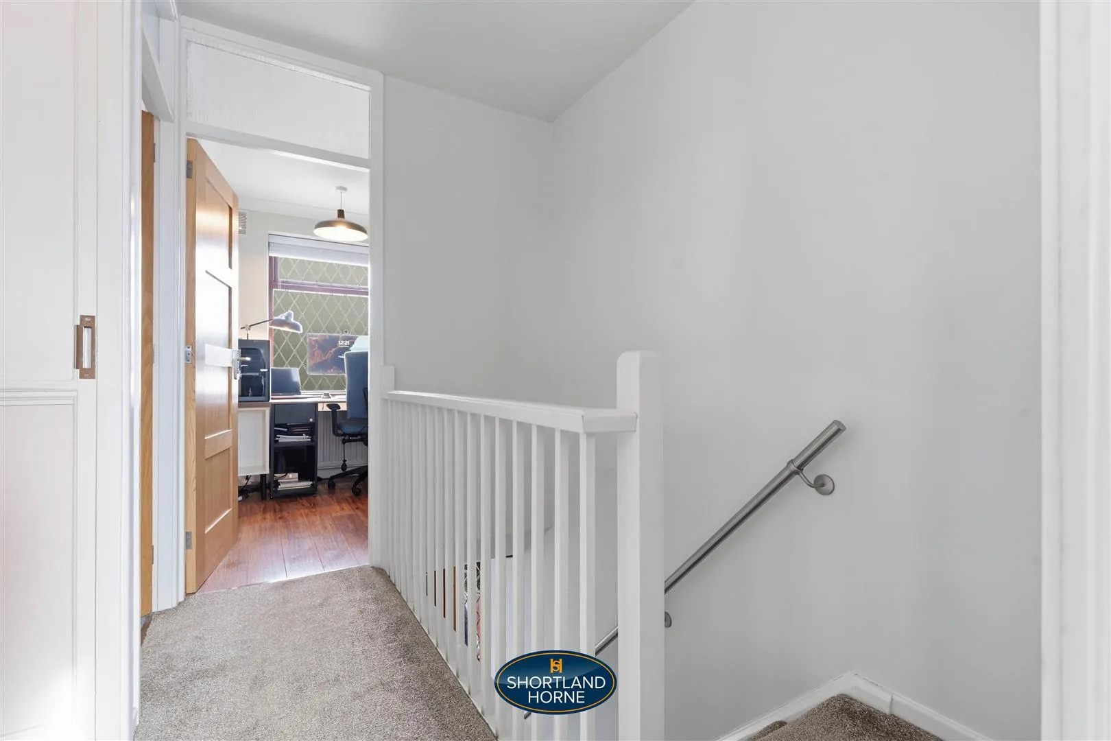 Upstairs, carpeted stairs lead to three bedrooms and a fresh family bathroom. The principal bedroom, with its own bay window, is a bright and airy retreat. The second double bedroom looks out over the rear garden, ready to host restful nights or creative play. The third bedroom is a flexible space, ideal as a nursery, home office, or quiet hideaway. The family bathroom, with its white three-piece suite and shower over the bath, is practical, clean, and inviting.