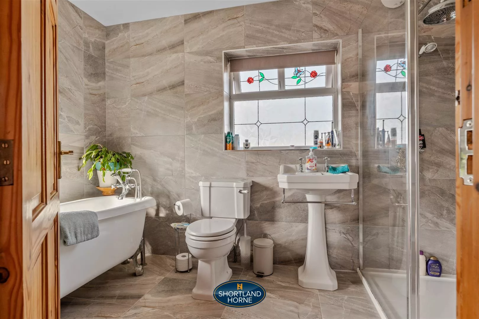 Upstairs, the first-floor landing leads to four well-proportioned bedrooms, two of which are generous double rooms complete with modern en-suite shower rooms. Each bedroom is tastefully finished and offers serene views over the gardens or surrounding countryside. The family bathroom exudes a sense of luxury, featuring a freestanding bathtub, walk-in shower, and elegant fittings, creating a calming retreat for relaxation.