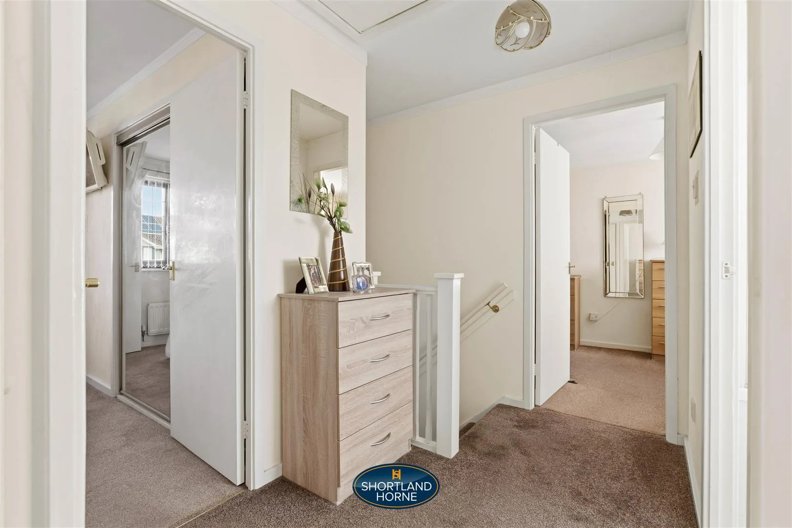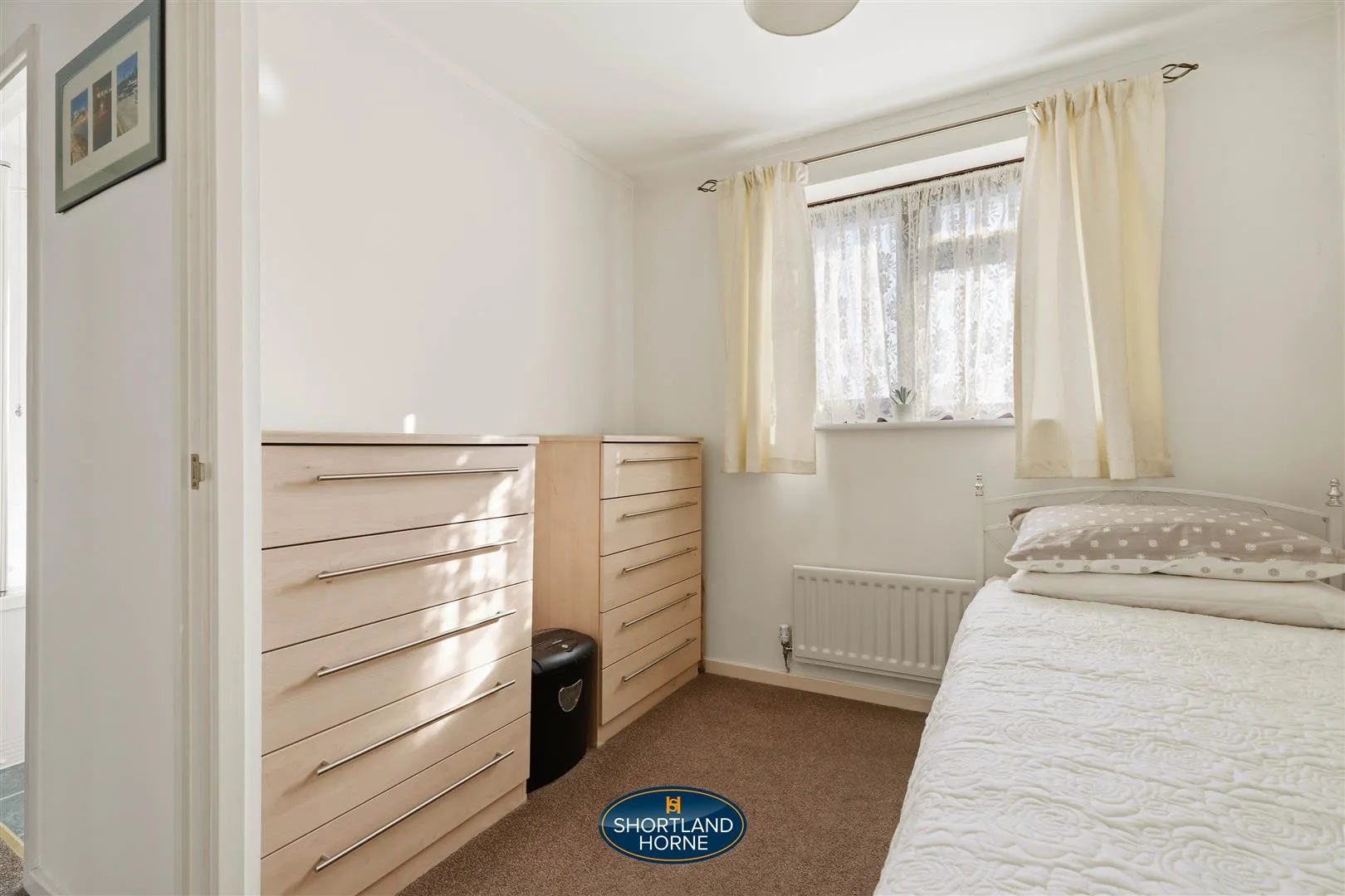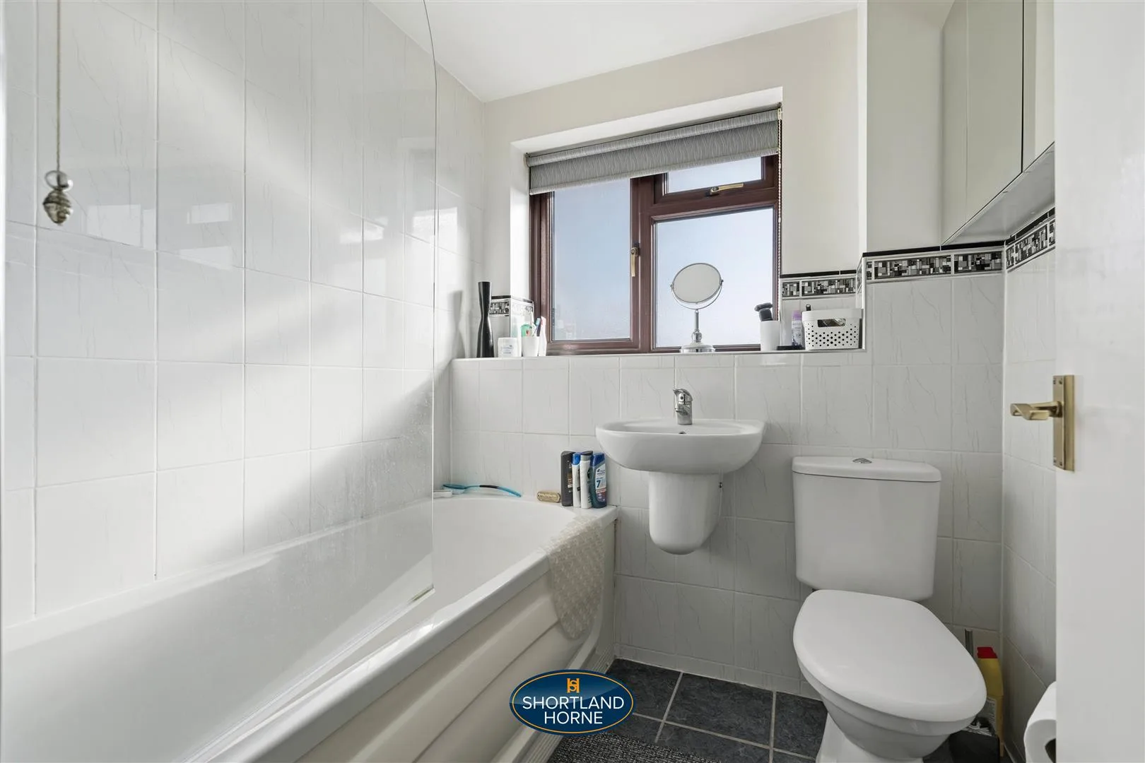 Upstairs, three restful bedrooms await, all carpeted for comfort. The principal bedroom is a private retreat with space for a double bed, wardrobe, and its own en-suite shower room. The second bedroom is a good-sized double with built-in storage, while the third stretches over the garage, offering surprising versatility for a home office, guest room, or cosy hideaway. The family bathroom is fresh and inviting, with crisp tiles, a white three-piece suite, and a shower over the bath, balancing style and functionality effortlessly.