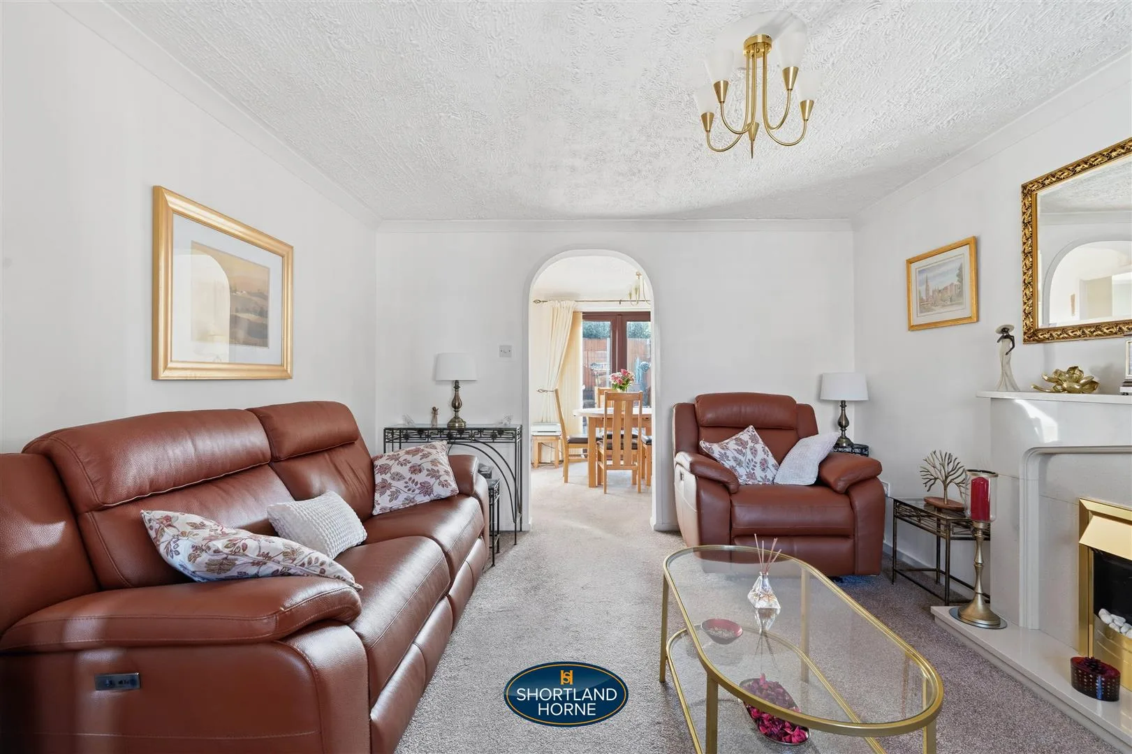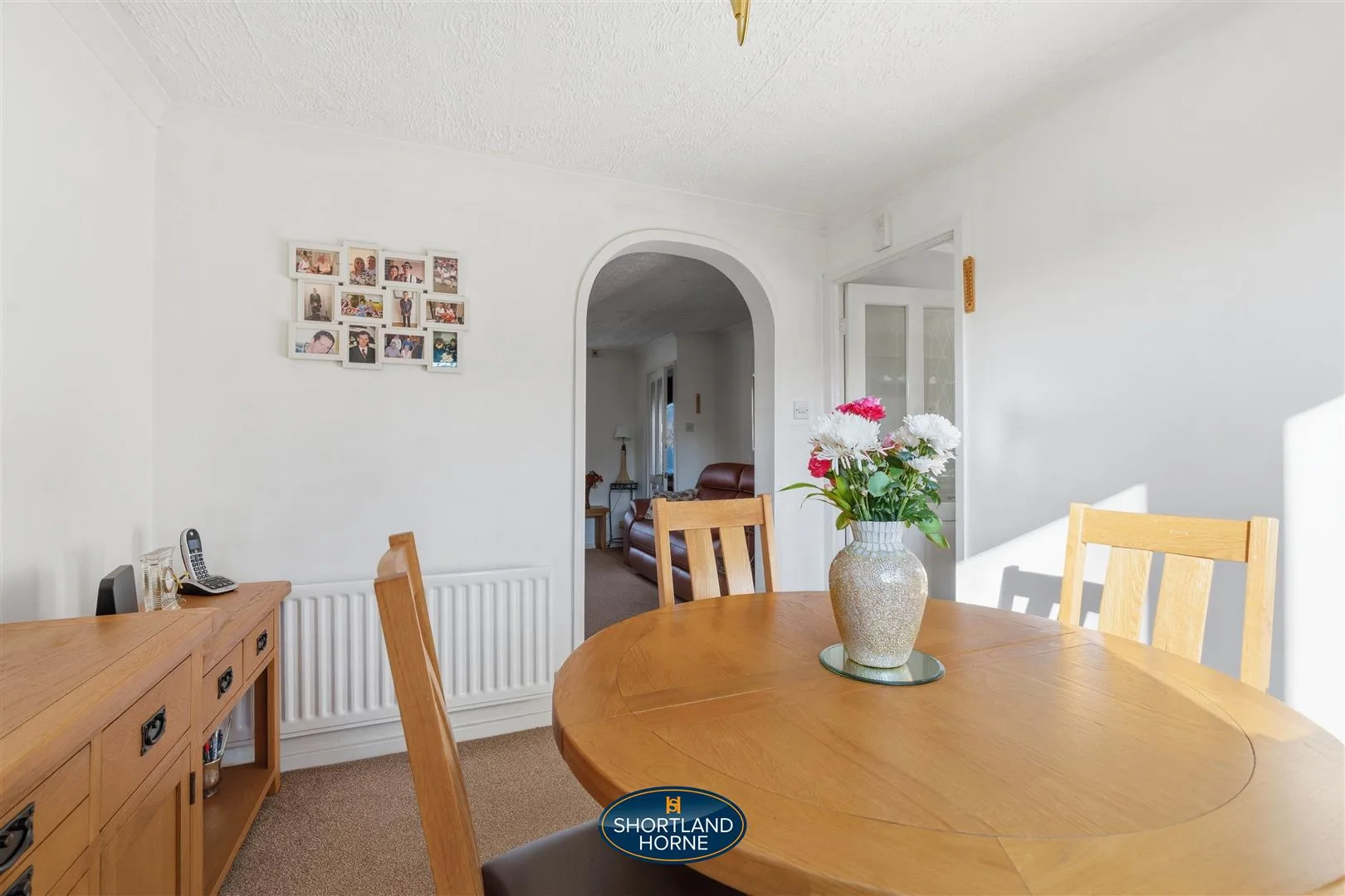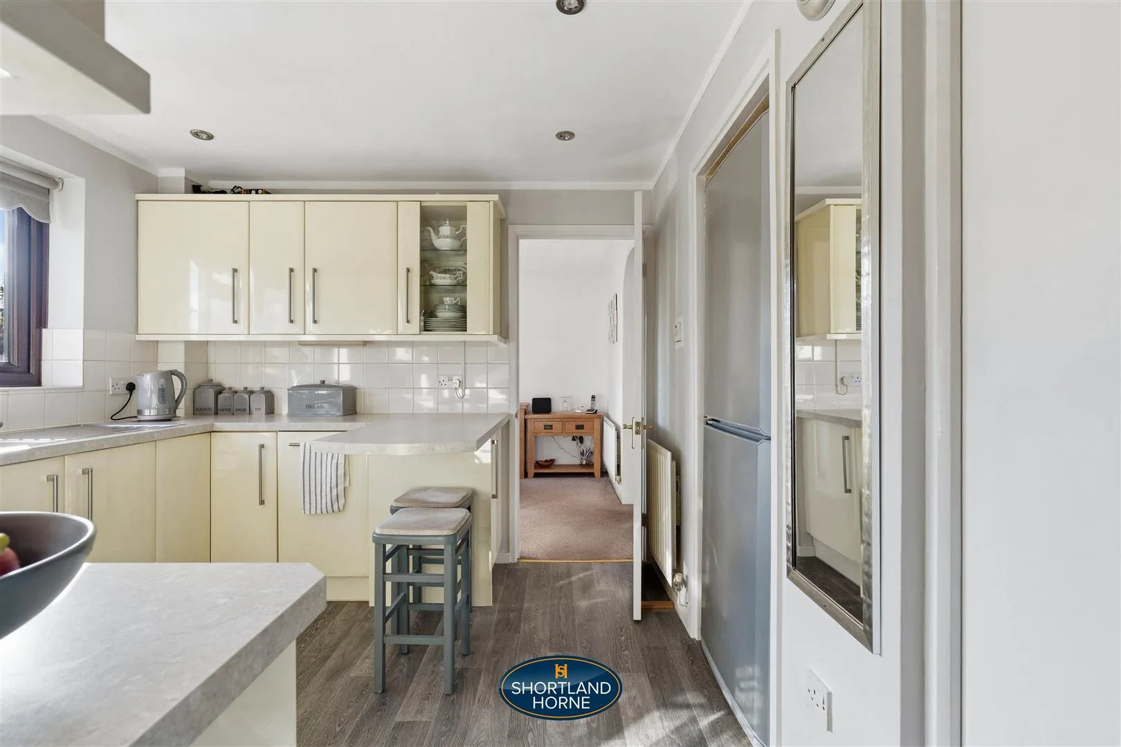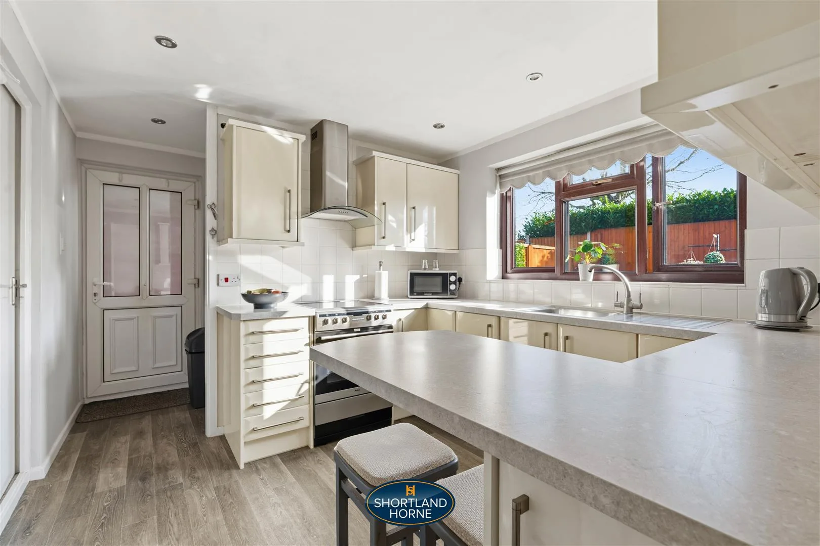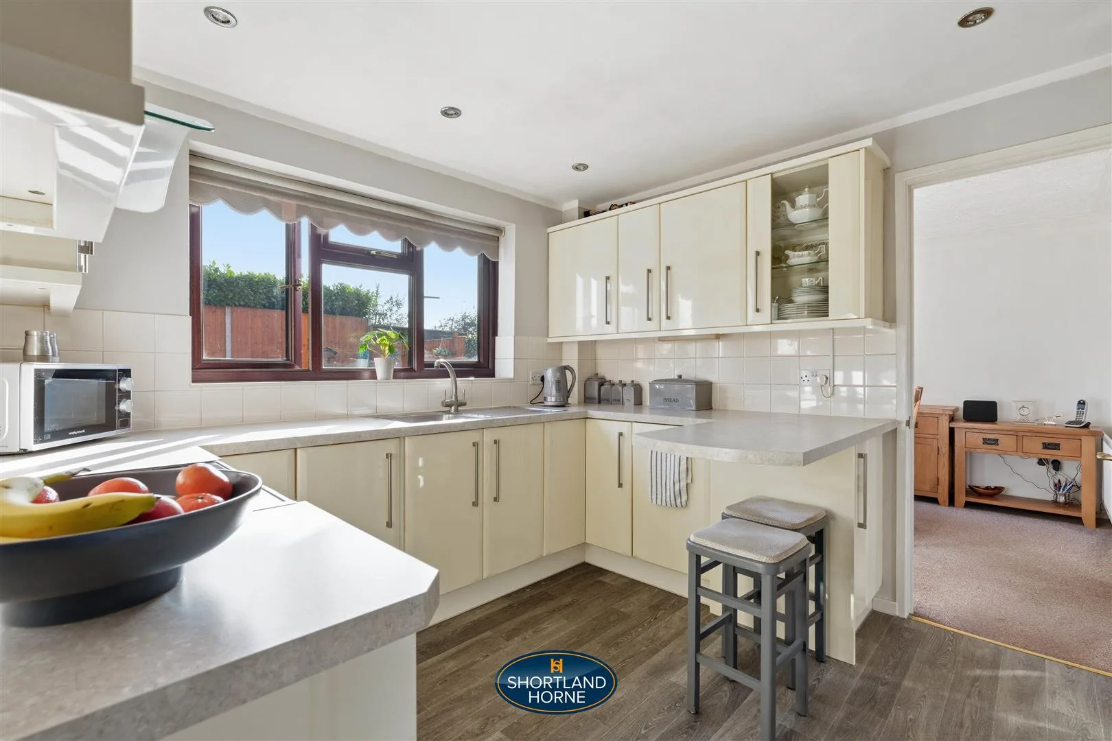 Inside, sunlight spills through the square bay window of the lounge, bouncing off soft neutral walls and drawing you in with a sense of calm and comfort. It’s a space that invites you to relax, linger with a cup of coffee, or host friends without ever feeling crowded. Step through to the dining room, where French doors open onto the south-facing garden, filling the room with golden afternoon light and a gentle breeze. Beyond lies the modern kitchen, designed for both style and practicality with light-coloured units, a small breakfast bar, inset spotlights, and integrated appliances. A window above the sink frames a serene view of the garden, turning everyday tasks into moments of quiet joy. A convenient WC off the kitchen and direct access to the integral garage keep daily life flowing smoothly.