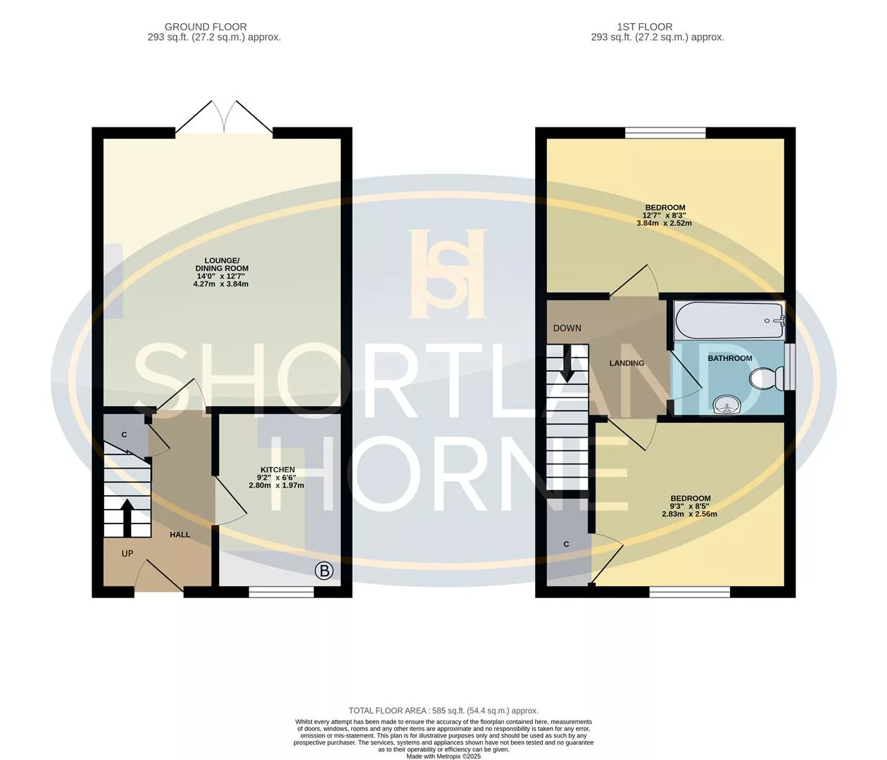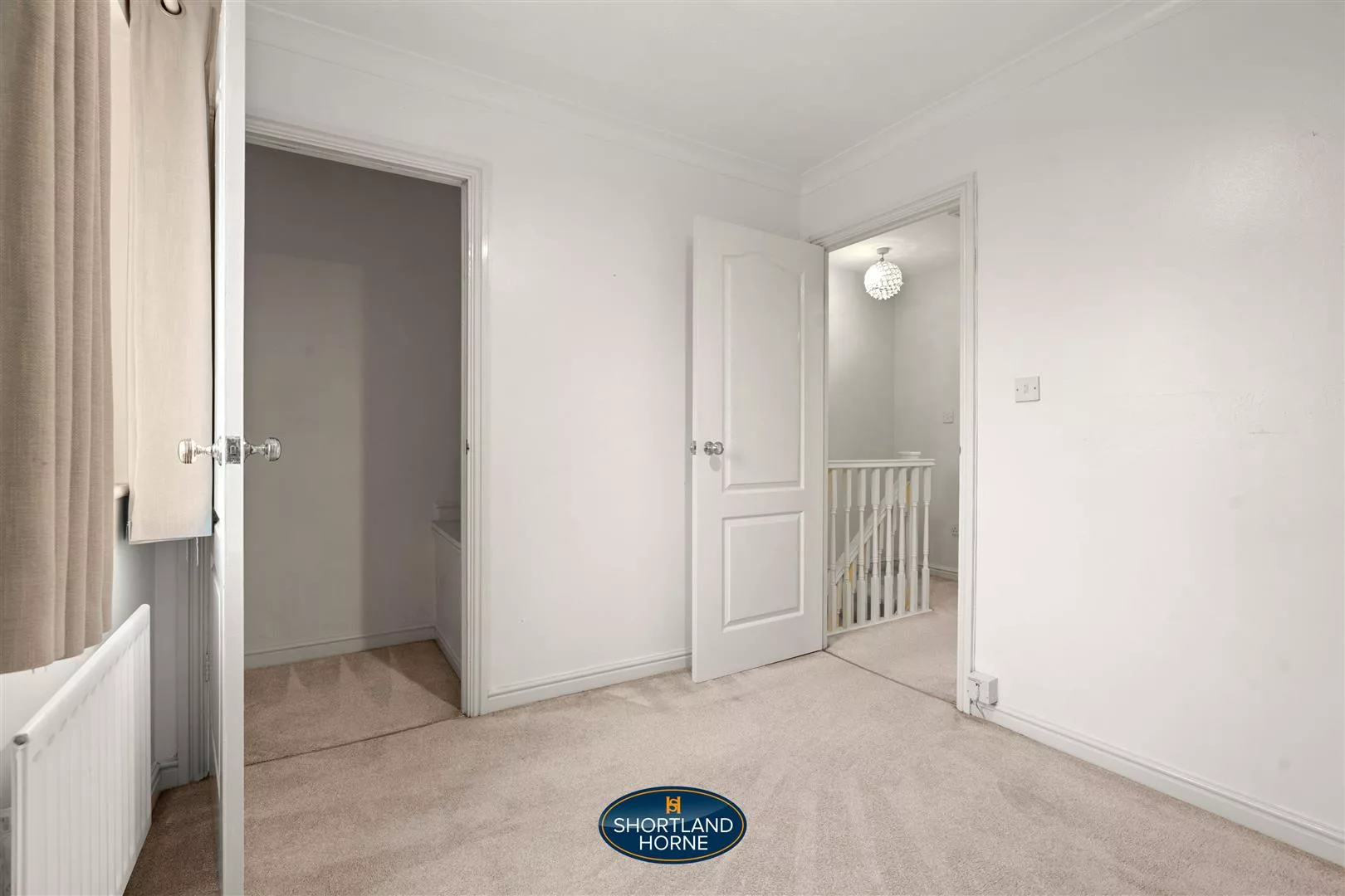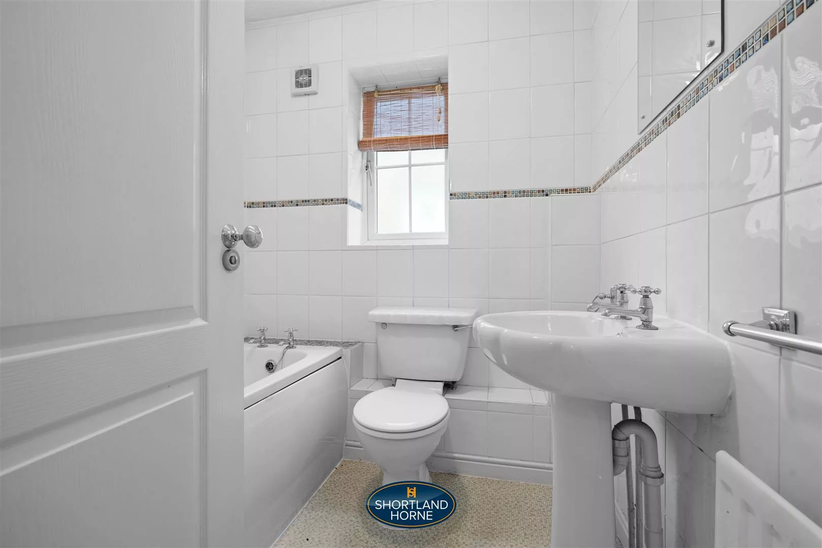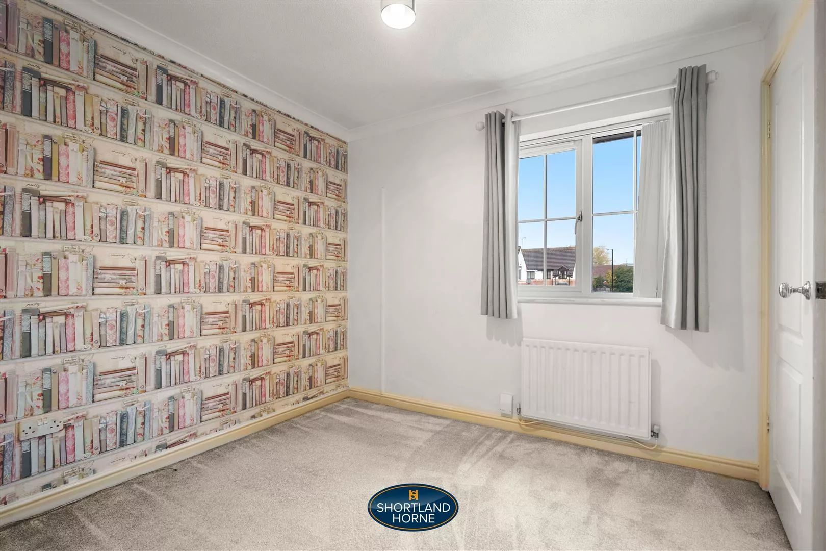 Ascending the carpeted staircase, the first-floor landing leads to two well-proportioned bedrooms. The main bedroom spans the full width of the property at the rear, offering space for a large bed and additional furniture, bathed in natural light from the south-facing aspect. The second bedroom, also a generous double at the front, benefits from a handy storage cupboard, providing flexibility for use as a guest room, home office, or child’s bedroom. The bathroom has been thoughtfully maintained, presenting a clean and fresh environment with fully tiled walls, a white three-piece suite, and a new shower over the bath, catering perfectly to modern family needs.