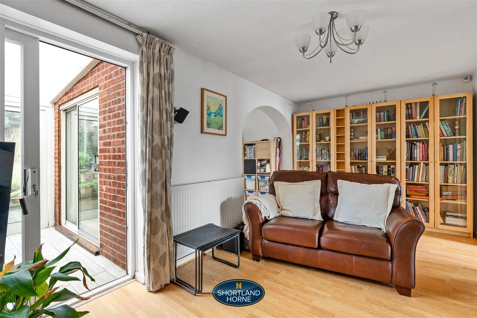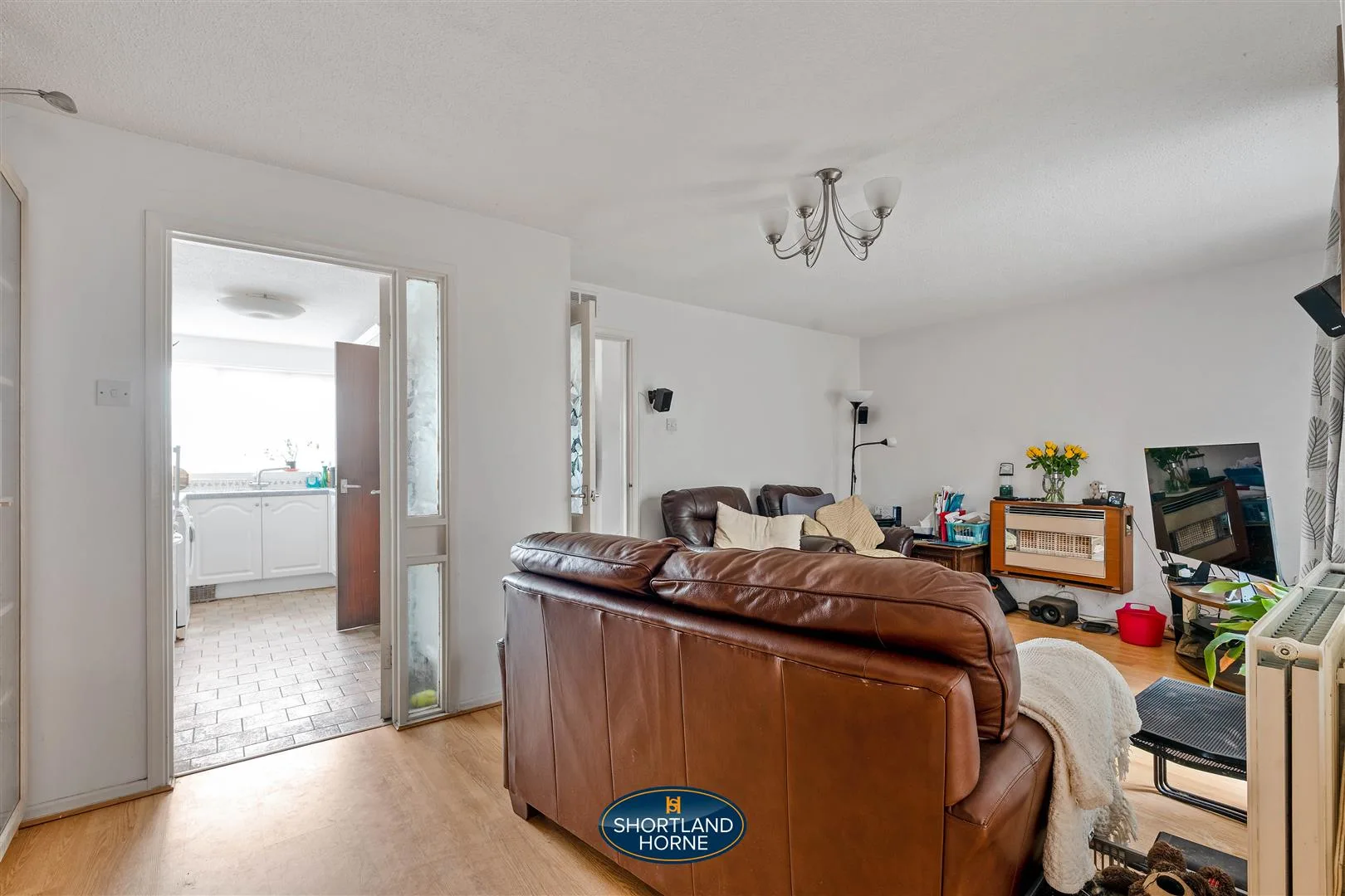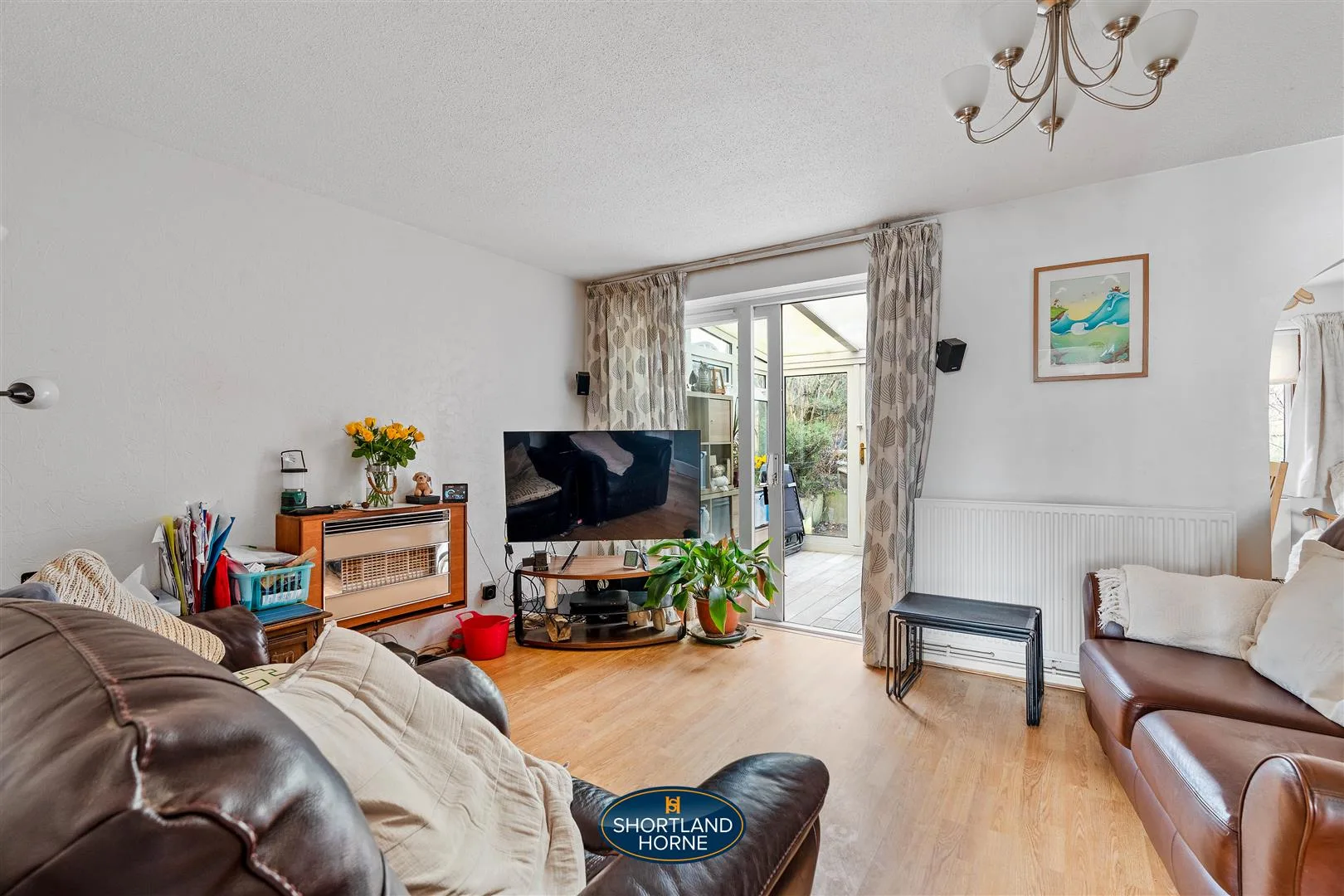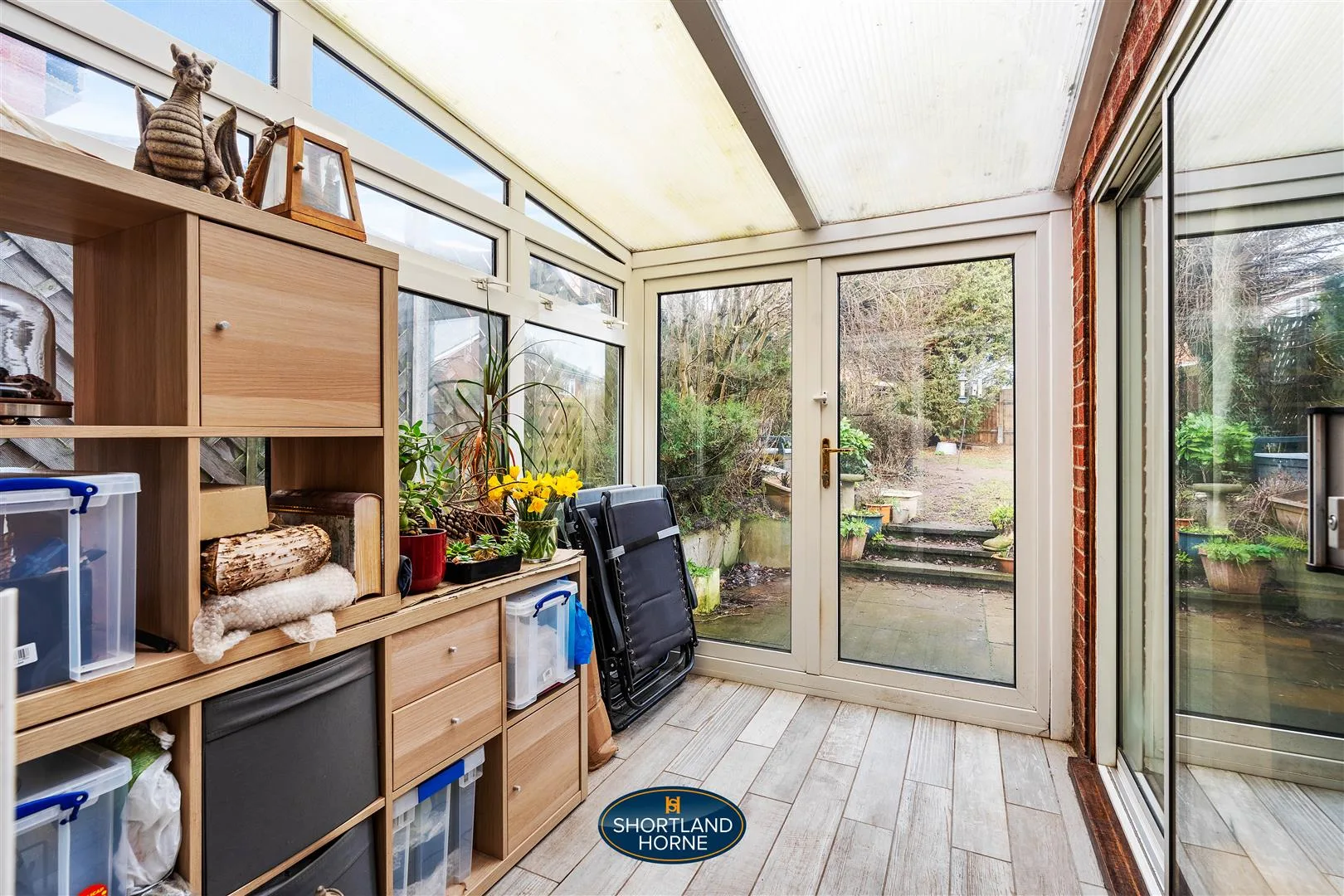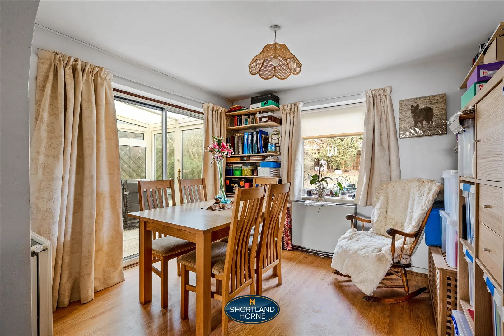 The lounge is a light and relaxing space, decorated in neutral white tones with practical laminate flooring underfoot, creating a versatile environment for both quiet evenings and entertaining guests. The room flows seamlessly into the extended dining area, forming a sociable and flexible living space ideal for family gatherings and mealtimes. Sliding doors from the lounge draw in natural light and open directly into the conservatory, a delightful spot to enjoy views of the garden throughout the seasons, whether it’s morning coffee in the sunshine or unwinding at the end of the day while overlooking the greenery beyond.