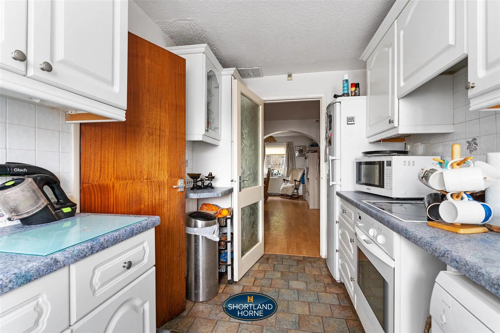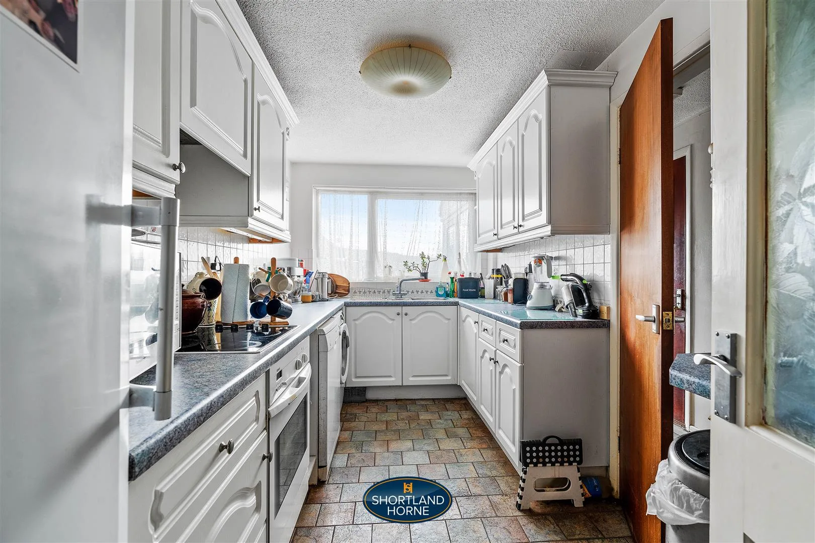 The kitchen is arranged in a functional galley style, fitted with classic shaker-style units, tiled flooring and a built-in oven with electric hob. There is ample space for essential appliances including a fridge freezer, washing machine and dishwasher, ensuring the space is both practical and efficient for everyday living.